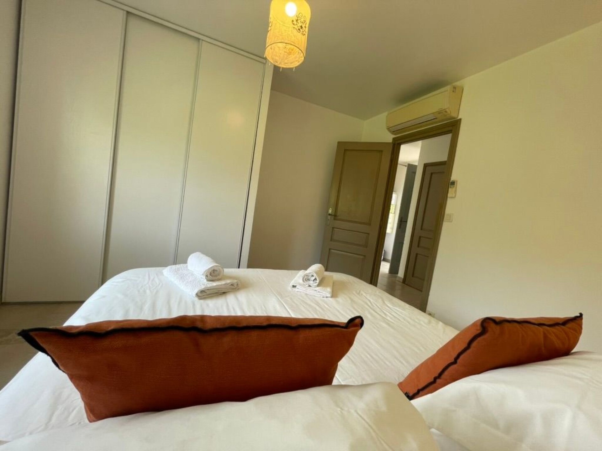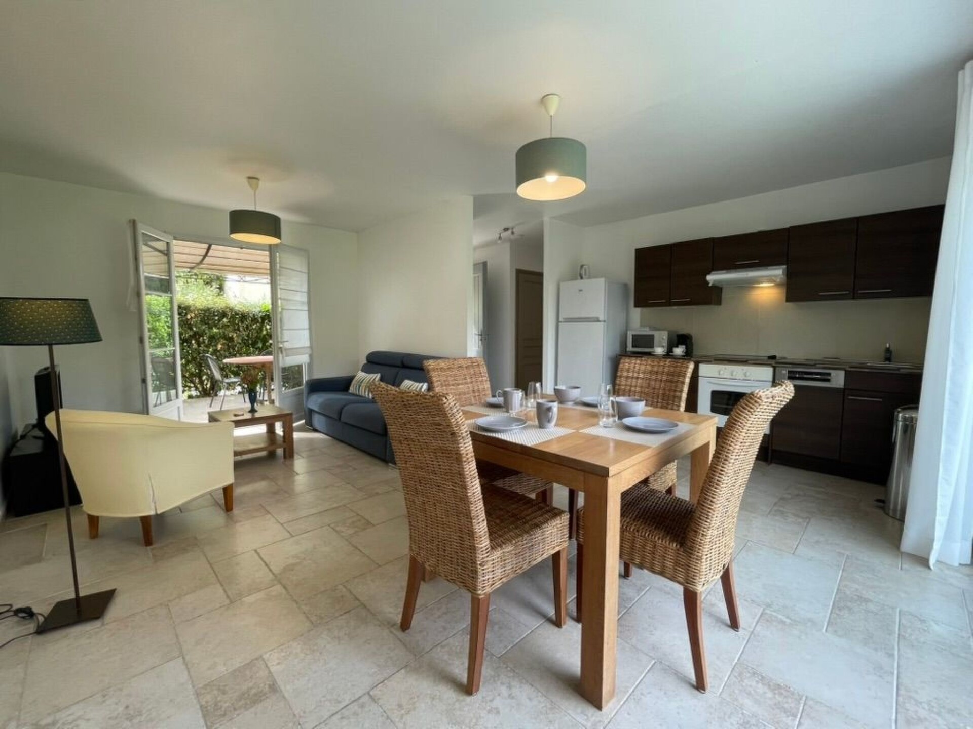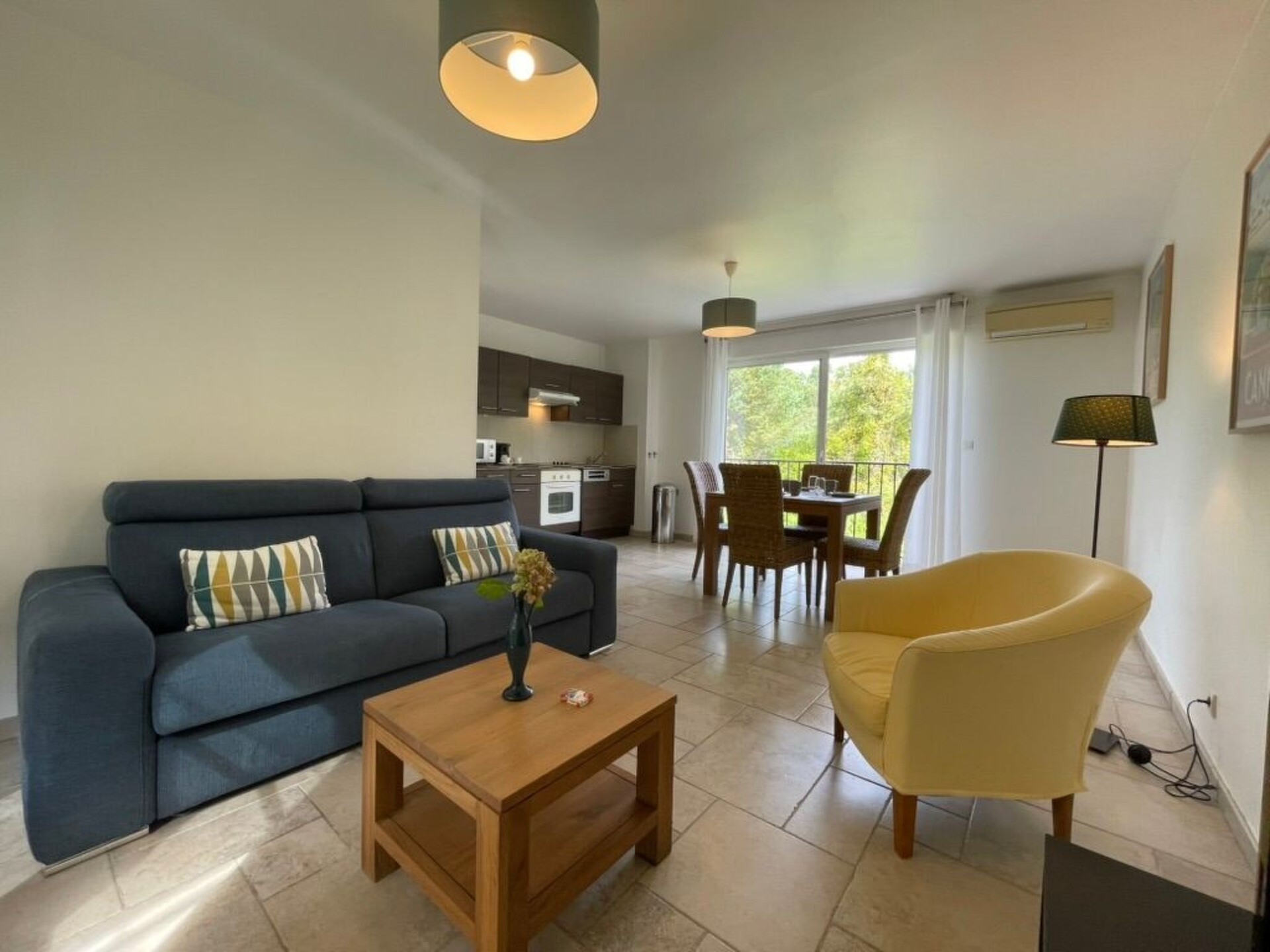 Fully equipped, air-conditioned 50m2 flat with private garden and terrace, SWIMMING POOLThe bedroom has a double bed (160*200) and a wardrobe. The sofa bed can sleep 2 people (160*200).The living room, dining room and kitchen create a spacious living area of around 27 m², which opens out onto the pine forest. The dining room is equipped with a 100 x 100 oak table and 4 chairs.the flat faces north-south and offers a view of the pine forest and a slope of Mediterranean plants. Each flat has been carefully decorated and equipped with LCD TV, reversible air conditioning, DVD player, Wi-Fi internet access, dishwasher, fridge, freezer, oven and 4-burner hob.Additional services:Each flat has a parking space, household linen (bed linen and towels) and access to a shared laundry room (washing machine, tumble dryer, iron and ironing board).WC and bathroom are separate. The bathroom has a bath. 53018552900019