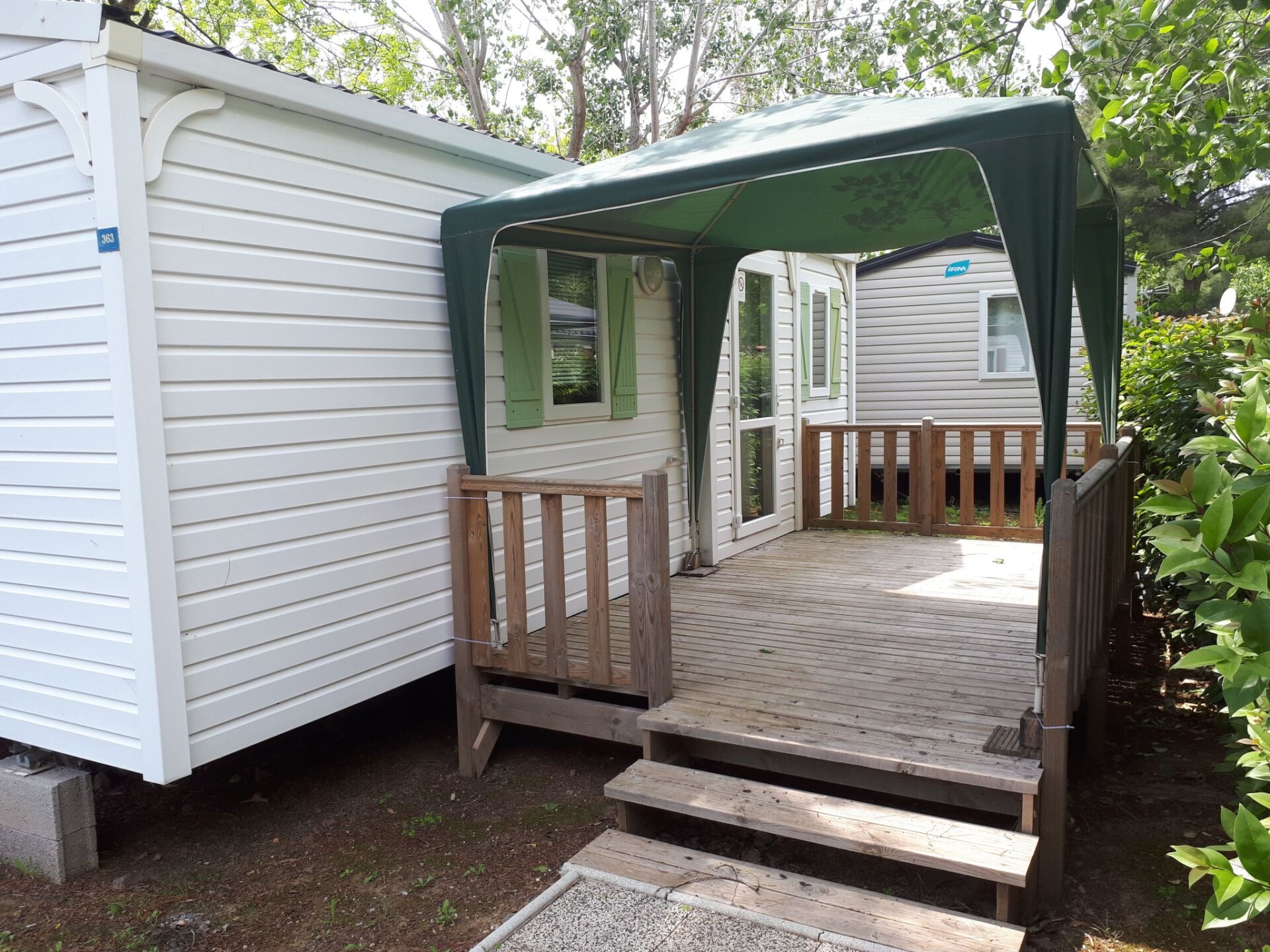 Mobilhome IRM 29 m2, airconditioning. 2 slaapkamers geschikt voor 4-5 pers. 1 slaapkamer met 2-pers. bed en 1 slaapkamer met 2 1-pers. bedden. In living kan zithoek omgebouwd worden in een vijfde bed. houten terras met tuinset en partytent.