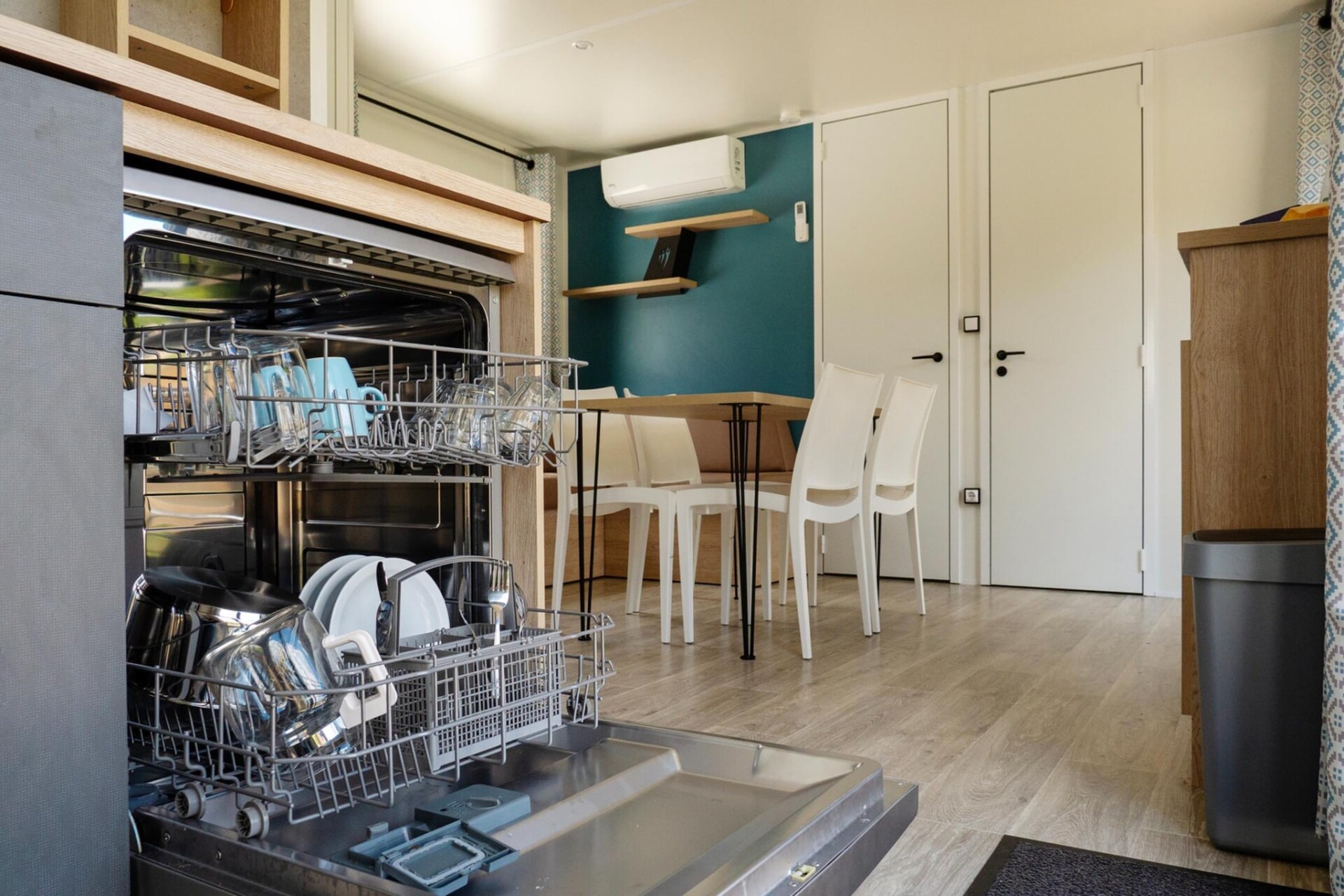 Binnen beschikt de accommodatie over een lichte, open indeling met een praktische kitchenette, een eethoek en een gezellige zithoek met tv. Het interieur is doordacht ingericht om het dagelijks leven gemakkelijk te maken - of u nu ontbijt klaarmaakt voordat u de omgeving verkent of tot rust komt na een actieve dag. De twee slaapkamers - met een tweepersoonsbed en twee eenpersoonsbedden - zorgen voor comfort en ontspanning na een dag vol activiteiten, en beschikken over een complete, moderne badkamer. Wifi en privéparkeergelegenheid zijn beschikbaar voor extra gemak.