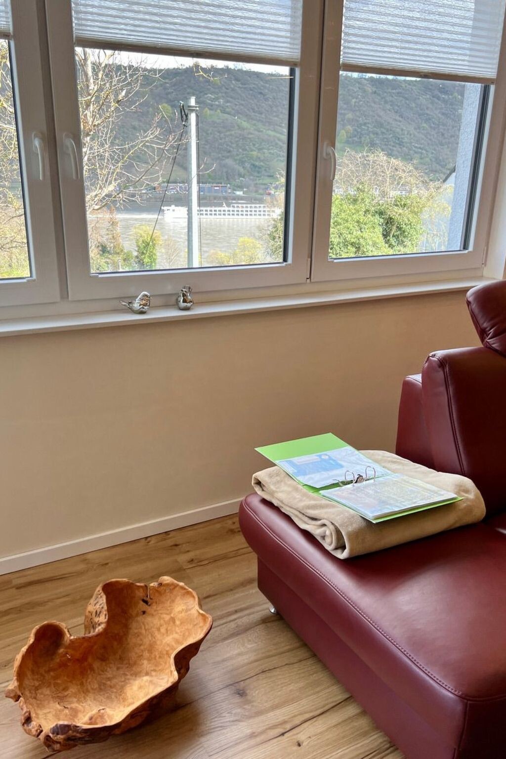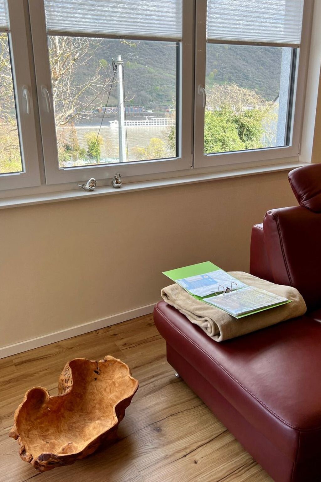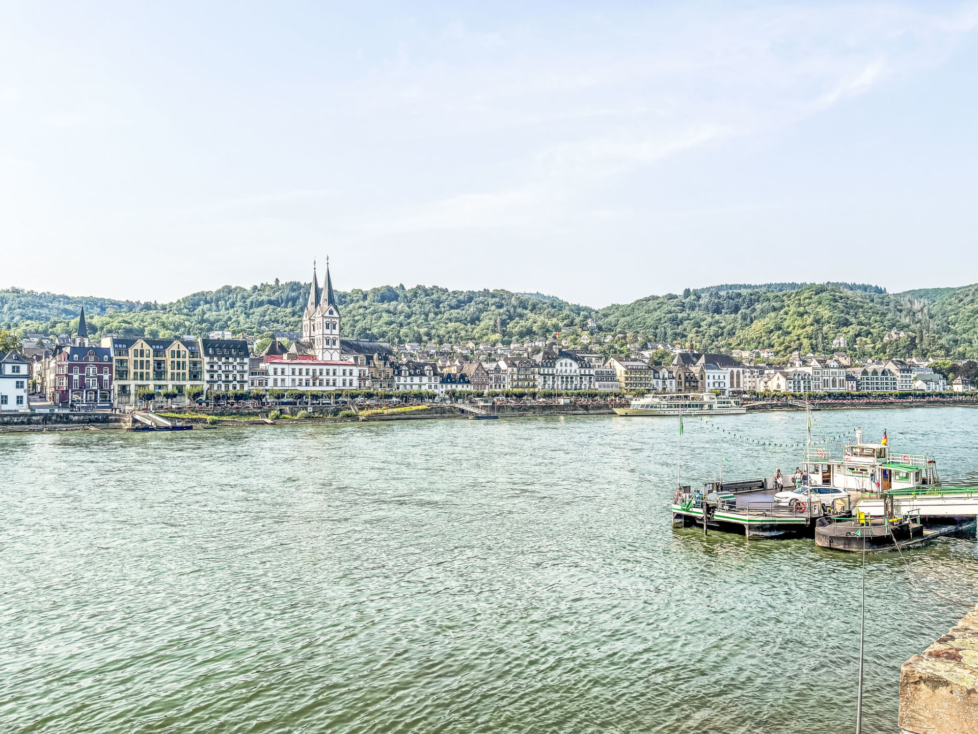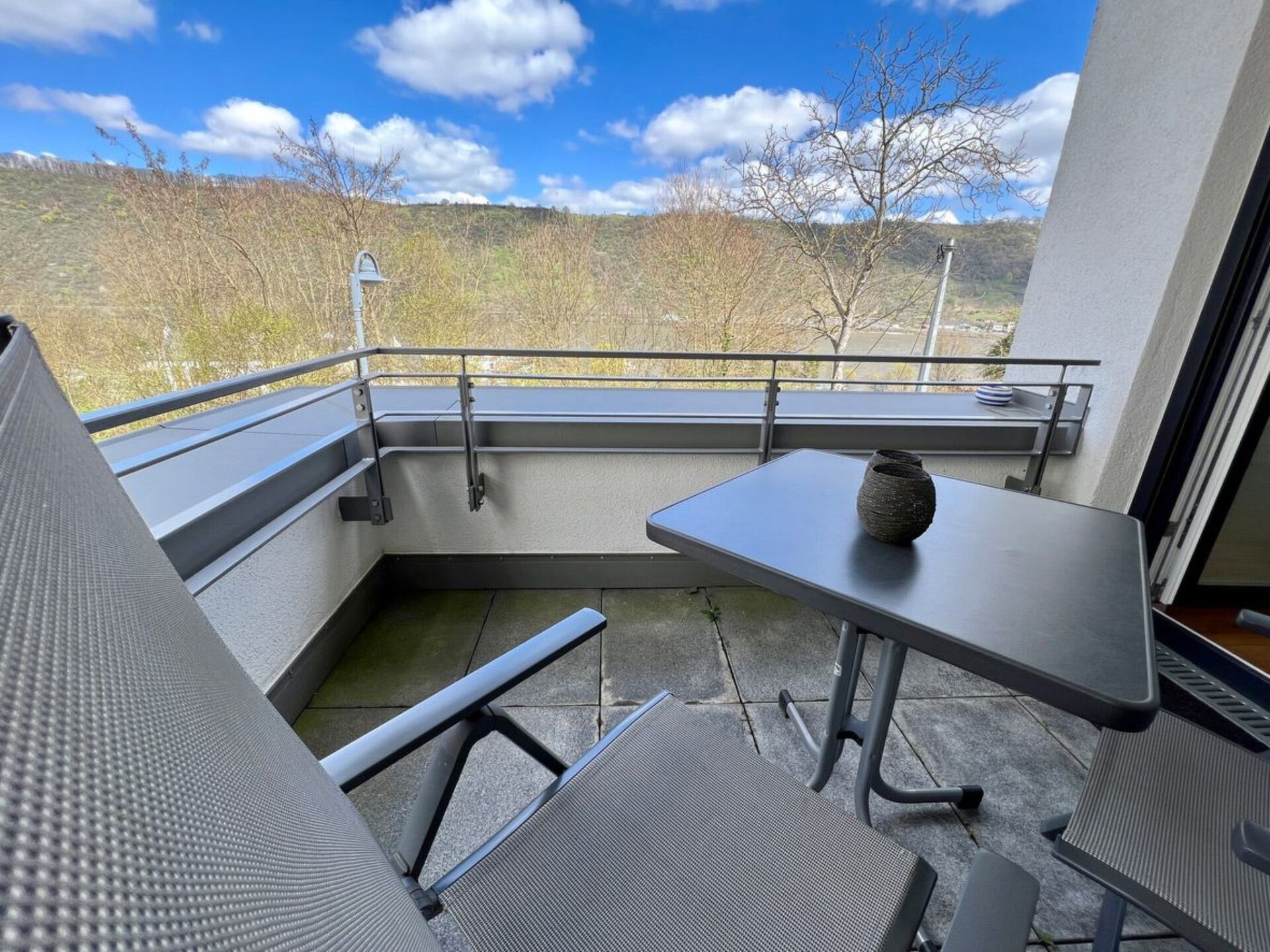 Are you dreaming of a holiday where you can completely relax and keep your distance? Then our 5-star holiday flat in Boppard in the heart of the UNESCO World Heritage Upper Middle Rhine Valley is just right for you. Check in is contactless via a combination lock on the letterbox. With the guest card of the town of Boppard you can use all public transport of the Rhine-Moselle transport network free of charge during your stay. We look forward to receiving your booking enquiry.Our 5-star holiday flat "Rheinwein" with a view of the Rhine is located in Boppard am Rhein, 5-10 minutes from the centre and the Rhine promenade. Your holiday home is on the 1st floor of a well-kept apartment building. You can reach the flat via an easily accessible staircase or the lift. You enter the flat via a front door, followed by an open-plan, modern living and dining area with a cloakroom and separate storage room. You have direct access from the dining area to the spacious balcony with a view of the Rhine. In the living area, a high-quality leather seating area invites you to relax. There is also a reclining armchair with function. With a soundbar and smart TV, you won't miss out on your usual luxury even on holiday. You can use our WLAN access to the Internet free of charge. The modern fitted kitchen with counter and bar stools is fully equipped with a fully automatic coffee machine, branded built-in appliances, small appliances and stylish crockery, just like at home. The living area is barrier-free (but not wheelchair accessible), very bright and has electric blinds. The bathroom is tiled with high-quality tiles and the living and sleeping areas have high-quality laminate flooring, with access to the balcony from the living area. There you can relax in the comfortable balcony furniture. From here you can enjoy a view of the Rhine. Or perhaps you would like to sit down at the table in the dining area and play a game. We have some games ready for you. A modern, high-quality electric bed (180*200) awaits you in the bedroom, guaranteeing you a comfortable night's sleep. A spacious 4-door wardrobe with plenty of room for your holiday wardrobe is waiting for you. The beds are made up with high-quality jersey or maco-satin bed linen, this service is free of charge. The bathroom has a spacious shower with rainforest overhead shower, two generous washbasins with vanity units. A hairdryer is provided for you. High-quality Vossen towels and bath mats are provided free of charge. The bathroom has a window. There is a washing machine, an electric dryer and a steam ironing station in the storage room to take care of your holiday wardrobe. The modern fitted kitchen is fully equipped like at home with branded built-in appliances, small appliances and stylish crockery and has a counter area. There is a filter coffee machine and a high-quality fully automatic coffee machine. You can choose how you would like to prepare your coffee. We have a parking space for your car in front of the house (on the left in front of the wall). You can safely store your bicycles. And what is good for your car is also good for your identity papers and valuables: You lock them safely in the room safe - so you can holiday with peace of mind. We provide all consumables such as: Toilet paper, dishwasher detergent, washing-up liquid, cleaning products etc. for you.The flat has a balcony with a view of the Rhine. Our guests love to enjoy a glass of wine in the evening in the comfortable balcony chairs.A bottle of wine from Bopparder Hamm and a jar of home-made multi-fruit jam are waiting for you on arrival, and the fully automatic coffee machine is ready to prepare your speciality coffee at the touch of a button. On request, your hosts at the Hotel Sonnenhof in Boppard will organise a breakfast buffet for you for a fee.Boppard am Rhein, "the town of possibilities". The former imperial town of Boppard is an independent town in the UNESCO World Heritage Site "Upper Middle Rhine Valley" in the Rhine-Hunsrück district in Rhineland-Palatinate. The town is a state-recognised tourist destination and is characterised by winegrowing. The region is simply something for everyone, offering a wide variety of leisure activities. Hiking tours open up the Rhine valley and the Hunsrück heights. The Rheinsteig (on the right bank of the Rhine) takes you from Wiesbaden to Bonn, while the RheinBurgenWeg (on the left bank of the Rhine) stretches through the Middle Rhine Valley from Bingen to Remagen. The Rhine Cycle Path runs along both sides of the Rhine and offers cyclists of all fitness levels a suitable route. But Boppard also has a lot to offer culture lovers. You will encounter over 2000 years of cultural history. Or discover the castles and palaces or historical monuments of the region over a glass of top-class wine.