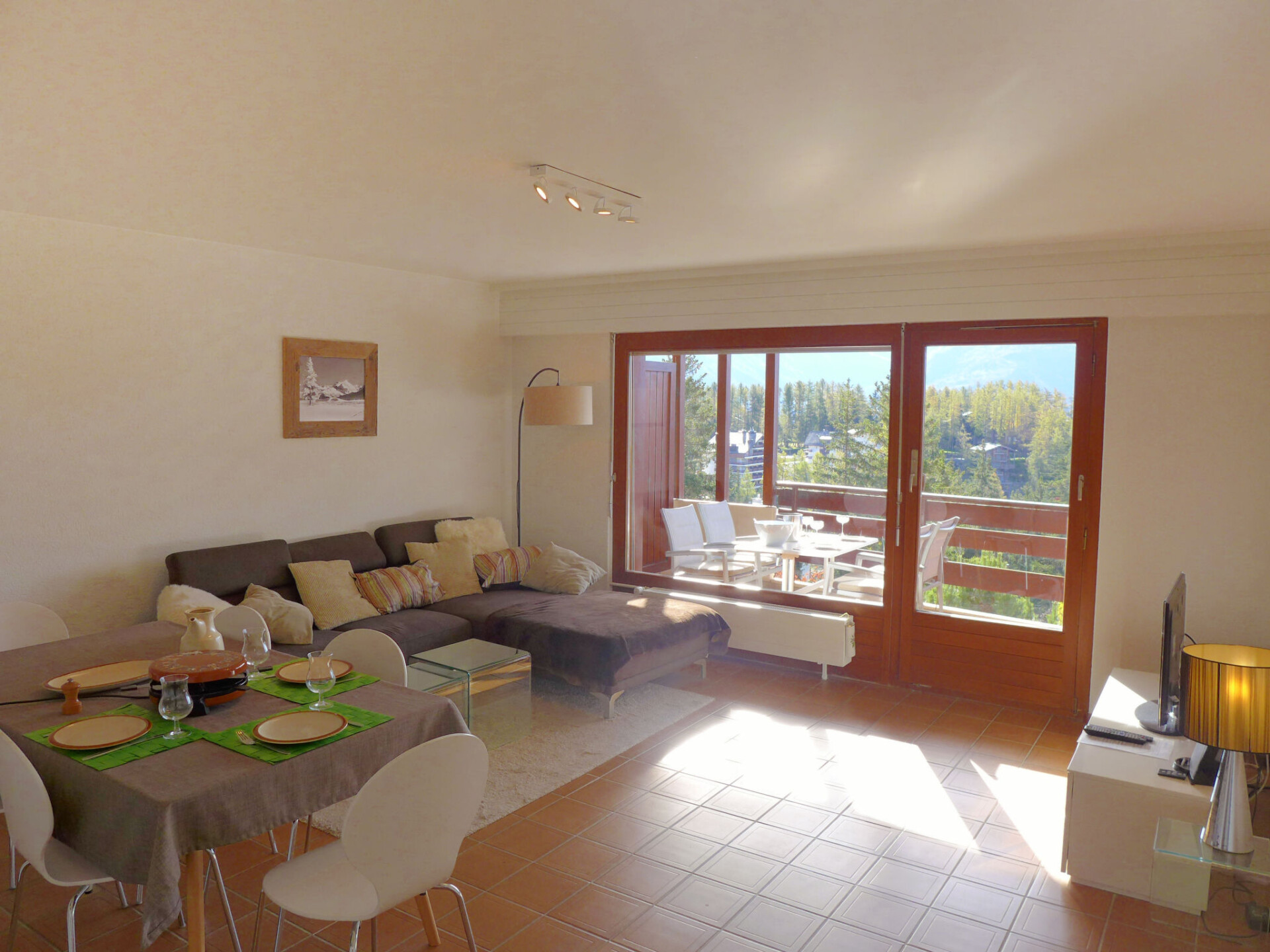 "Monte Cristo 6", appartement 2-kamers 68 m2 op de 1e verdieping. Mooi ingericht: woon-/eetkamer met Kabel-TV en DVD. Uitgang naar het balkon. 1 kamer met 1 bed (90 cm, lengte 200 cm), 1 2-pers bed (2 x 90 cm, lengte 200 cm). Uitgang naar het balkon. Open keuken (oven, afwasmachine, 4 keramische glas kookplaten, broodrooster, waterkoker, magnetron, elektrische koffiemachine, pads voor de koffiemachine (Nespresso) extra, raclette oven, fondue Set (kaas)). Bad/bidet/WC. Groot balkon, op het zuiden gelegen. Balkonmeubilair, ligstoelen (2). Mooi uitzicht op de bergen en het bos. Ter beschikking: strijkijzer, haardroger. Internet (WiFi, gratis). Garage nr. 6, hoogte 210 cm, breedte 240 cm. Niet rokers woning. Maximaal 1 huisdier/hond toegestaan.