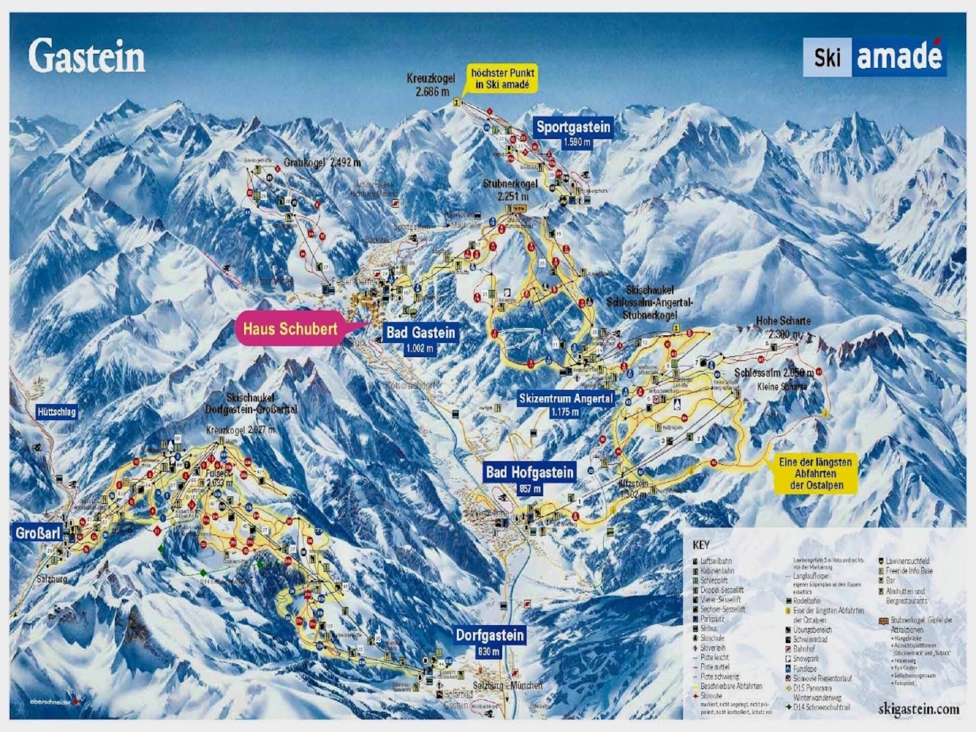 Groot flatgebouw "Schubert", van 4 verdiepingen. In het centrum van Bad Gastein, 3.5 km van het meer, 900 m van het skigebied. In het huis: lift, berging voor ski's, centrale verwarming, skischoendroger. Openbare parkeergarage op 700 m. Levensmiddelenwinkel 100 m, restaurant, bakkerij, café 500 m, centrum te voet bereikbaar in 5 minuten, bushalte "Mozartplatz" 10 m, thermaalbad "Felsentherme" 1 km, meer (zwemmen) 3.5 km. Golfterrein (18 holes) 2 km, kabelbaan op 900 m, ski faciliteiten, skipisten. Attracties in de buurt: Gasteiner Heilstollen Radon 5 km. Bekende skigebieden kunnen gemakkelijk worden bereikt: Bad Gastein Stubnerkogel u.Graukogel, Sportgastein, Bad Hofgastein, Dorfgastein. Wandelgebied Nationalpark Hohe Tauern. Lift tot de 3e verdieping. Gratis skibus. Vergelijkbare accommodaties kunnen worden geboekt.
