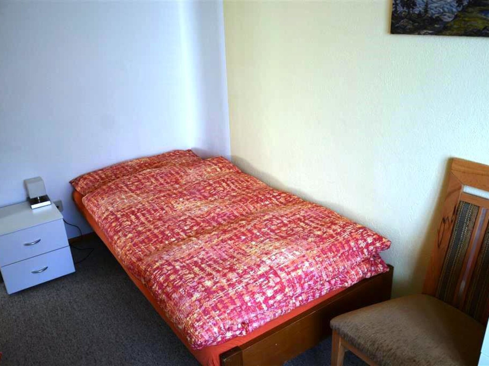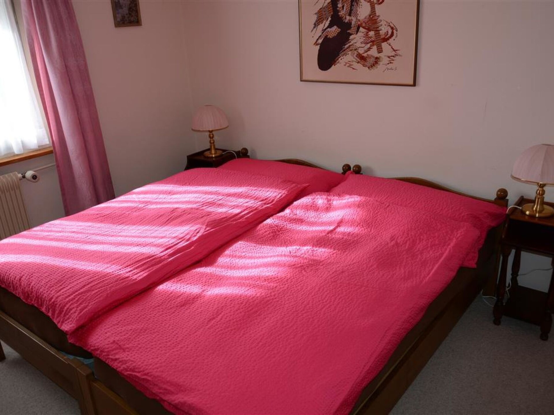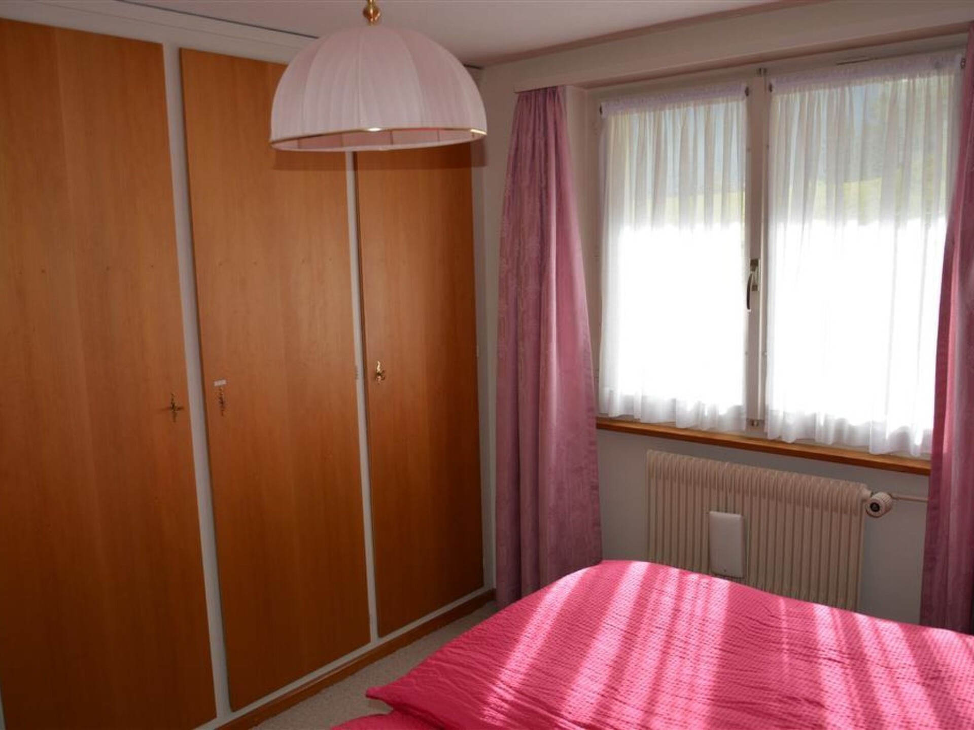 4 room apartment on the ground floor in a building with 2 apartments. 1 bedroom with 2 single beds (90x190cm) and cupboard. 1 bedroom with a French bed (140x190cm), dresser and leather armchair. 1 bedroom with 2 single beds (90x190cm) and dresser. Kitchen with dishwasher, refrigerator with freezing compartment, coffee machine with capsules (Nespresso), fondue-raclette set. Outdoor barbecue grill. Living room with 2 sofas and 1 armchair, small table, TV, DVD, radio and W-Lan. Separate eating area with dining table and 6 seats. Toilet with shower. 2 sunny terraces with garden furniture and a beautiful view to the south. Store room for skis and sports equipment. 1 garage space available.