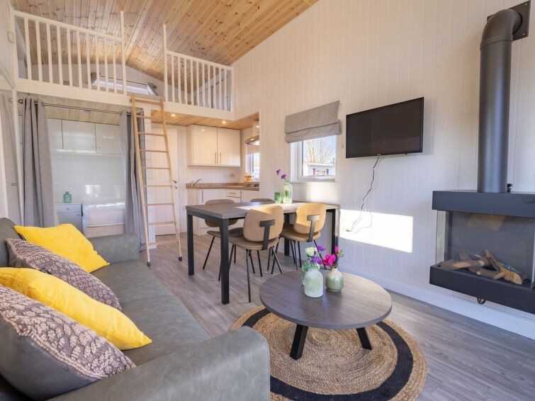 "Tiny Lodge 4", 2-kamers mobilhome 30 m2 op 2 verdiepingen. Doelmatig en gezellig ingericht: woon-/slaapkamer met eettafel, TV en houtkachel. Uitgang naar het terras. 1 open kamer met gordijn met 2 bedden. Kookhoek (4 kookpitten (vlammen), waterkoker, elektrische koffiemachine). Douche/WC. Bovenverdieping: (ladder) open galerij met afgeschuinde daken met 2 bedden. Terras, kleine tuin. Terrasmeubelen. Ter beschikking: kinderstoel, kinderbed (extra). Internet (Internet (WiFi), gratis). Parkeerplaats (1 Auto). Niet rokers woning. Boekingen zijn alleen voor vakantiedoeleinden toegestaan. Ter plaatse kan een borg van EUR 100 per persoon in rekening worden gebracht. In plaats van een afgesloten slaapkamer bevinden sommige slaapgedeeltes zich in een open ruimte (galerij, nis, etc.).
