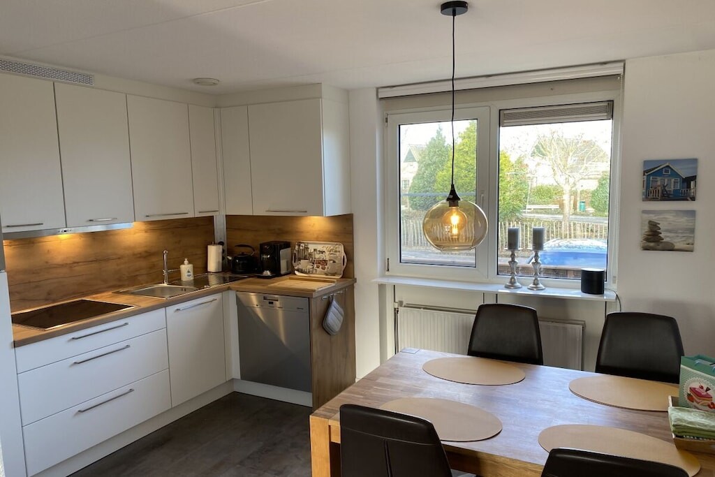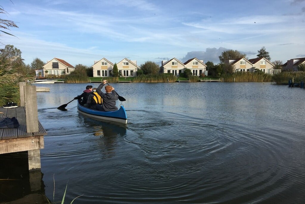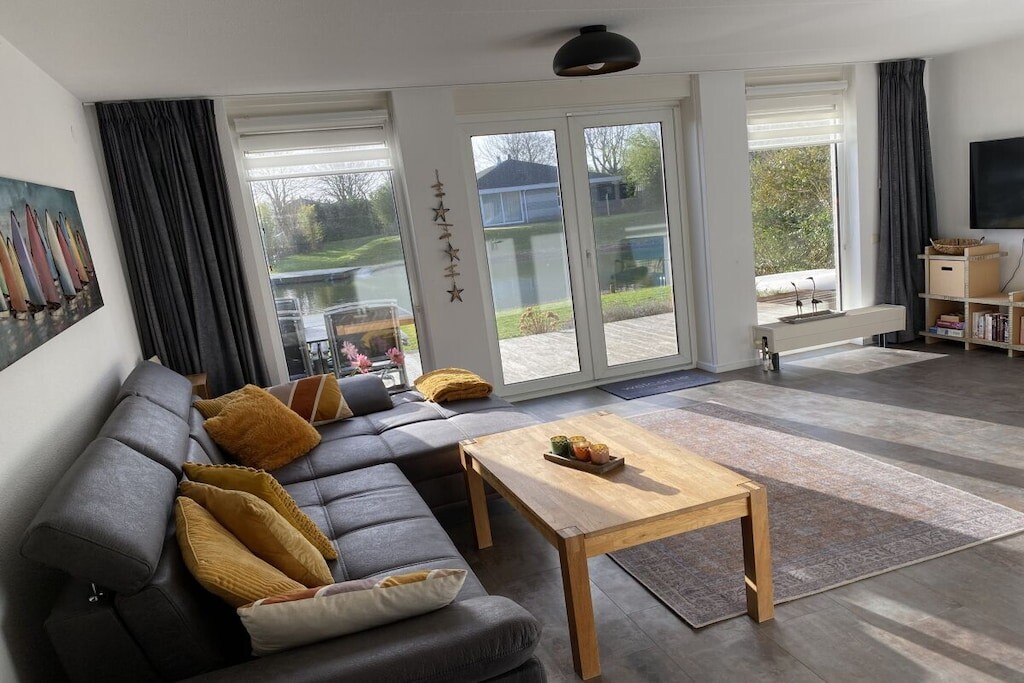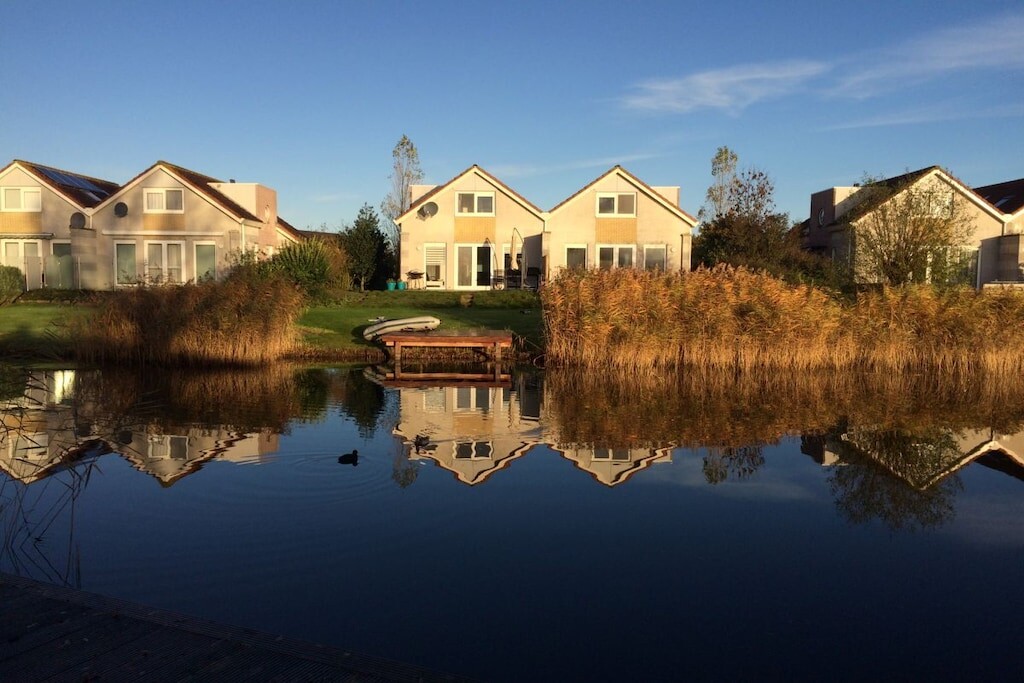 Hoogwaardig vakantiehuis met sauna, open haard, direct aan het water, eigen aanlegsteiger met kano, tuin, vissen, wifi, 2 smart tv's, IJsselmeer, Makkum, strand