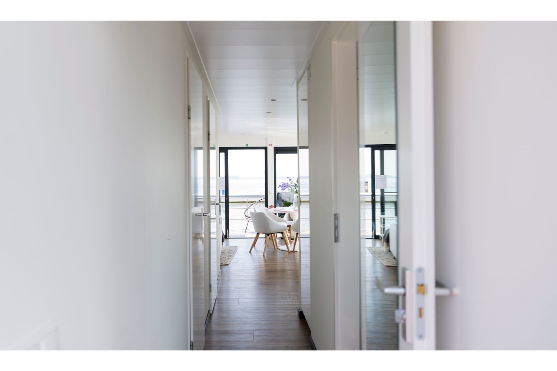De zeer moderne keuken is uitgerust met een fornuis, oven, waterkoker, Nespresso-apparaat met melkopschuimer, koelkast/ vriezer, vaatwasser, alles wat u nodig heeft voor een aangenaam verblijf. Als u geen zin of tijd heeft om te koken is de Beachclub Sneek met heerlijk eten op loopafstand. Een van de slaapkamers beschikt over een tweepersoonsbed, de andere over een stapelbed. Verder is er een badkamer met douche en toilet. Er zijn meerdere terrassen, de grootste is een ruim zonnedek, die toegankelijk is via een wenteltrap. Onze houseboat is voorzien van insectenramen in de slaapkamers en badkamer zodat je gerust kunt slapen. De houseboat zit stevig vast aan de steigerlengte van de haven en is niet verplaatsbaar.