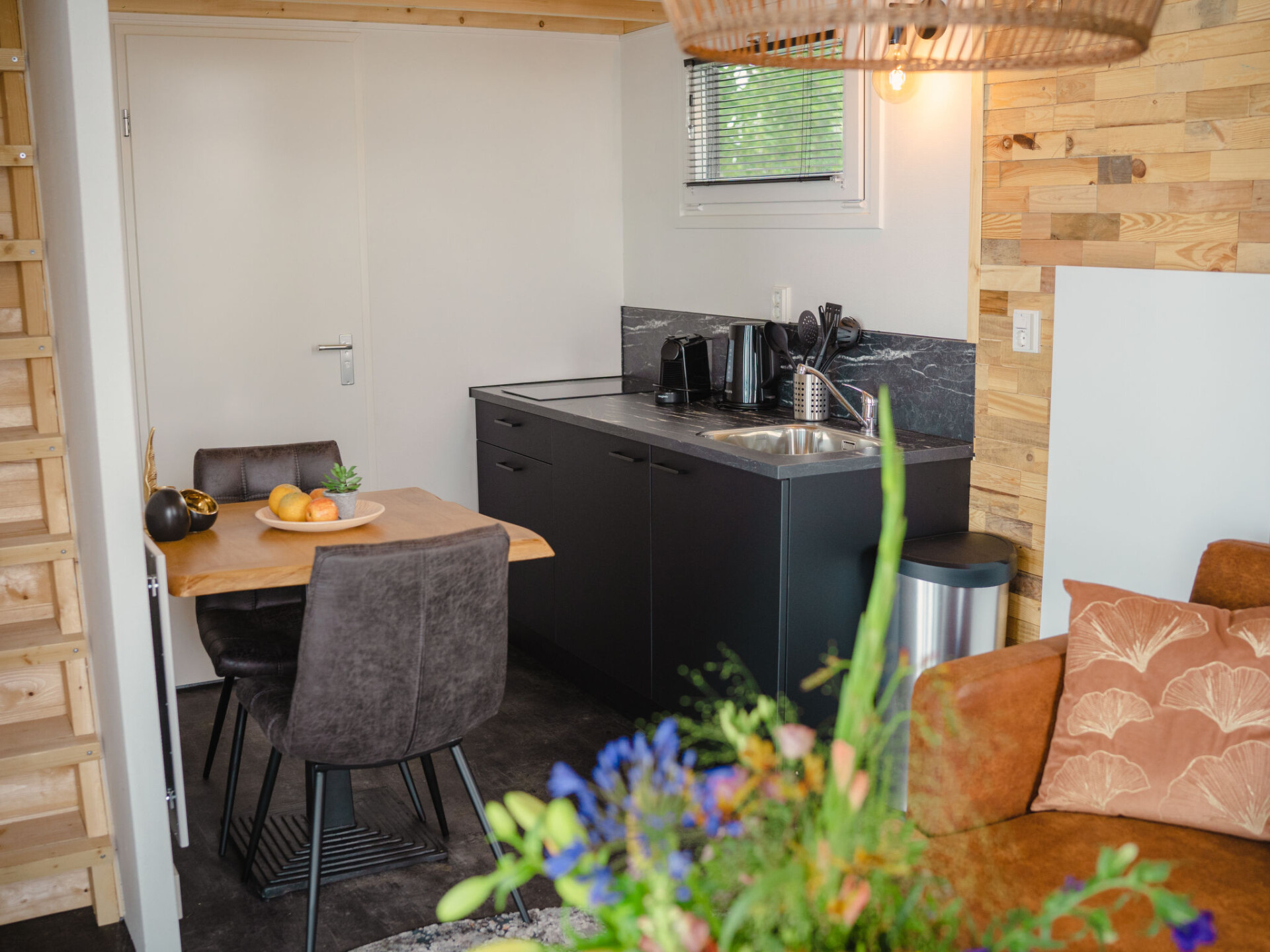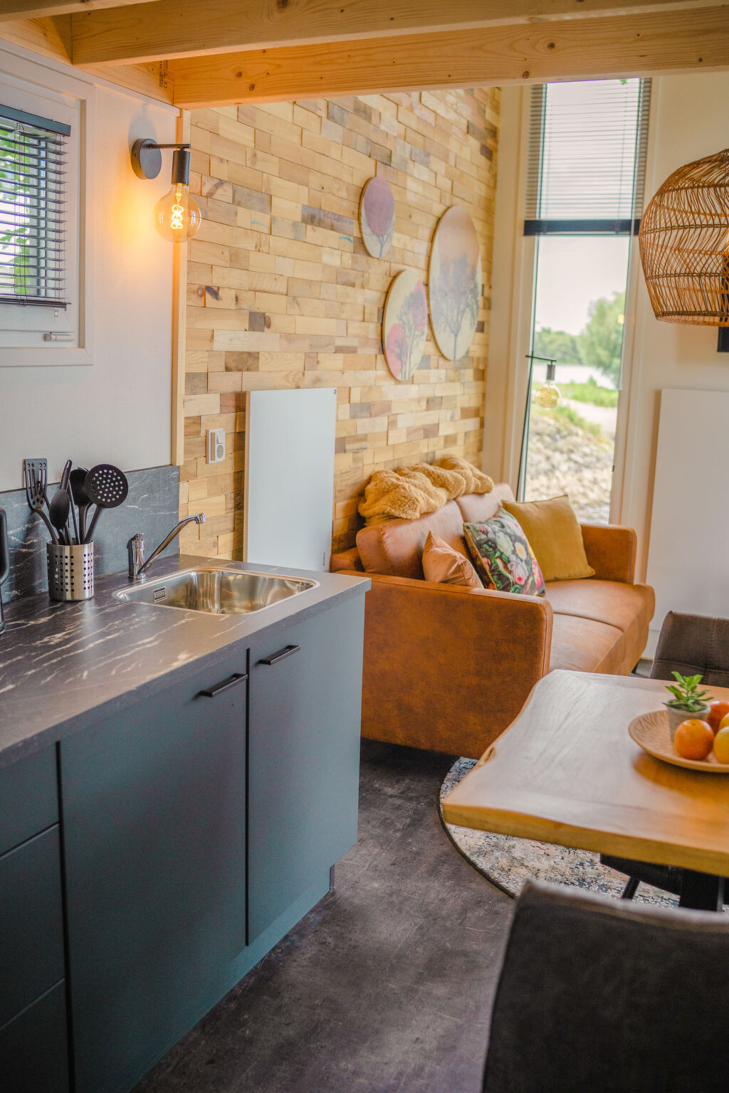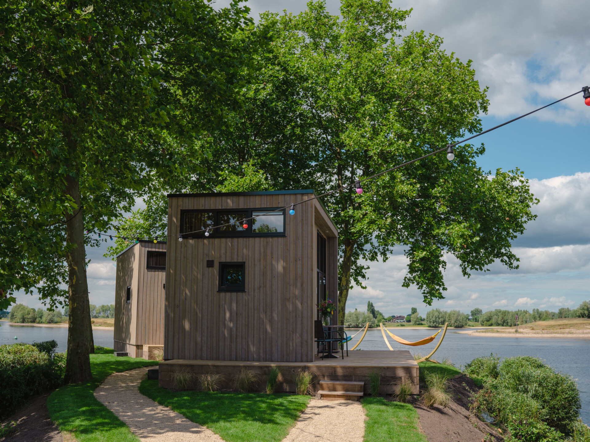 "Tiny River House", huis 2-kamers 18 m2. Comfortabel ingericht: woon-/eetkamer met TV (Flatscreen TV). Uitgang naar het terras. Kleine, open keuken (2-pits kookplaat, waterkoker, elektrische koffiemachine, pads voor de koffiemachine (Nespresso) extra). Douche/WC. Verwarming. Bovenverdieping: (steile trap), 1 kamer met 1 2-pers bed. Terras. Terrasmeubelen. Uitzicht op het meer. Ter beschikking: Internet (WiFi, gratis). Parkeerplaats (1 Auto). Niet rokers woning. Maximaal 2 huisdieren/honden toegestaan. Rookmelders.