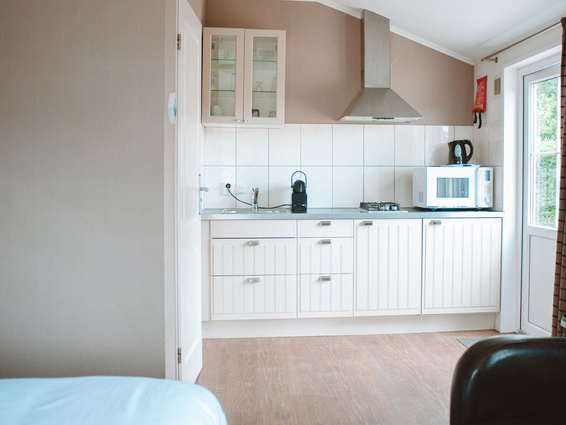 "Veluwe", studio 1-kamer 25 m2. Doelmatig en comfortabel ingericht: open woon-/slaapkamer met 2 bedden, eettafel en Digitale TV. Uitgang naar het terras. Open keuken (2-pits kookplaat, waterkoker, elektrische koffiemachine, combimagnetron). Douche/WC. Verwarming. Klein terras. Terrasmeubelen. Ter beschikking: Internet (Internet (WiFi), gratis). Niet rokers woning. Rookmelders. Huisdier op aanvraag.