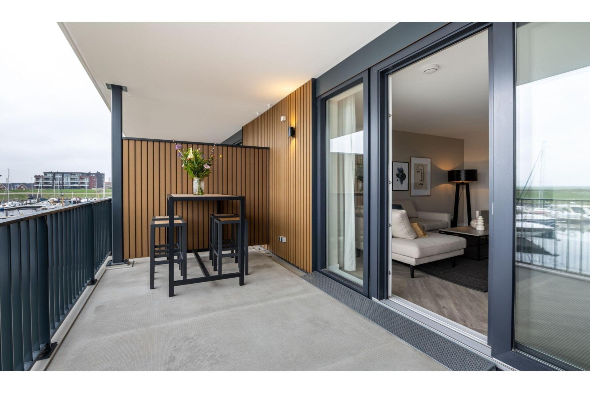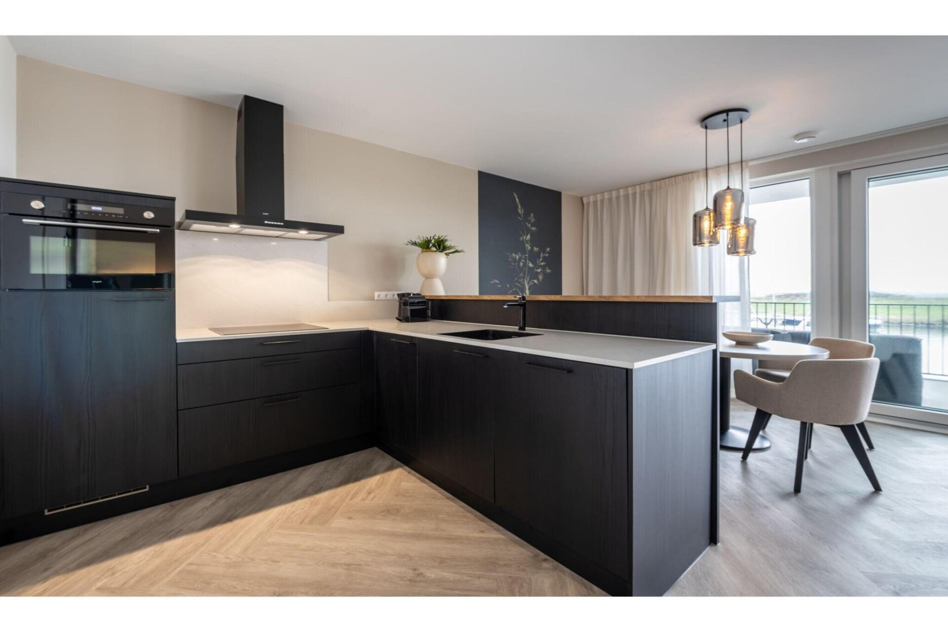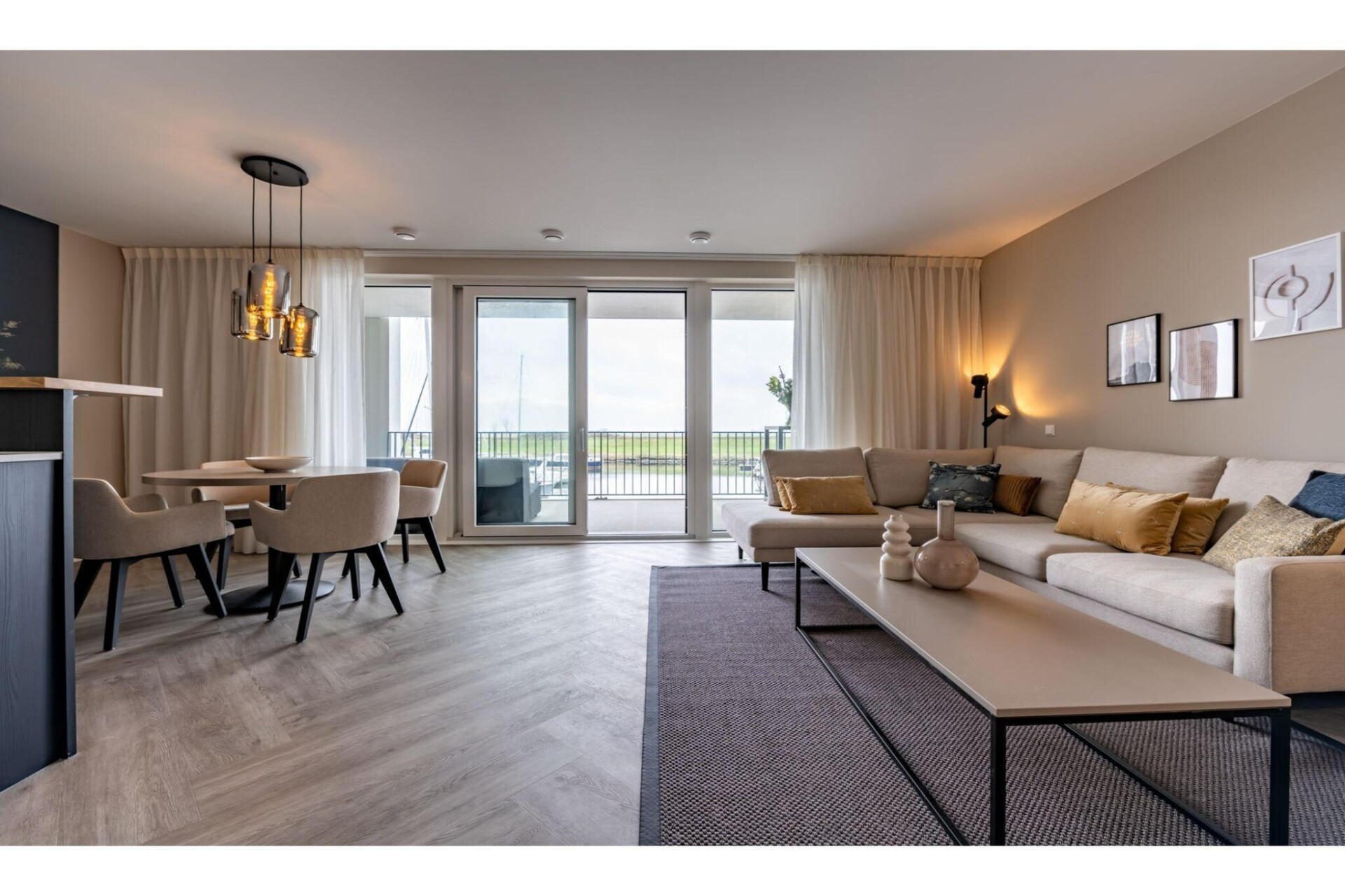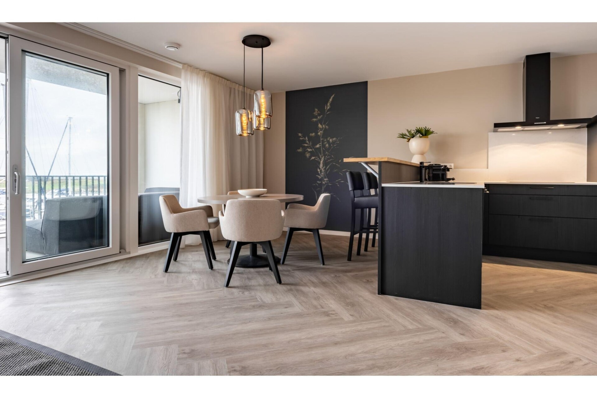De sfeervol ingerichte woonkamer is voorzien van een comfortabele zithoek en een Smart TV met buitenlandpakket. Vanuit de woonkamer heeft u toegang tot het ruime terras op het zuiden met comfortabele loungeset en gezellige bartafel. Hier kunt u tot in de late uren genieten van het prachtige uitzicht op de levendige jachthaven en het Veerse Meer. De ruime luxe ingerichte keuken is voorzien van comfort inbouwapparatuur, o.a. een inductiekookplaat, een koelkast met vriesvak en een Nespresso koffiemachine. In de berging staan een wasmachine en wasdroger tot uw beschikking, evenals één kinderbed en één kinderstoel. In de buitenberging is er ruimte voor uw (elektrische)fietsen. Huisdieren zijn niet toegestaan in dit appartement.