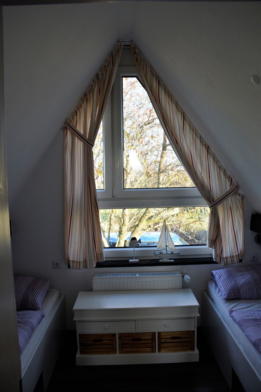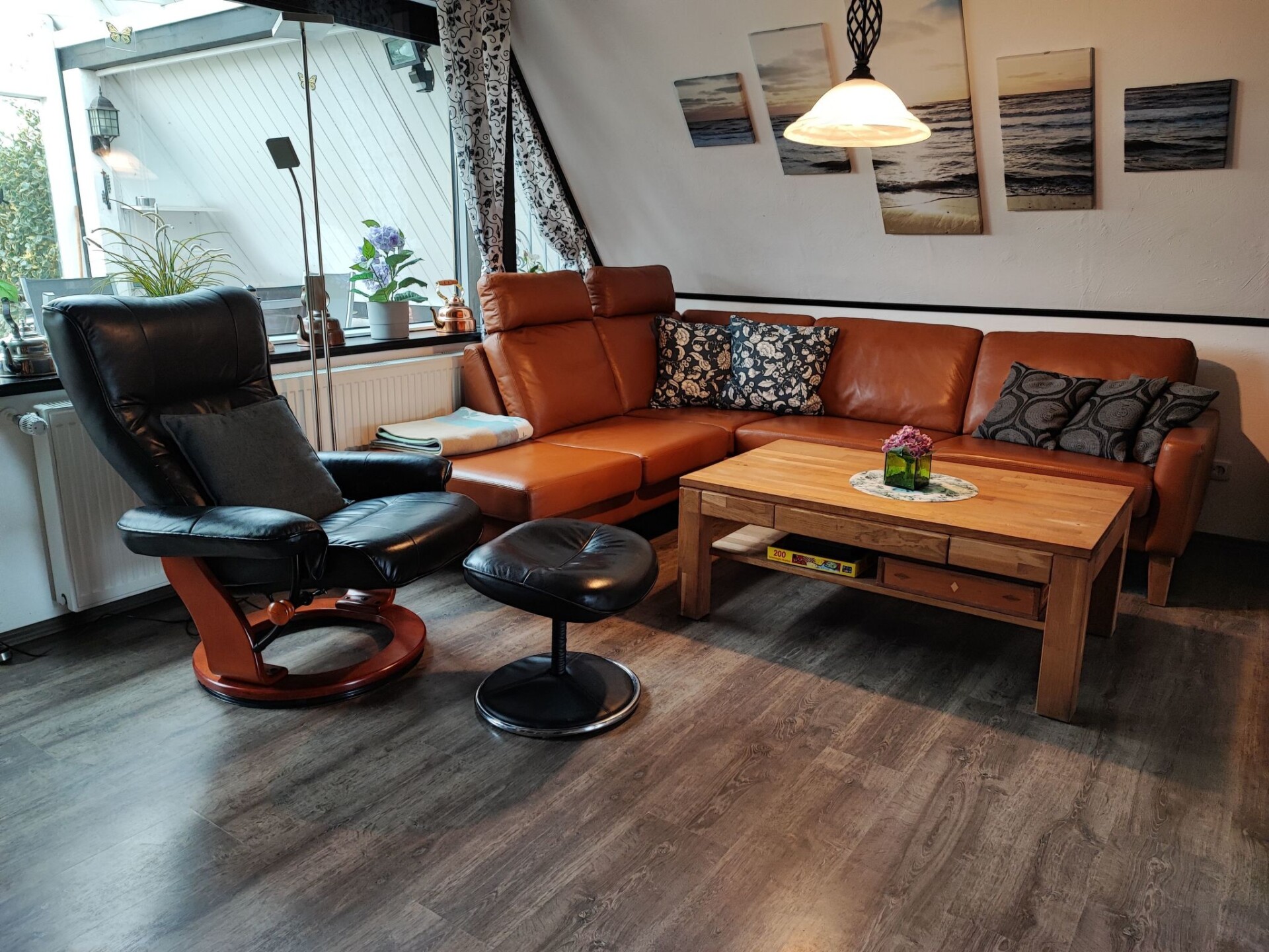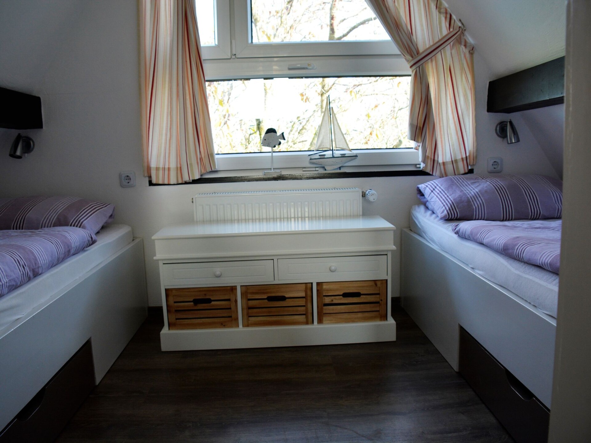 Maximaal 2 huisdieren/honden toegestaan. The cosy roof-only house (non-smoking) for a maximum of 4 people is located at the end of a cul-de-sac in the quiet Achtern Diek holiday home complex, with a wonderful view of the neighbouring meadows.From the living area on the ground floor you have access to the large, partly covered terrace and the adjoining, fully fenced garden.Upstairs there is a double bedroom and a room with two single beds. On the ground floor there is a small shower room and a separate WC and a small, fully equipped kitchen with fridge, microwave and hob with oven. The dormer window installed during the renovation work has created a bright separate dining area in the living area, which offers plenty of space for eating and playing. With a baby travel cot and a high chair, which are provided free of charge by the owner, as well as a toilet seat for children and a hump in the bathroom, the house offers family-friendly facilities.The complex is located directly on the North Sea dyke, so that you can reach the North Sea lagoon, the green beach of Burhave or the play barn in just a few minutes on foot. The centre of Butjadingen-Burhave, which offers numerous restaurants and shopping facilities, is also within easy reach by bike or on foot. The proximity to the North Sea dyke offers a good starting point for long walks or cycle tours along the coast of Butjadingen. Just a few minutes' walk from the holiday home, the dog beach and another designated dog meadow behind the play barn offer the opportunity for your four-legged friends to romp around to their heart's content.Cats are not allowed in the holiday home.