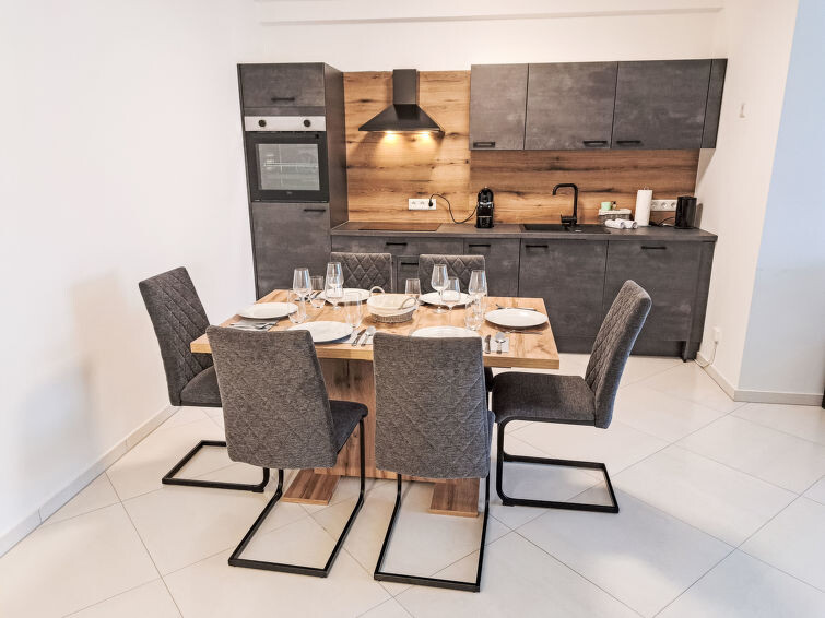 "Sunshine view", appartement 3-kamers 75 m2. Het objekt is geschikt voor 4 volwassenen + 2 kinderen. Ruim en licht, volledig gerenoveerd in 2024, zeer modern en stijlvol ingericht: hal. Woon-/slaapkamer met 1 2-pers divanbed, eettafel, Sat-TV en Flatscreen TV. Uitgang naar het balkon. 1 kamer met 1 2-pers bed. 1 kamer met 1 divanbed (120 cm, lengte 200 cm). Uitgang naar het balkon. Open keuken (oven, afwasmachine, 4 keramische glas kookplaten, broodrooster, waterkoker, elektrische koffiemachine). Badkamer, aparte WC. Natuurstenen vloeren. Groot balkon. Balkonmeubilair, bergruimte. Mooi panoramazicht. Ter beschikking: wasmachine. Internet(WiFi), gratis). Parkeerplaats (2 Auto's). Geschikt voor families. Niet rokers woning.