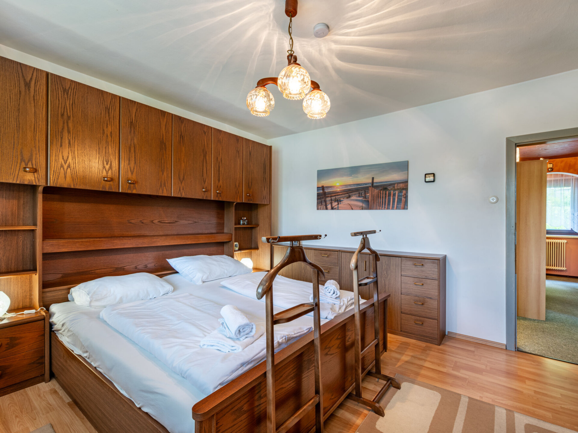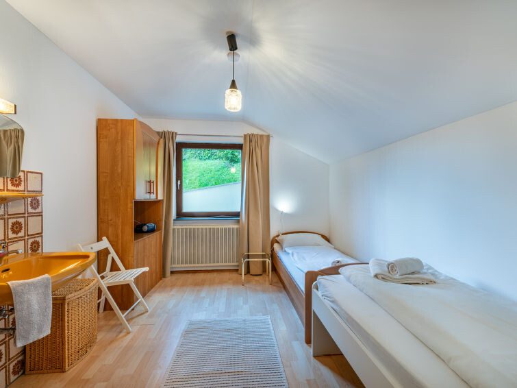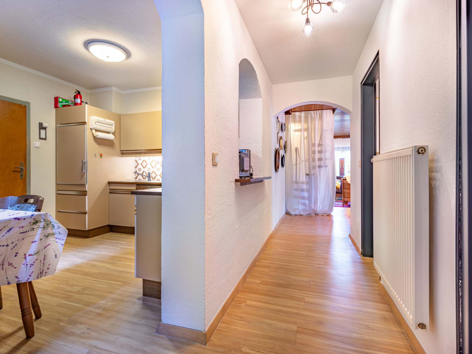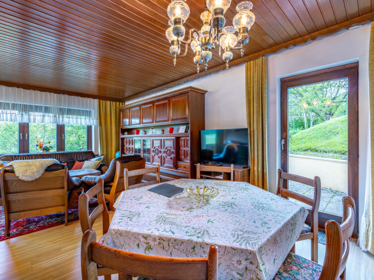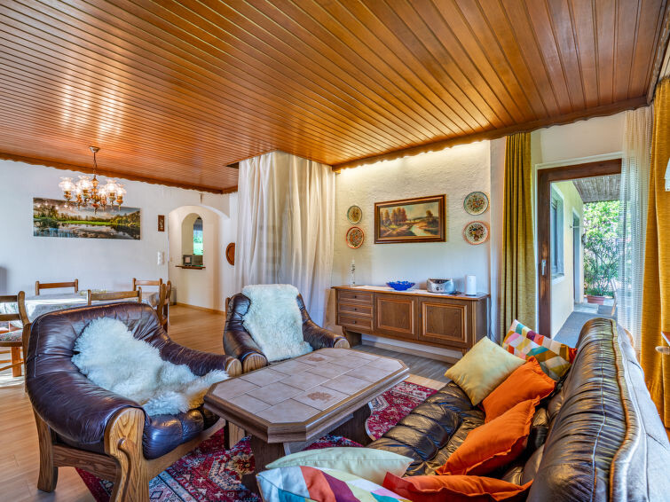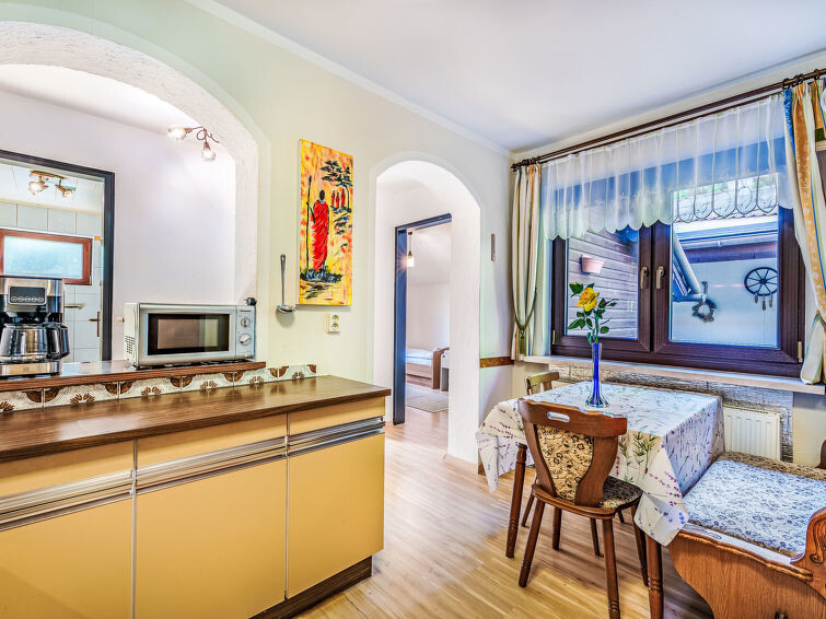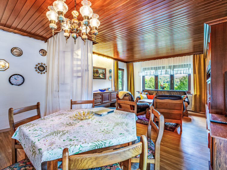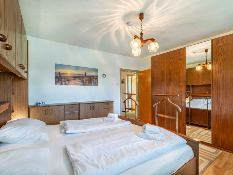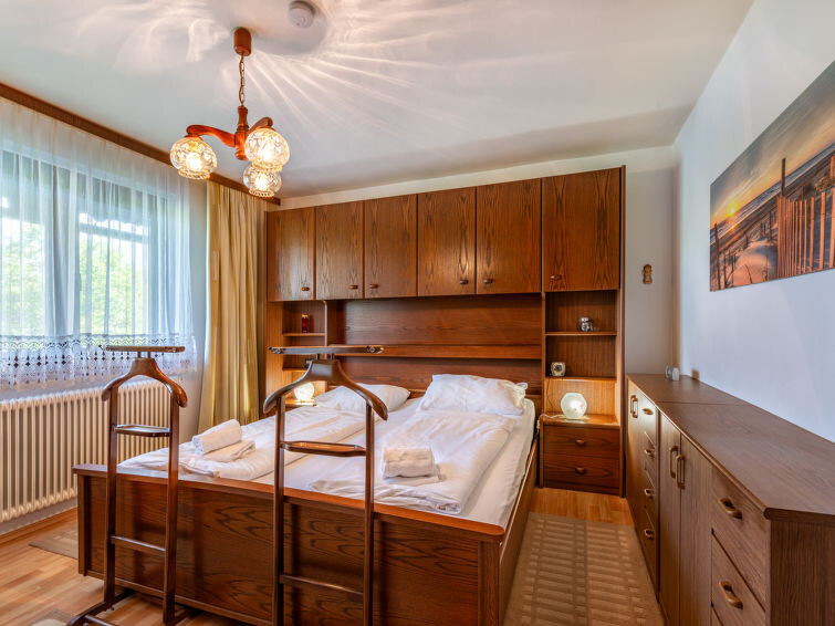 "Zeitlos", huis 5-kamers 112 m2 op 2 verdiepingen. Het objekt is geschikt voor 8 volwassenen + 1 kinderen. Doelmatig en gezellig ingericht: hal. 1 groot 2-pers. kamer 16 m2 met gordijn met douche/WC. Uitgang naar het balkon. 1 groot 2-pers. kamer met gordijn met douche/WC. 1 kamer met afgeschuinde daken met gordijn met 2 bedden (90 cm, lengte 200 cm), wastafel en radio. Groot woon-/eetkamer met veranda met Sat-TV, Flatscreen TV, radio en CD-speler. Uitgang naar het balkon, naar het terras. Kleine, open keuken 7 m2 (oven, afwasmachine, 4 keramische glas kookplaten, waterkoker, magnetron, diepvriezer, elektrische koffiemachine) met kleine eettafel, doorgeefluik. Badkamer, bidet, aparte WC, dubbele wastafels. Olie-verwarming. Souterrain: (buitentrap), 1 kamer met 1 divanbed (200 cm, lengte 90 cm), 1 2-pers bed, bad/WC, wastafel, Sat-TV en Flatscreen TV. Uitgang naar het terras. Mooi panoramazicht. Ter beschikking: wasmachine, kinderstoel, kinderbed. Internet (WiFi, gratis). Rookvrij huis. Maximaal 1 huisdier/hond toegestaan.