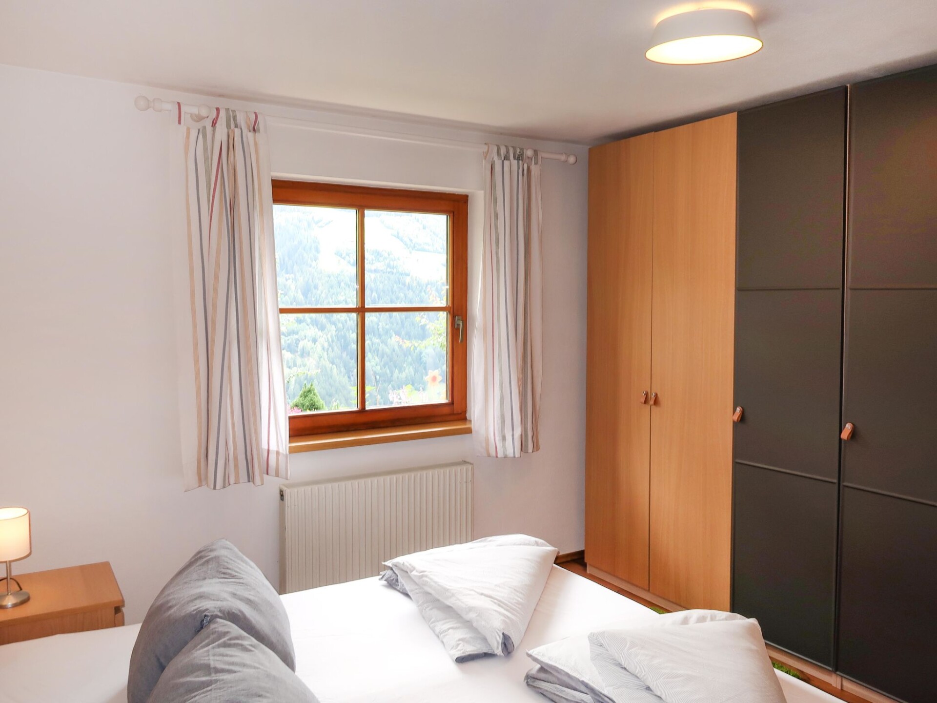 "Appart Vroni", Accomodatie 3-kamers 80 m2, souterrain. Ruim, mooi en smaakvol ingericht: groot hal. Woonkamer met Sat-TV (Flatscreen TV). 1 2-pers. kamer. 1 kamer met 1 bed en 1 uitschuifbaar bed (1 pers.). Keuken (afwasmachine, 4 keramische glas kookplaten, broodrooster, waterkoker, magnetron, diepvriezer, elektrische koffiemachine) met eettafel. Bad/douche, aparte WC, dubbele wastafels. Olie-verwarming. Kleine zithoek in de tuin 10 m2, op het zuiden gelegen. Terrasmeubelen, bergruimte. Ter beschikking: kinderbed tot 2 jaar, haardroger. Internet (WiFi, gratis). Parkeerplaats (1 Auto). Niet rokers woning. Privé ingang.