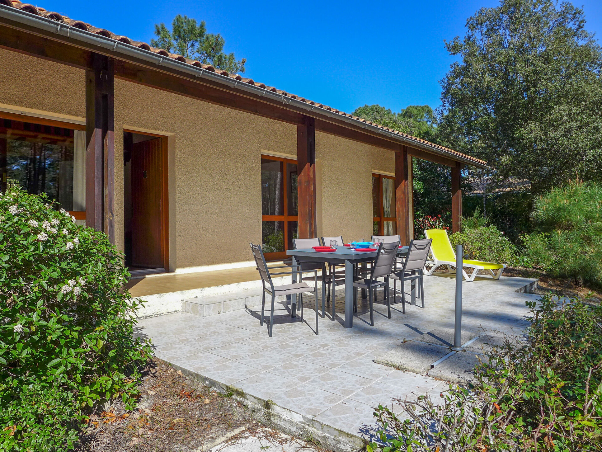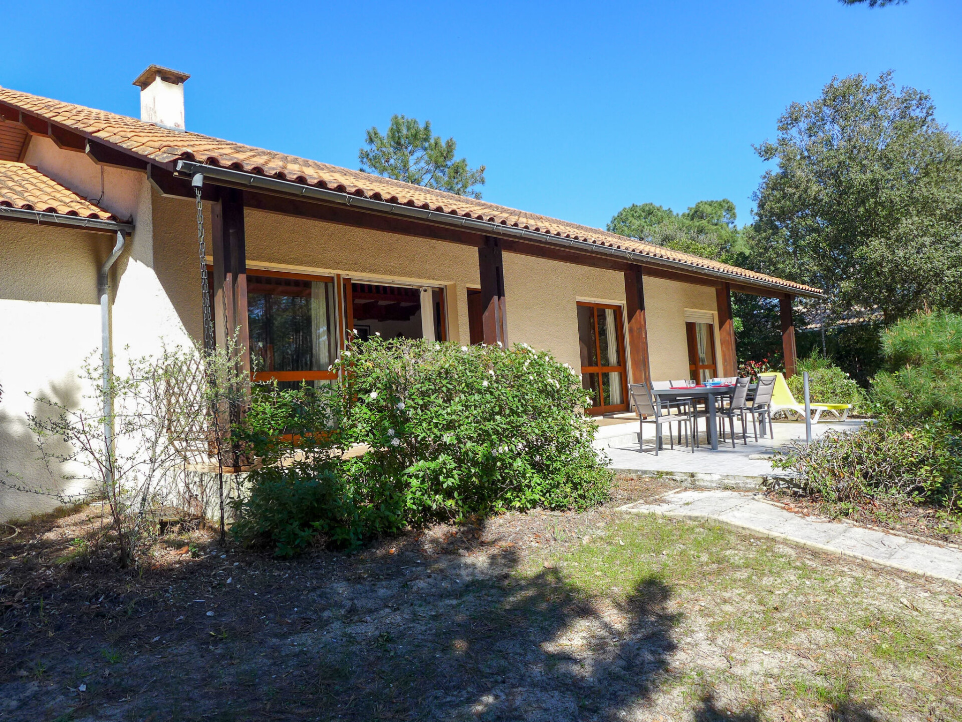 Eengezinswoning "Orée des Greens". Buiten de plaats, 3.5 km van het centrum, rustige ligging in een woonwijk, 4 km van zee, 3 km van het meer, 4 km van het strand. Voor alleengebruik: wild terrein 1.000 m2, openluchtzwembad, overdekt zwembad (4 x 8 m, 50 - 190 cm diepte, seizoensgebonden beschikbaarheid: 01.Jun. - 30.Sep.). Parkeerplaats op het terrein. Winkel 3.5 km, supermarkt 4 km, restaurant 3.5 km, fietsverhuur 3.5 km, bushalte "Le Huga" 1 km. Golfterrein (18 holes) 1.2 km, surfschool 4 km, tennis 2.9 km, midgetgolf 3.5 km, fietspad 1 km. Attracties in de buurt: Parcours Aventure 4 km. Bekende meren kunnen gemakkelijk worden bereikt: Lac de Lacanau 3 km. Groepen jongeren uitsluitend op aanvraag.