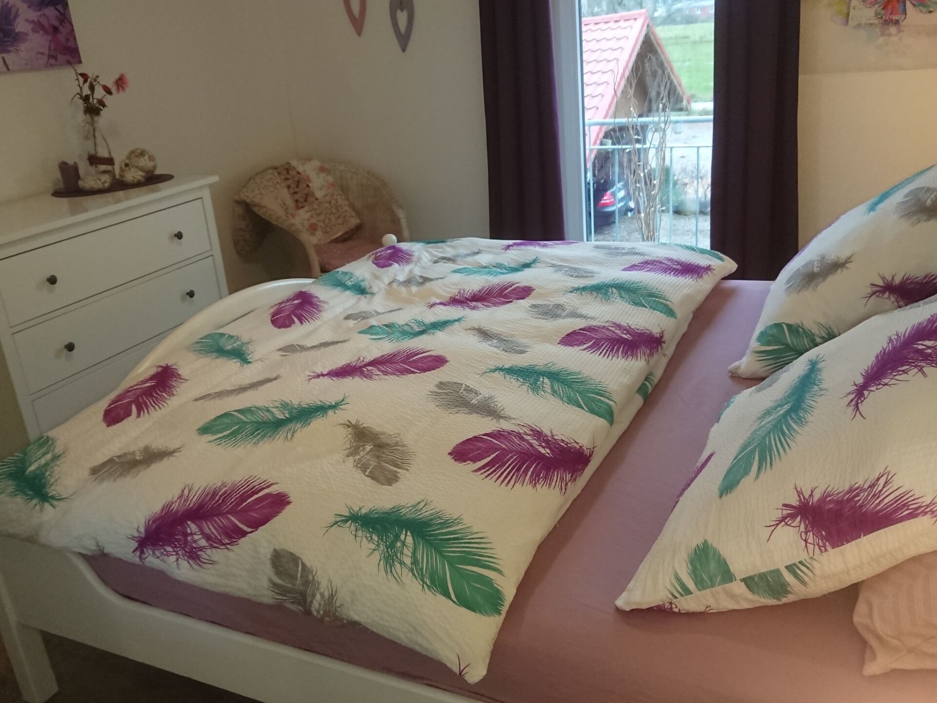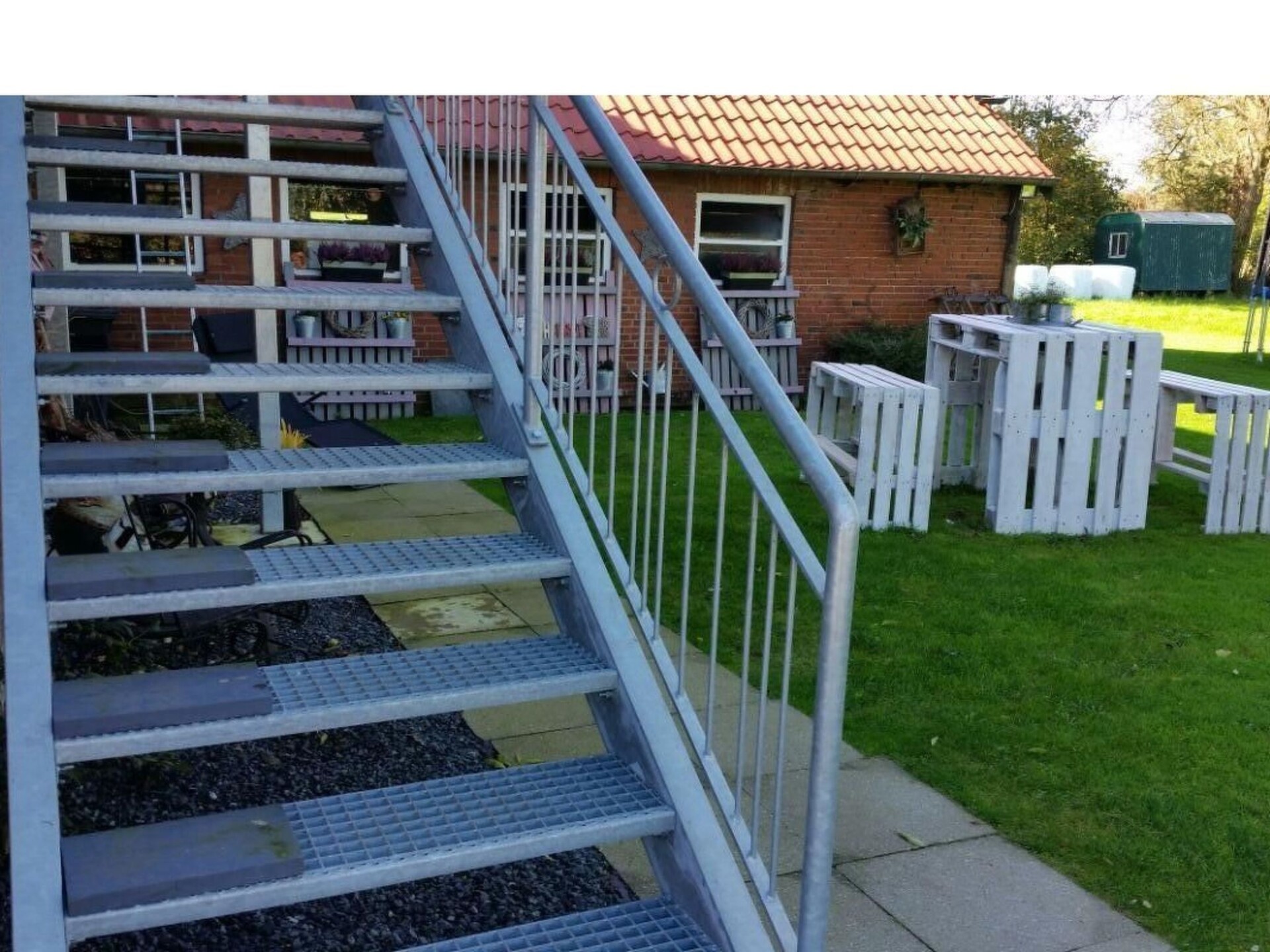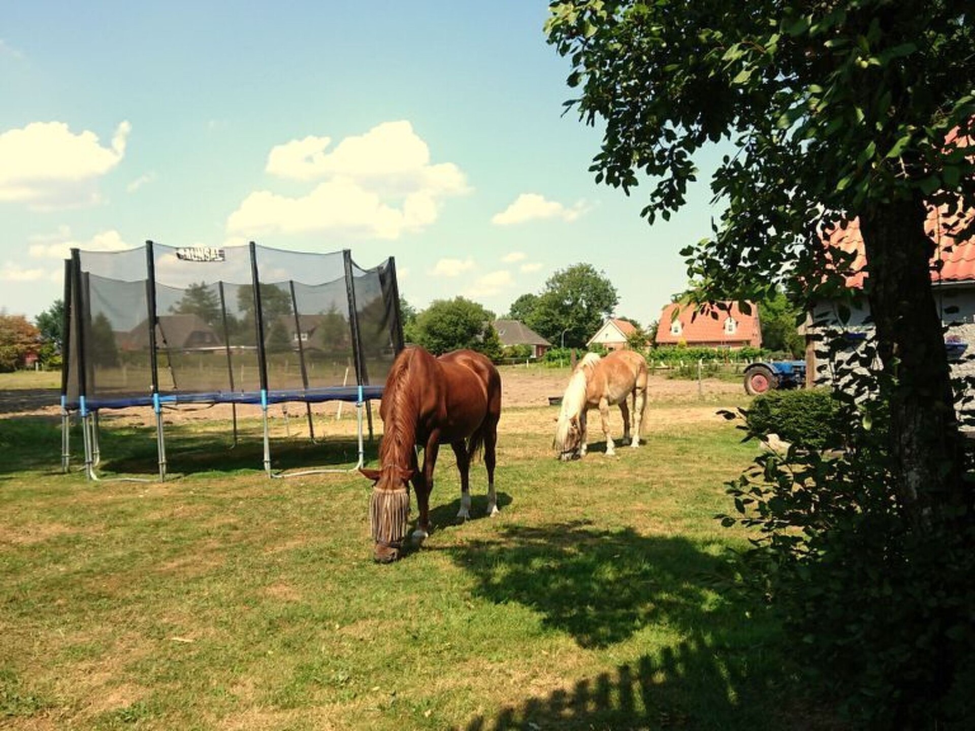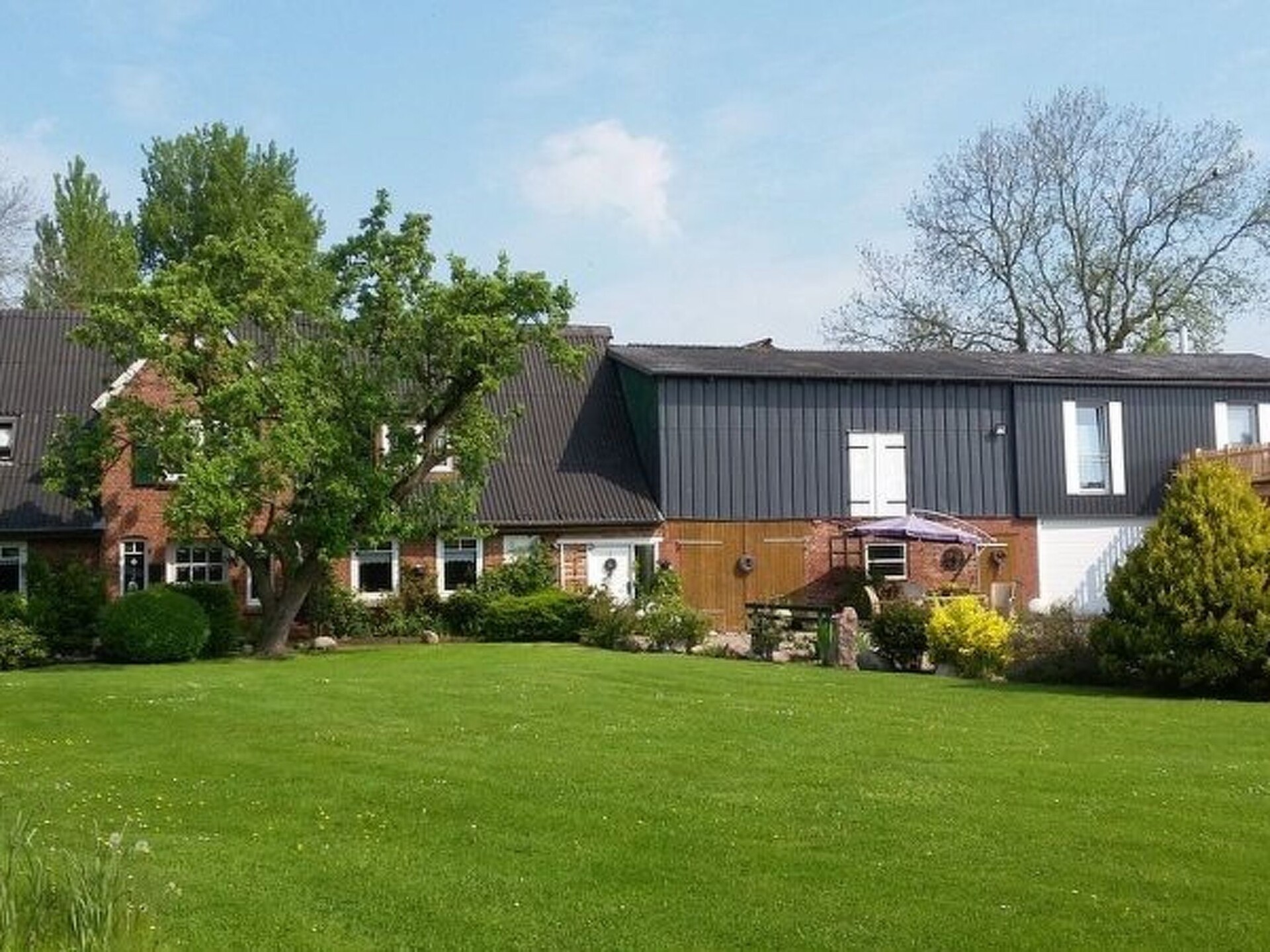 Maximaal 2 huisdieren/honden toegestaan. This is a detached former farm with an extensive site, whose former outbuilding now houses the two holiday apartments on the first floor, one to the left, the other to the right. In between there are the private horse stables. The owners live on the ground floor. Your holiday accommodation is on a side street with little traffic on the outskirts, surrounded by meadows and fields, ideal for cycle trips to the tidal flats. The tranquil locality has restaurants and a bakery within walking distance.Former country house, extensively renovated and with two holiday apartments, private outdoor areas, a large garden, riding facilities and a small sauna. Dogs welcome. While the holiday apartment with a roof terrace,has been very popular since 2015, measures 70m² and offers up to four adults and a child a relaxing holiday, this apartment completed in 2016 offers 75m² of living space for up to four adults. A more detailed description of this apartment follows: Newly completed holiday apartment in the country house with a balcony The holiday apartment newly completed in 2016 with 75m² of living space and comfortable furnishing in a rustic style exudes an enchanting atmosphere, so you will feel at ease as soon as you arrive and can relax. The apartment is on the first floor and is accessed separately up outdoor stairs, with metal steps with some wooden planks, to facilitate access for dogs. The entrance area flooded with daylight leads directly into the spacious living room, where you can relax after a day trip on a leather suite consisting of a three-seater sofa and two armchairs, with a flatscreen satellite TV providing entertainment and the fireplace stove exuding a romantic atmosphere. The adjoining built-in kitchen with a counter is fully-equipped for comprehensive and convenient self-catering, including a freezer, fridge, dishwasher, oven and microwave. The apartment has two tastefully furnished bedrooms each with a double bed, bedside tables and reading lamps. Wardrobes and dressers provide ample storage space for your luggage. The bathroom is fitted with a large bath with a shower attachment and shower screen. The floor with vinyl planks has underfloor heating. The Internet access has a speed of 100 Mbit/s. On the courtyard side there is a balcony accessed from the kitchen, on the south side, where a canopy beach chair or comfortable garden furniture await you during the summer months for relaxing outdoors.Your four-legged companions can run around outside on the 5000m² site with greenery, although it is not fenced in. During the winter months, you can spend evenings by the fireplace stove in the living room (the owner provides firewood free of charge), or in the little sauna for two people (for shared use, to be arranged with the owner). In summer you can enjoy evenings by the campfire or the grill area in the separate gardens. The large driveway to the house has space for several cars. People and pets alike will find peace and quiet in the well-tended garden. Next to the site there is the pasture with a little pond, with a paddle boat available.You are welcome to explore the beautiful area on one of the owner’s horses, free of charge for experienced riders. The owners live in the lower part of the house and are happy to assist with any queries. On request a basket of firewood is offered by the owner for free.In the immediate vicinity there are many beautiful hiking trails. On weekdays, the local baker a five-minute walk away offers fresh bread rolls. In the forest about a half-hour walk away you can find rustic forest inns, alternatively there is a restaurant a side street away. There are also a playground and a football ground. The North Sea and the nearest seaside resort Lüthmoorsiel are about 12km away. There are shopping facilities about 6km away. You can enjoy the beautiful surroundings along waymarked hiking and riding trails through marsh and heathland.