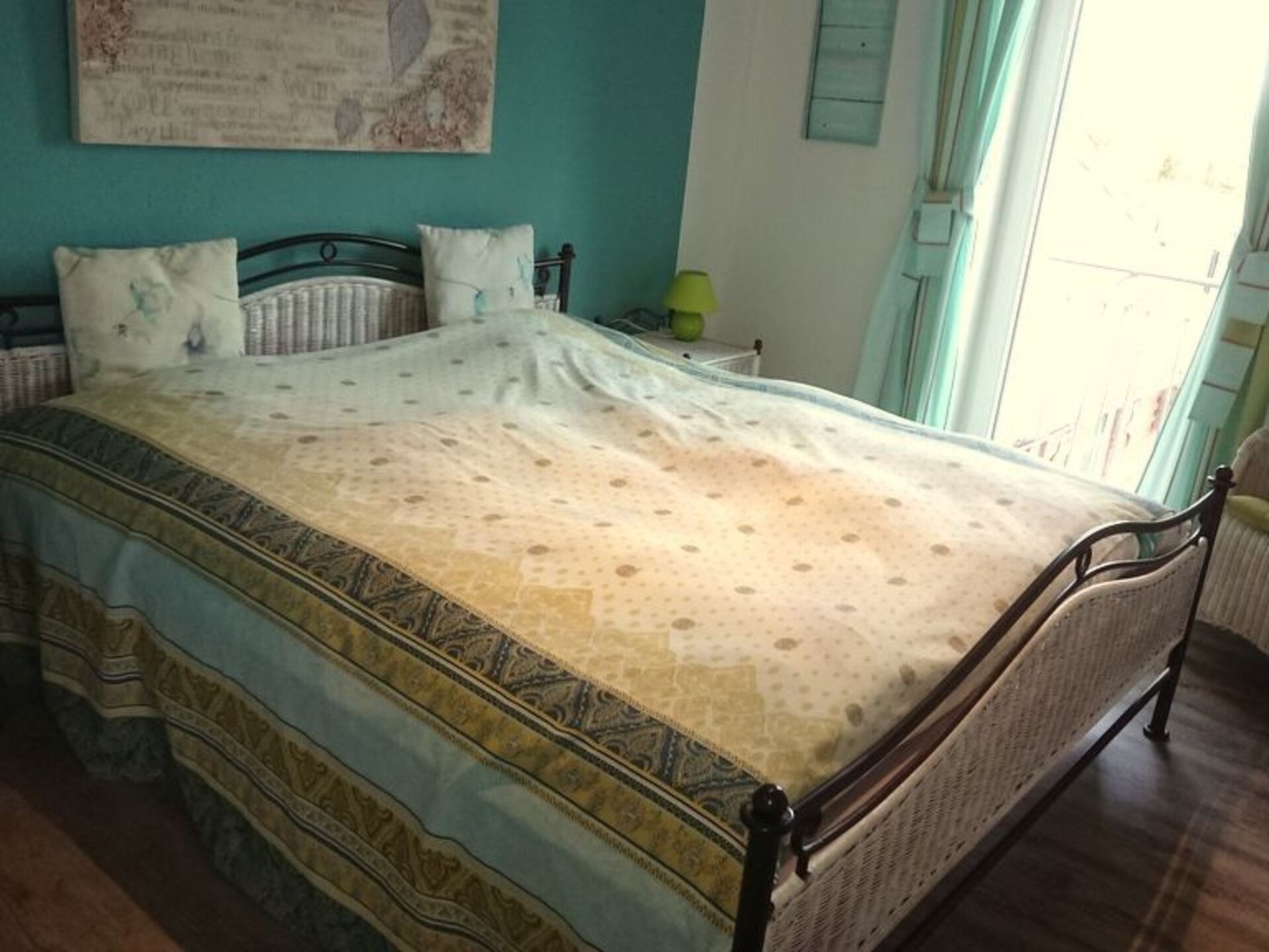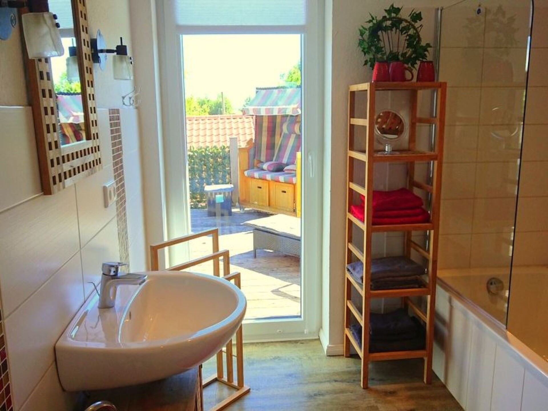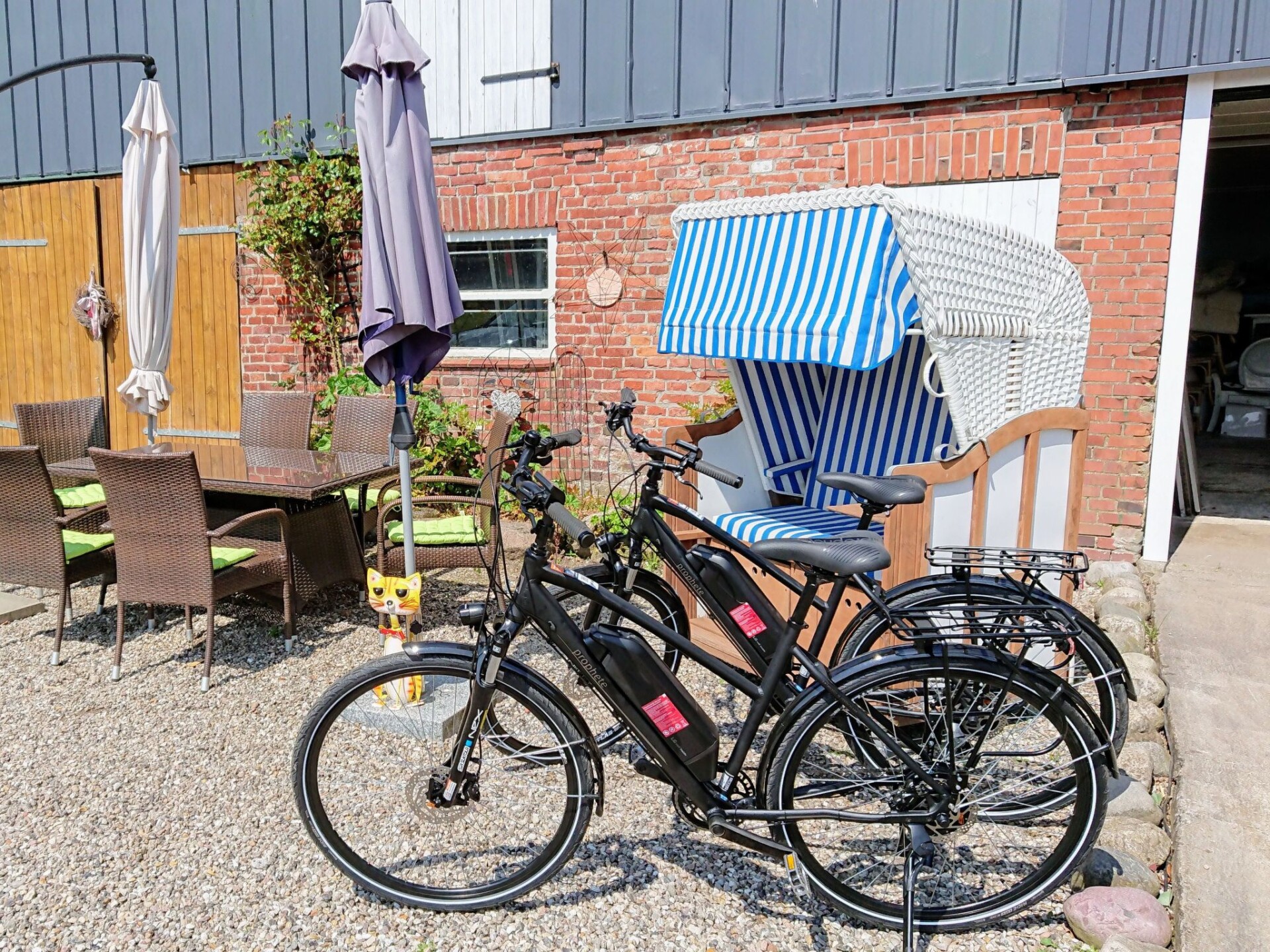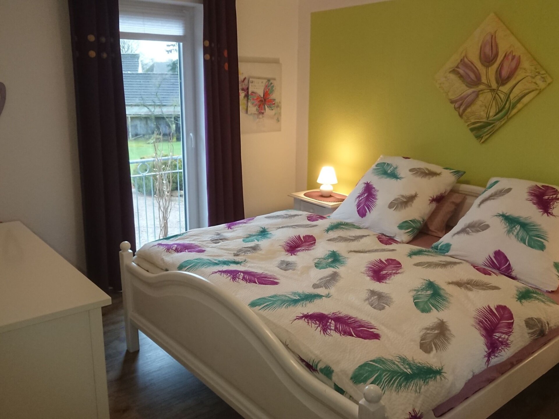 Maximaal 2 huisdieren/honden toegestaan. This is a detached former farm with an extensive site, whose former outbuilding now houses the two holiday apartments on the first floor, one to the left, the other to the right. In between there are the private horse stables. The owners live on the ground floor. Your holiday accommodation is on a side street with little traffic on the outskirts, surrounded by meadows and fields, ideal for cycle trips to the tidal flats. The tranquil locality has restaurants and a bakery within walking distance.Former country house, extensively renovated and with two holiday apartments, private outdoor areas, a large garden, riding facilities and a small sauna. Dogs welcome. While the holiday apartment with a roof terrace,has been very popular since 2015, measures 70m² and offers up to four adults and a child a relaxing holiday, this apartment completed in 2016 offers 75m² of living space for up to four adults. A more detailed description of this apartment follows: Newly completed holiday apartment in the country house with a balcony The holiday apartment newly completed in 2016 with 75m² of living space and comfortable furnishing in a rustic style exudes an enchanting atmosphere, so you will feel at ease as soon as you arrive and can relax. The apartment is on the first floor and is accessed separately up outdoor stairs, with metal steps with some wooden planks, to facilitate access for dogs. The entrance area flooded with daylight leads directly into the spacious living room, where you can relax after a day trip on a leather suite consisting of a three-seater sofa and two armchairs, with a flatscreen satellite TV providing entertainment and the fireplace stove exuding a romantic atmosphere. The adjoining built-in kitchen with a counter is fully-equipped for comprehensive and convenient self-catering, including a freezer, fridge, dishwasher, oven and microwave. The apartment has two tastefully furnished bedrooms each with a double bed, bedside tables and reading lamps. Wardrobes and dressers provide ample storage space for your luggage. The bathroom is fitted with a large bath with a shower attachment and shower screen. The floor with vinyl planks has underfloor heating. The Internet access has a speed of 100 Mbit/s. On the courtyard side there is a balcony accessed from the kitchen, on the south side, where a canopy beach chair or comfortable garden furniture await you during the summer months for relaxing outdoors.Your four-legged companions can run around outside on the 5000m² site with greenery, although it is not fenced in. During the winter months, you can spend evenings by the fireplace stove in the living room (the owner provides firewood free of charge), or in the little sauna for two people (for shared use, to be arranged with the owner). In summer you can enjoy evenings by the campfire or the grill area in the separate gardens. The large driveway to the house has space for several cars. People and pets alike will find peace and quiet in the well-tended garden. Next to the site there is the pasture with a little pond, with a paddle boat available.You are welcome to explore the beautiful area on one of the owner’s horses, free of charge for experienced riders. The owners live in the lower part of the house and are happy to assist with any queries. On request a basket of firewood is offered by the owner for free.In the immediate vicinity there are many beautiful hiking trails. On weekdays, the local baker a five-minute walk away offers fresh bread rolls. In the forest about a half-hour walk away you can find rustic forest inns, alternatively there is a restaurant a side street away. There are also a playground and a football ground. The North Sea and the nearest seaside resort Lüthmoorsiel are about 12km away. There are shopping facilities about 6km away. You can enjoy the beautiful surroundings along waymarked hiking and riding trails through marsh and heathland.