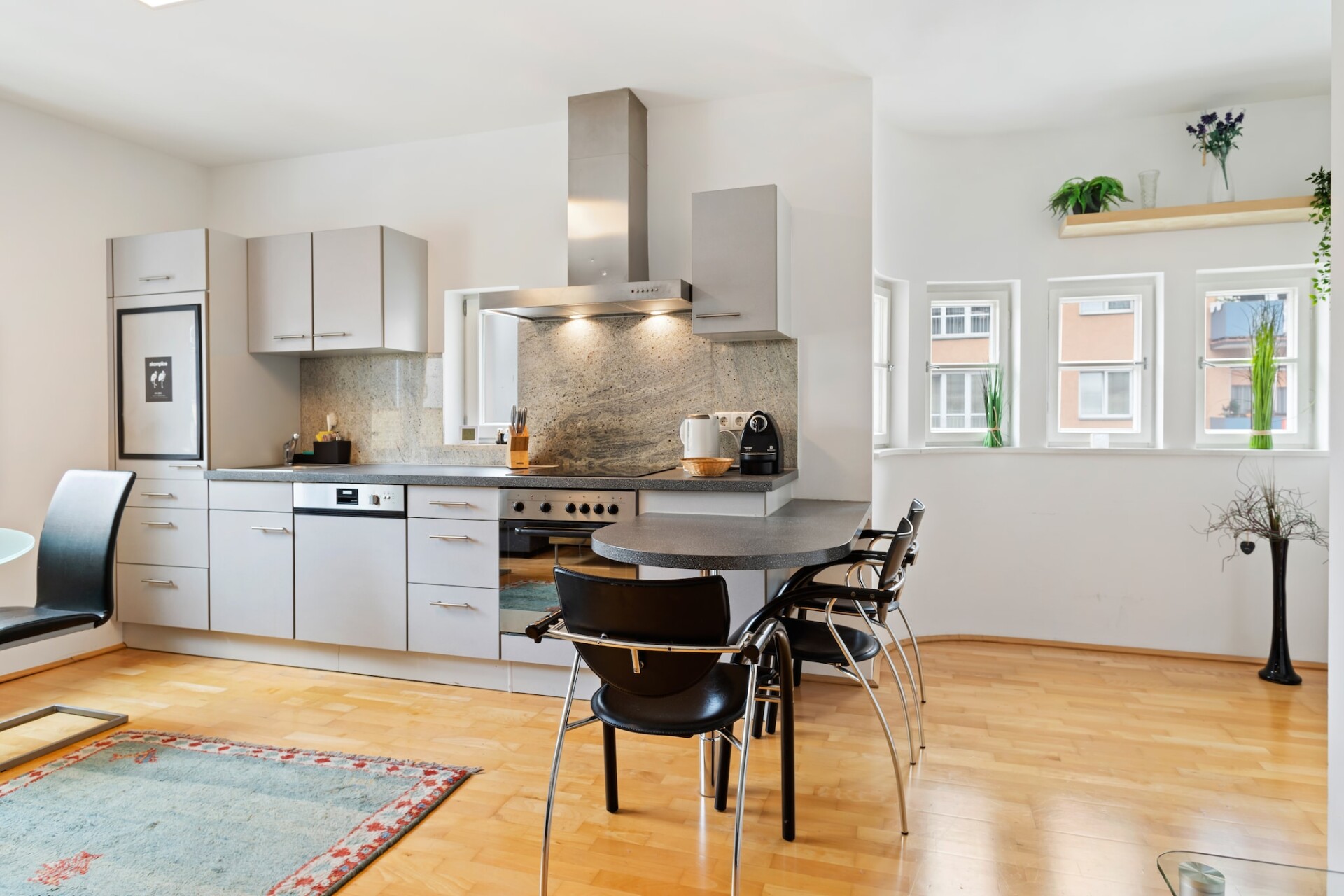 Het in zwart-wit ingerichte appartement in Innsbruck met 1 woon/slaapkamer en 1 slaapkamer is geschikt voor een klein gezin of een groep van 4 personen en is voorzien van klassieke houten vloeren. In de woonkamer kijk je naar je favoriete programma op de flatscreen tv. Een volledig uitgeruste keuken en wifi zijn beschikbaar.