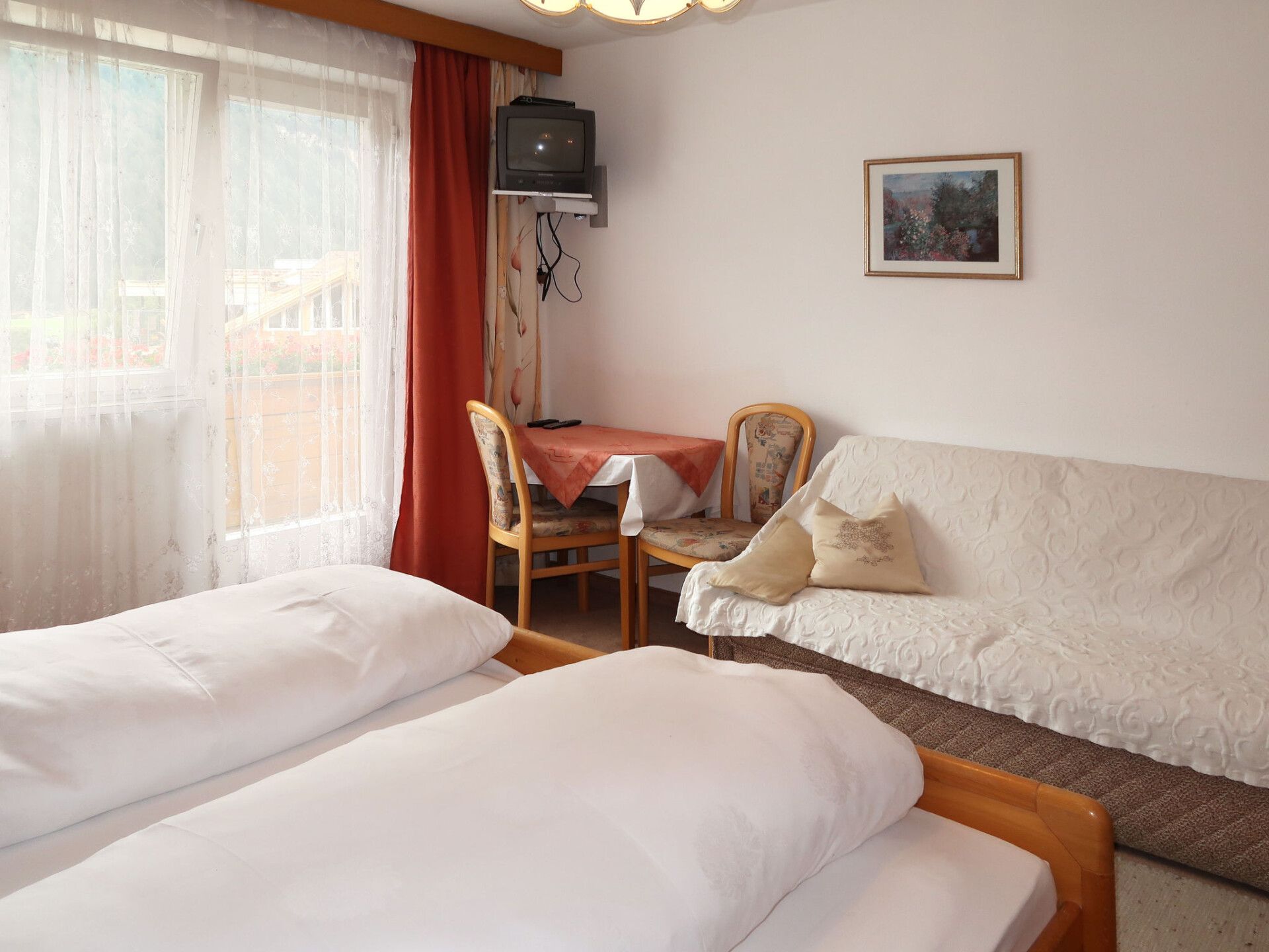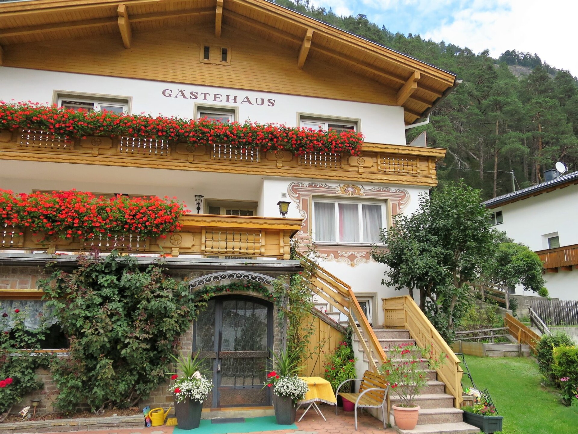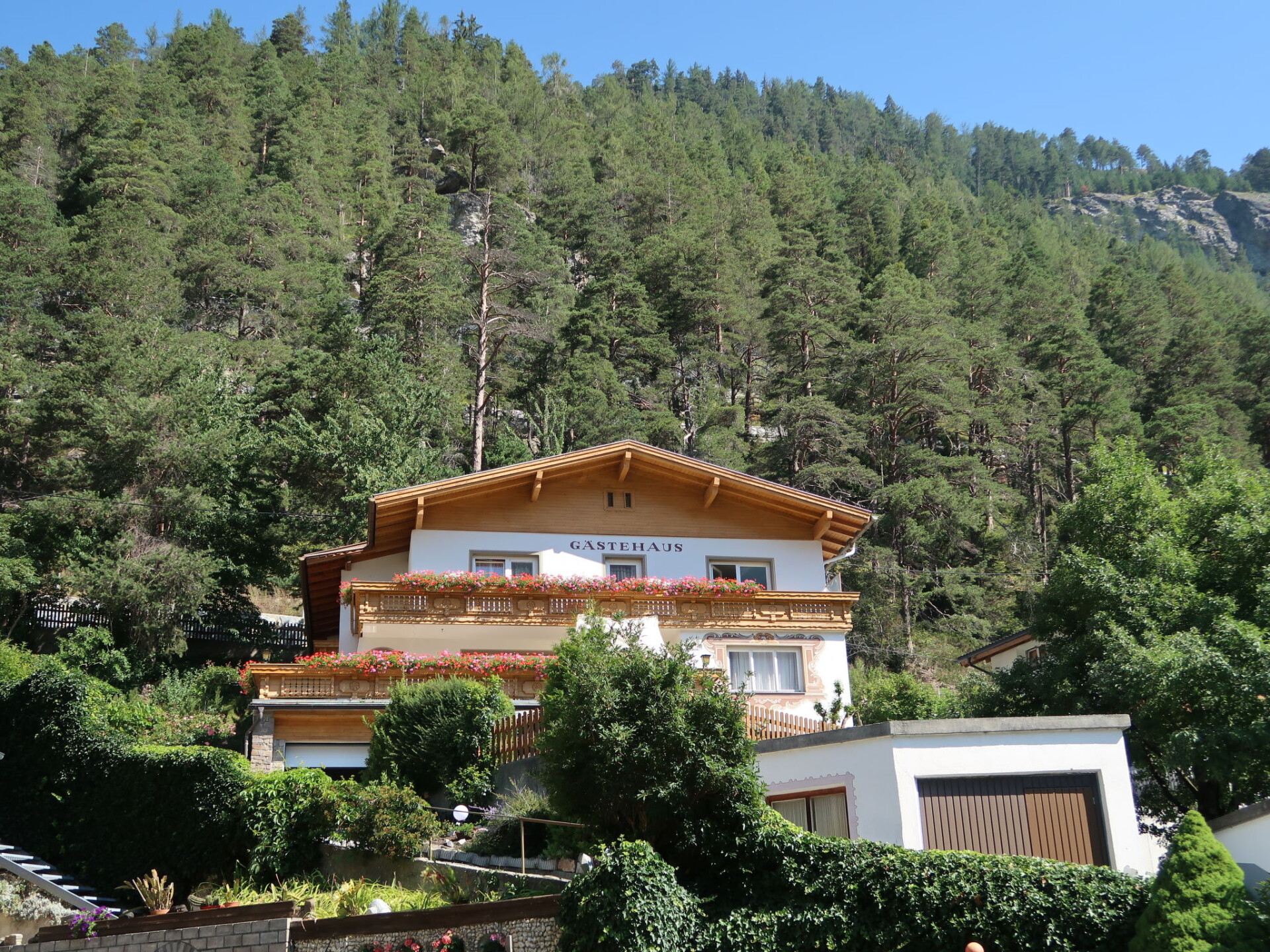 "Palman", huis 9-kamers 200 m2 op 3 verdiepingen, op het zuidoosten gelegen. Doelmatig en rustiek ingericht: groot woon-/eetkamer met eettafel, eethoek en Sat-TV. Keuken (oven, afwasmachine, 4 keramische glas kookplaten, broodrooster, waterkoker, magnetron, elektrische koffiemachine) met kleine eettafel. Douche/WC. Bovenverdieping: 1 2-pers. kamer met wintertuin met 1 2-pers bed, wastafel, douche/WC en Sat-TV. Uitgang naar de tuin. 2 2-pers. kamers, elke kamer heeft wastafel, douche/WC en Sat-TV. 2e Verdieping: 3 2-pers. kamers, elke kamer heeft wastafel, douche/WC en Sat-TV. Uitgang naar het balkon. 1 kamer met 1 bed en wastafel. 1 2-pers. kamer. Olie-verwarming. Vloerbedekking. 2 balkons, groot terras, zithoek in de tuin. Terrasmeubelen, balkonmeubilair. Mooi uitzicht op het dal, de plaats en Piz Buin. Ter beschikking: kinderstoel, kinderbed. Internet (Internet (WiFi), gratis). Als er minder dan het maximale aantal gasten in de accommodatie verblijft, zijn niet alle wooneenheden beschikbaar voor gebruik.