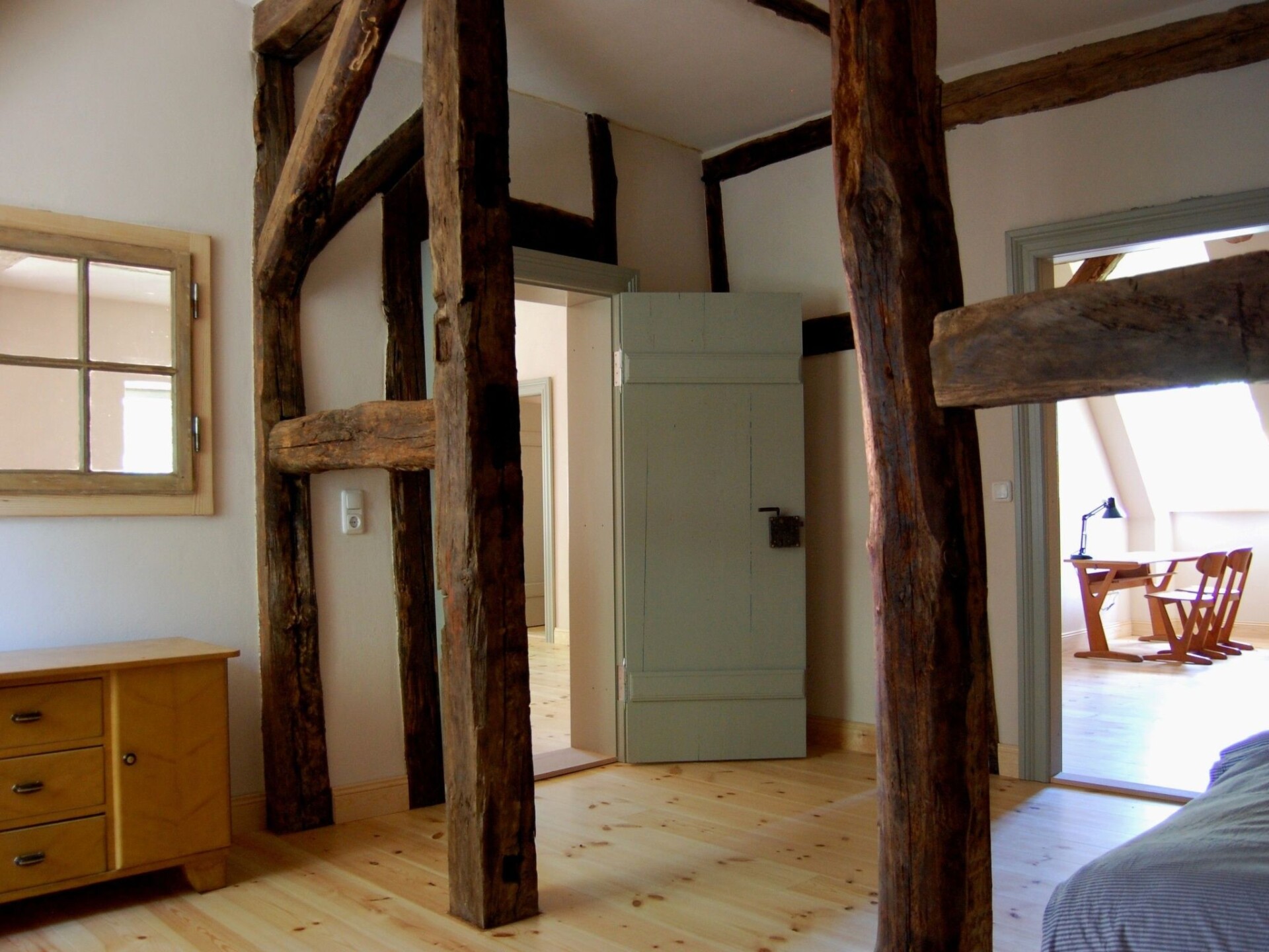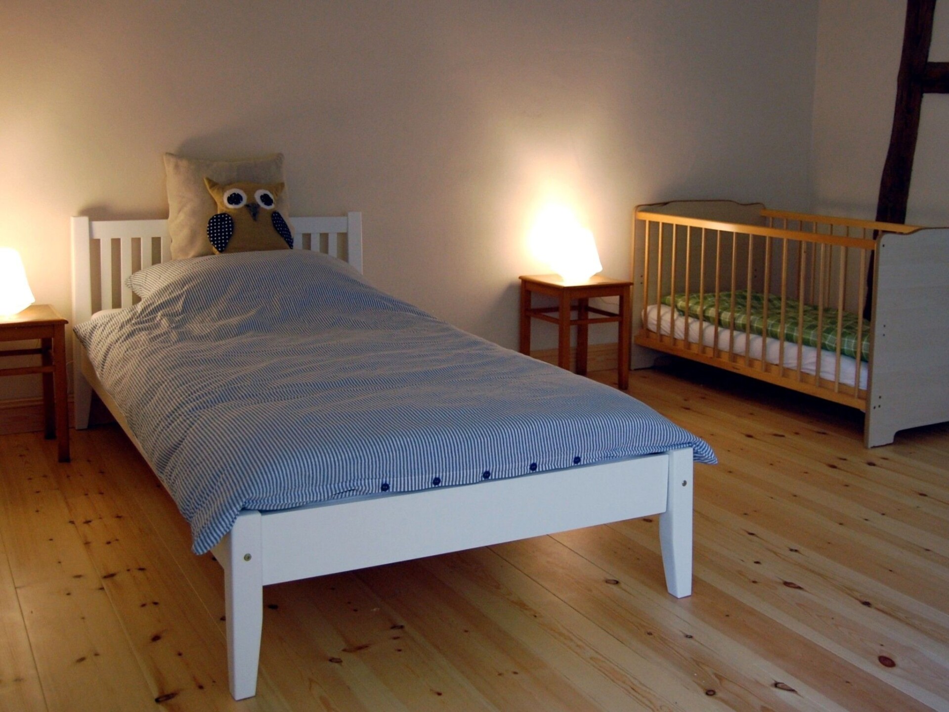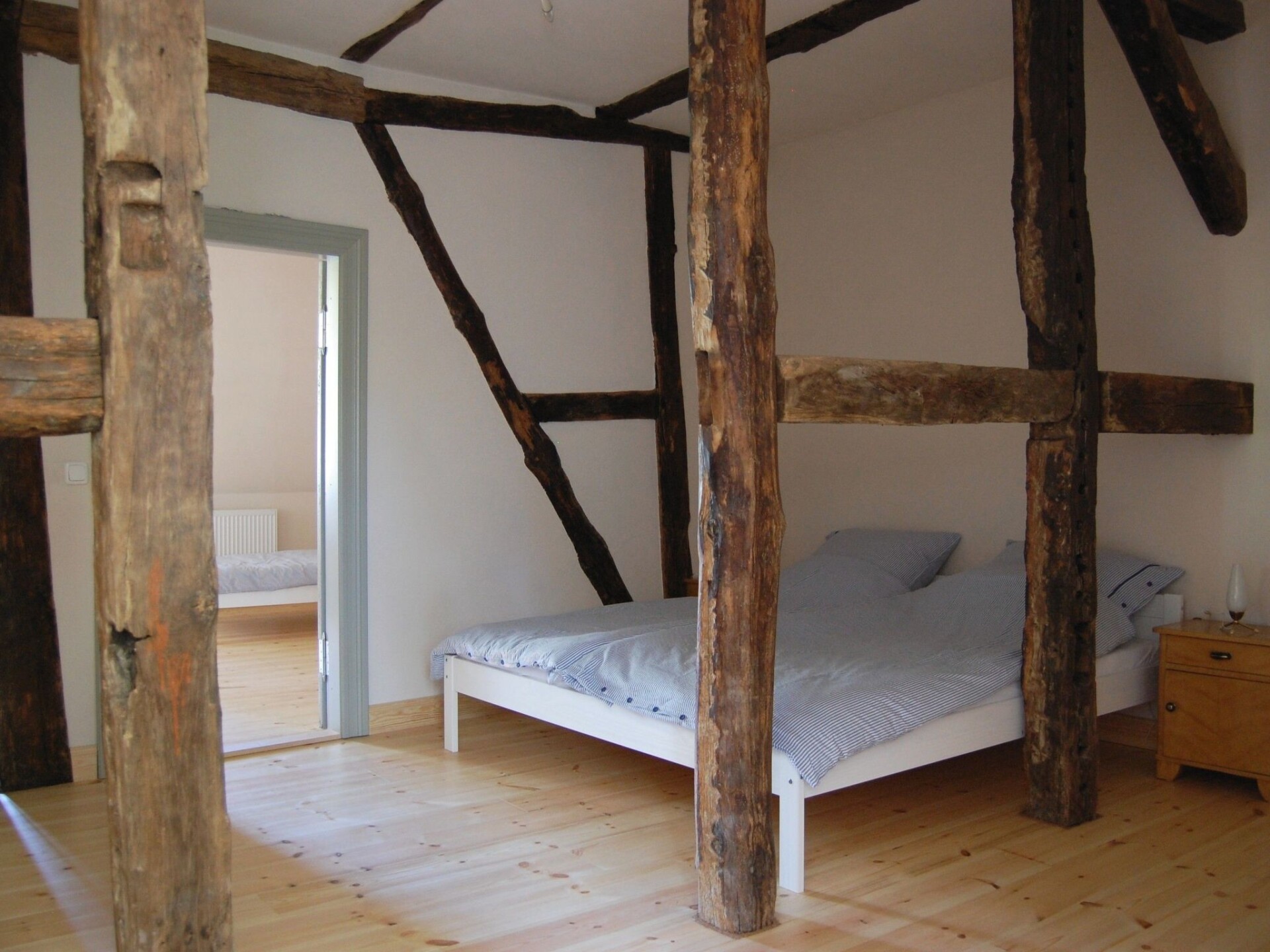 Maximaal 2 huisdieren/honden toegestaan. The accommodation is in a village with preserved old structures (church, manor house etc.), away from mass tourism by the Baltic Sea, where you can find peace and quiet but still get to the town and the beach within half an hour.The fully enclosed site measures 10,000m² and has a park-like character. There is a little herd of sheep in a separate area, which may be fed with bread. There are several shady or sunny spots with seating and loungers. A charcoal grill is available.The non-smoking apartment measures 85m² and can accommodate four people in two bedrooms. A child’s bed (for a toddler up to 2 years old) and a highchair can be provided. All the rooms have traditional wooden floorboards. One bedroom is furnished with a double bed (180 x 200cm), the other with two single beds (100 x 200cm). The kitchen is integrated into the very spacious living room.The house stands detached on a large site on the edge of the little village Petschow. All around, it is surrounded by meadows and fields. Those who like exercise outdoors have plenty of opportunity to do so. It is 2km to a swimming like by bike or car.Your apartment is in a historical listed building from 1743 that was renovated carefully and according to ecological standards in 2013. The Pastor Becker holiday apartment features the exposed beams of the original timber-framed structure.