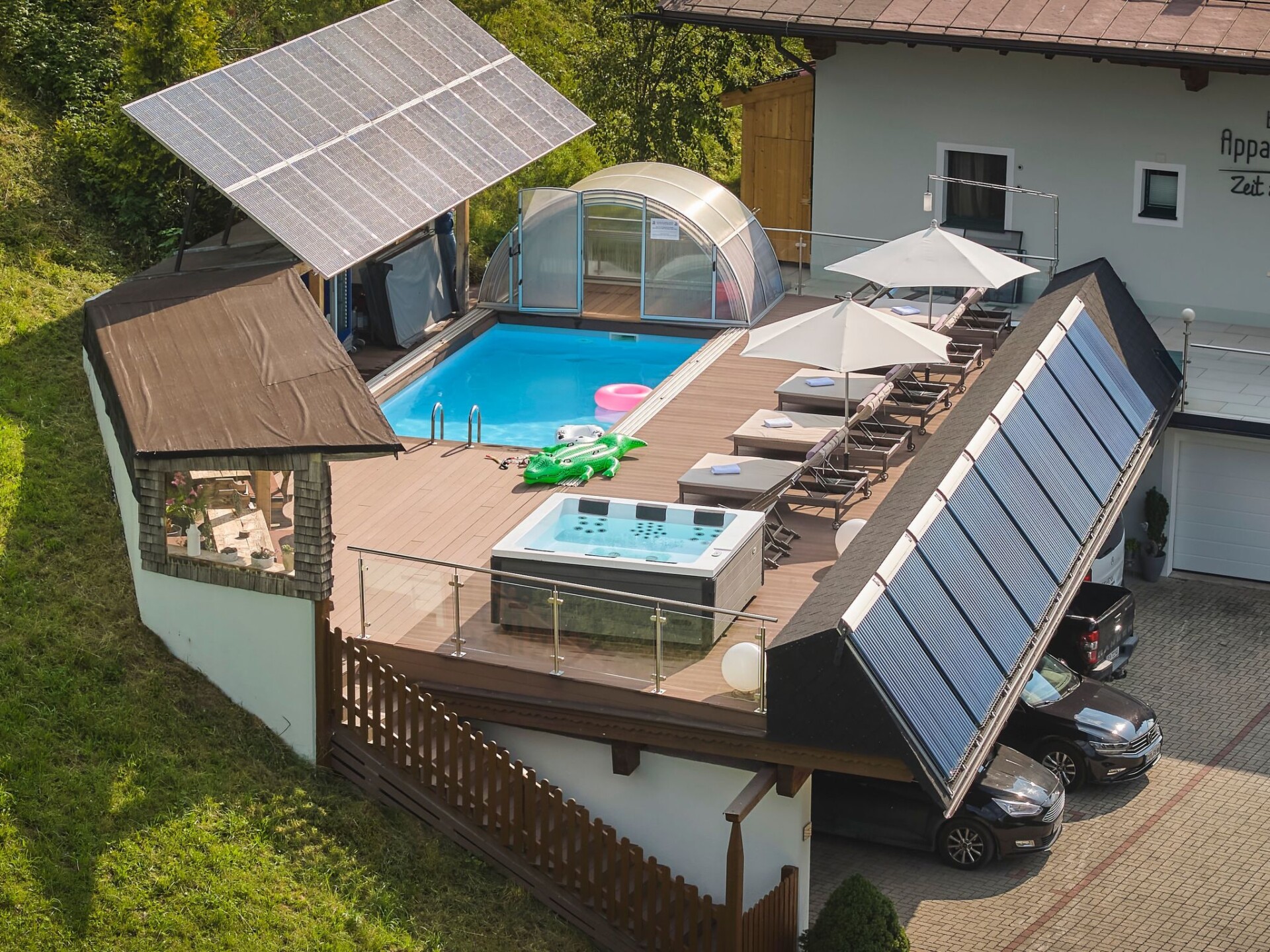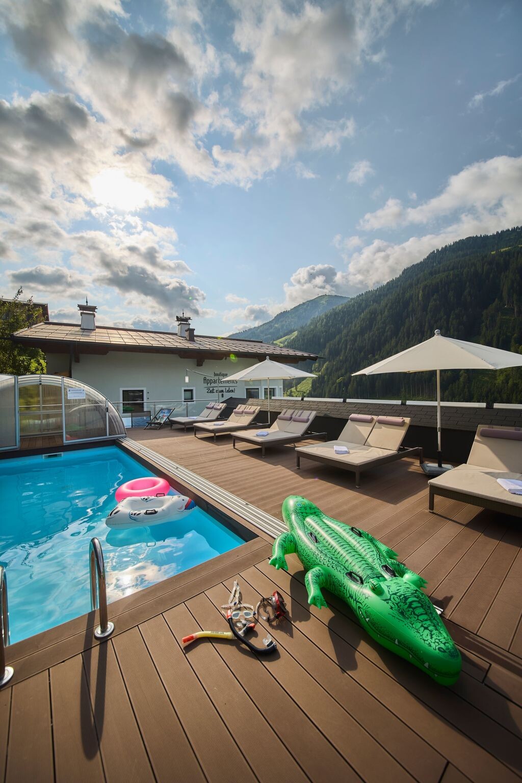 The exclusive holiday home with pool in the Alps impresses with a real mountain feeling and a fantastic view of the Saalbach-Hinterglemm valley. Joker Card included! Whether summer or winter - the boutique flats are the perfect place to take "time to live". Experience unique days together with your friends in our modern flats with whirlpool on the roof terrace and magnificent mountain views. Dogs are also very welcome here! The two holiday flats with shared pool deck are also the perfect place for a family holiday. The clearly laid out outdoor pool area and cosy seating areas invite you to spend wonderful hours together. Whether you want to play a round of ball games in the pool or simply relax on the loungers, our swimming pool area is the perfect place to spend the day. Not far from the flats is a true paradise for the whole family - the head of the valley with all its attractions, such as the high ropes course, suspension bridge and much more. The Joker Card is included in the price from May to the end of October. This card offers you numerous free benefits and discounts, including free use of the cable cars and buses in the region In winter, the Walleggalm shuttle bus takes you directly from the Boutique Apartments up to the Walleggalm or the piste for breakfast free of charge! From the flats, a ski route takes you directly to the Hochalmbahn and a separate piste back to the house.