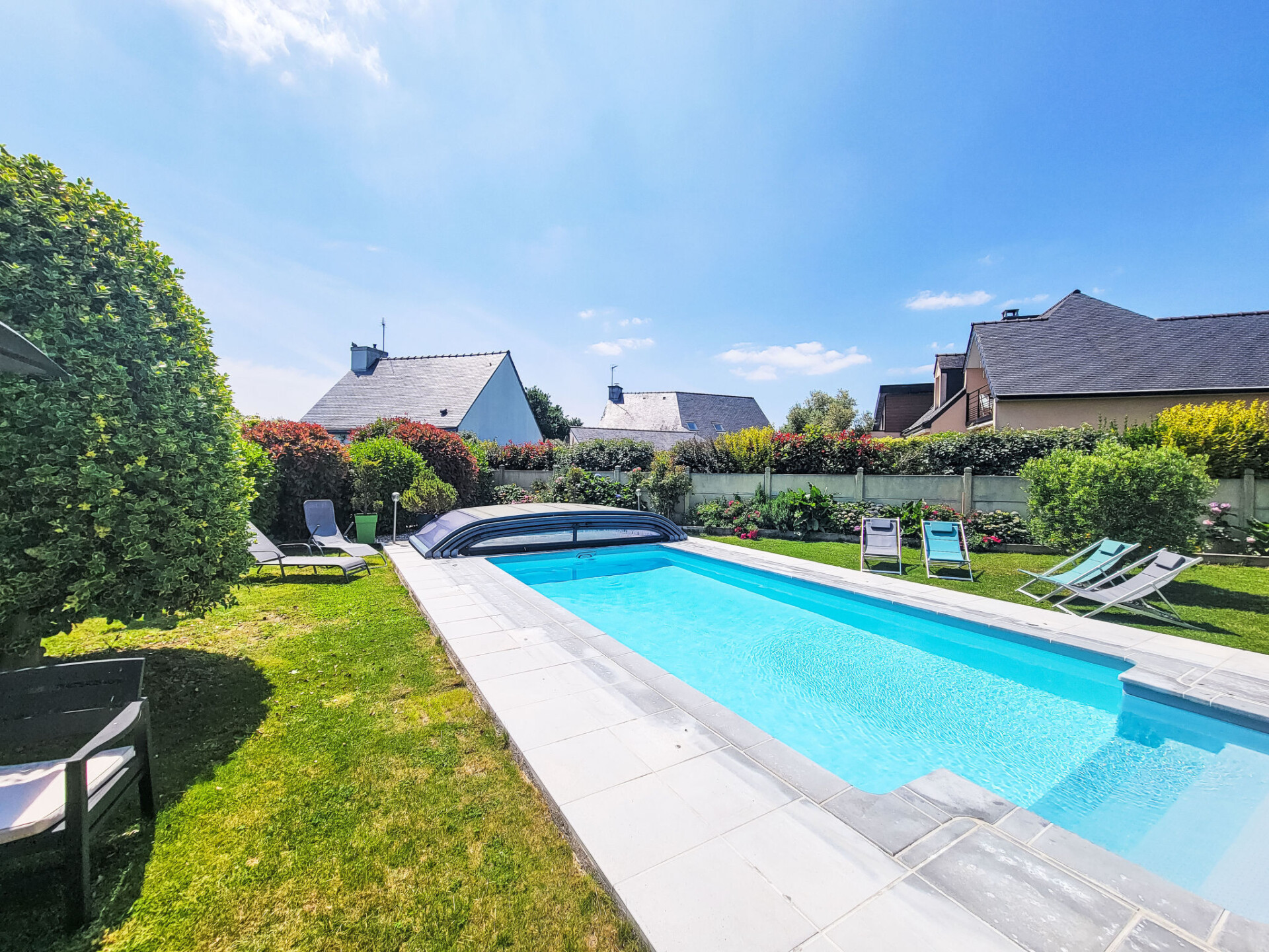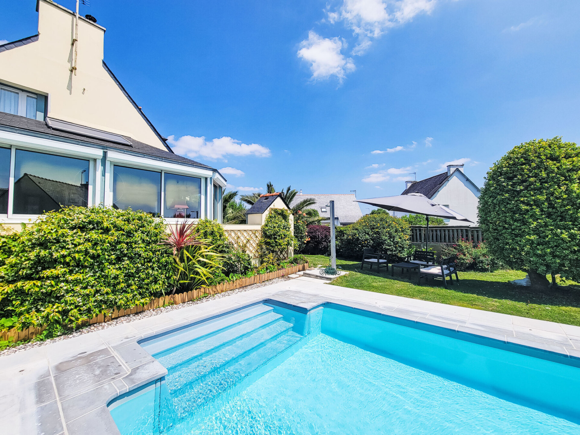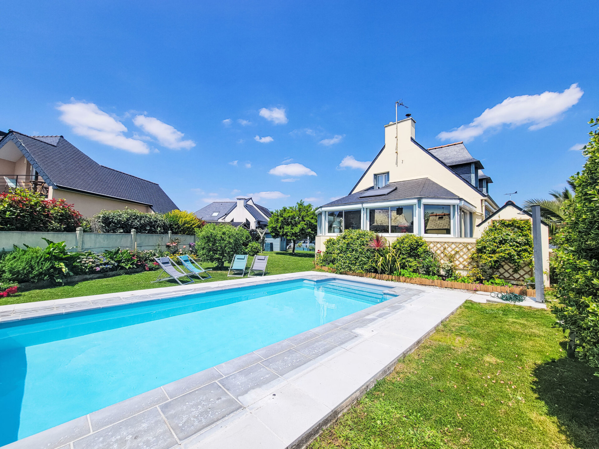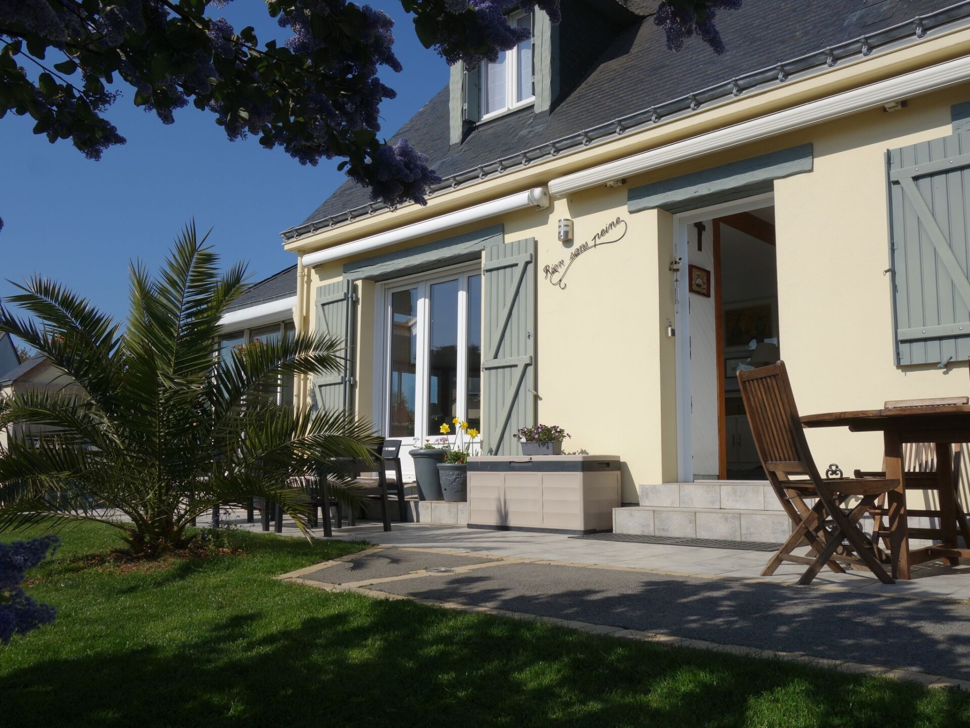 Saint Philibert 8 km van Carnac: Groot eengezinswoning "Phil'blue". In het centrum van Saint Philibert, 400 m van zee, 1 km van het strand. Voor alleengebruik: verzorgde tuin 1.000 m2 (omheind), overdekt zwembad hoekig, verwarmd, beveiligd (8 x 4 m, 140 - 160 cm diepte, seizoensgebonden beschikbaarheid: 01.Apr. - 19.Sep.). Buitendouche. In het huis: bergruimte voor fietsen. Levensmiddelenwinkel 400 m, supermarkt 2 km, restaurant 400 m, bakkerij 400 m, zandstrand "Men er Belleg ou Kernevest" 1.6 km, thermaalbad "Thalasothérapie Thalazur" 8 km. Golfterrein (18 holes) 12 km, zeilschool 1.6 km, manege 4 km. Attracties in de buurt: La Trinité Sur Mer 4 km, Carnac et ses alignements 8 km, Presqu'île de Quiberon 15 km, Vannes 35 km, Plage de Locmariaquer par voie cyclable 7 km, Belle ile en Mer, Houat, Hoedic. Wandelgebied Le Golfe du Morbihan.