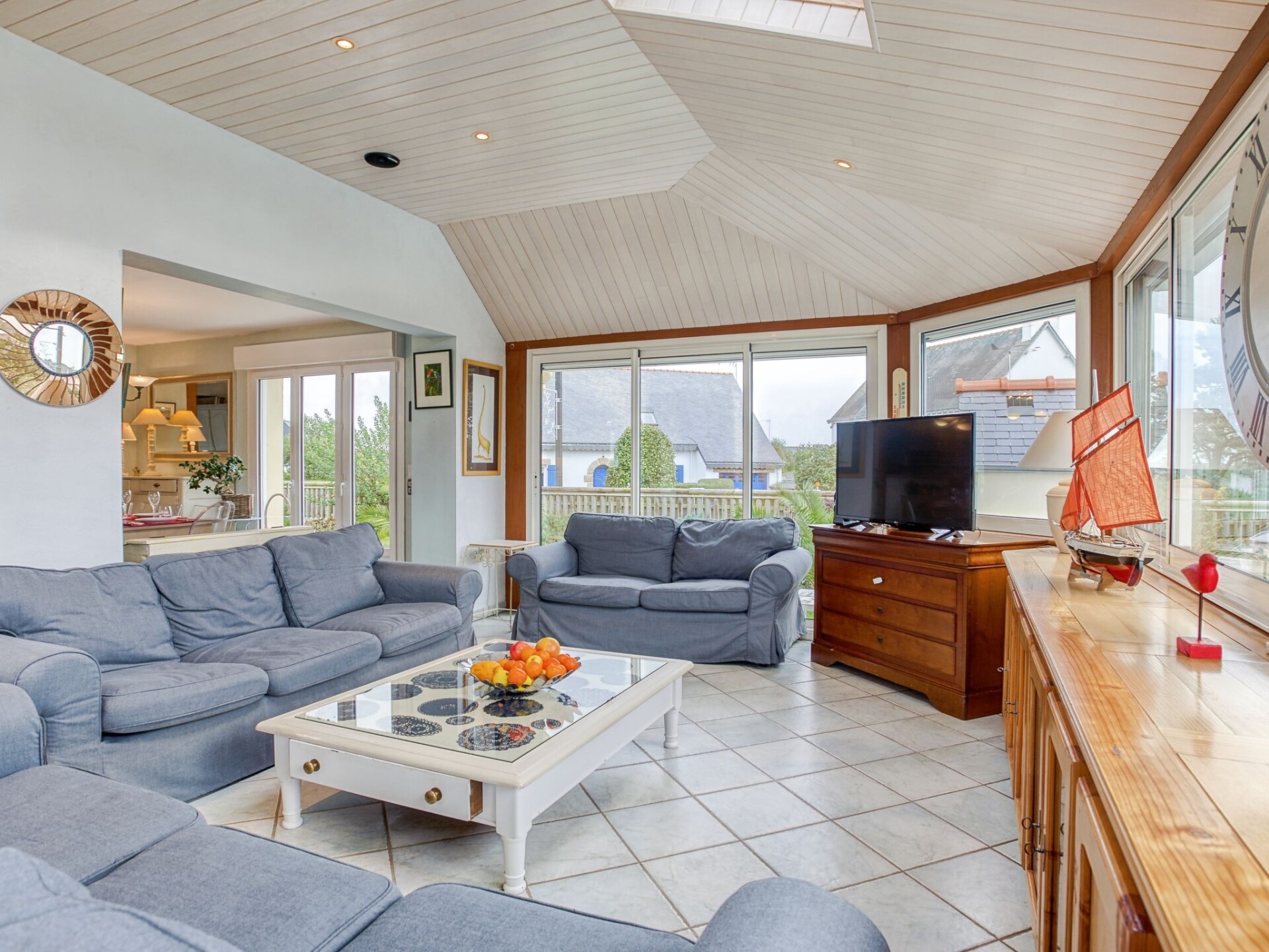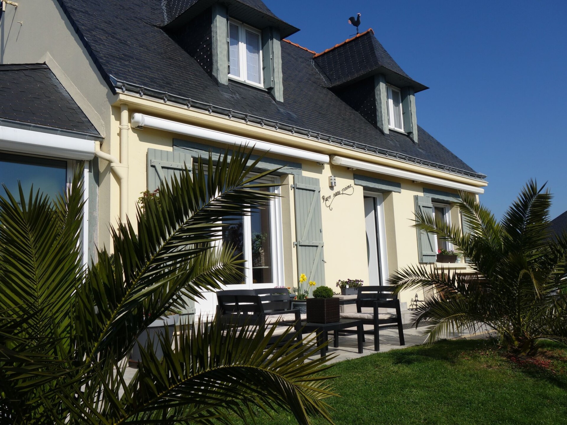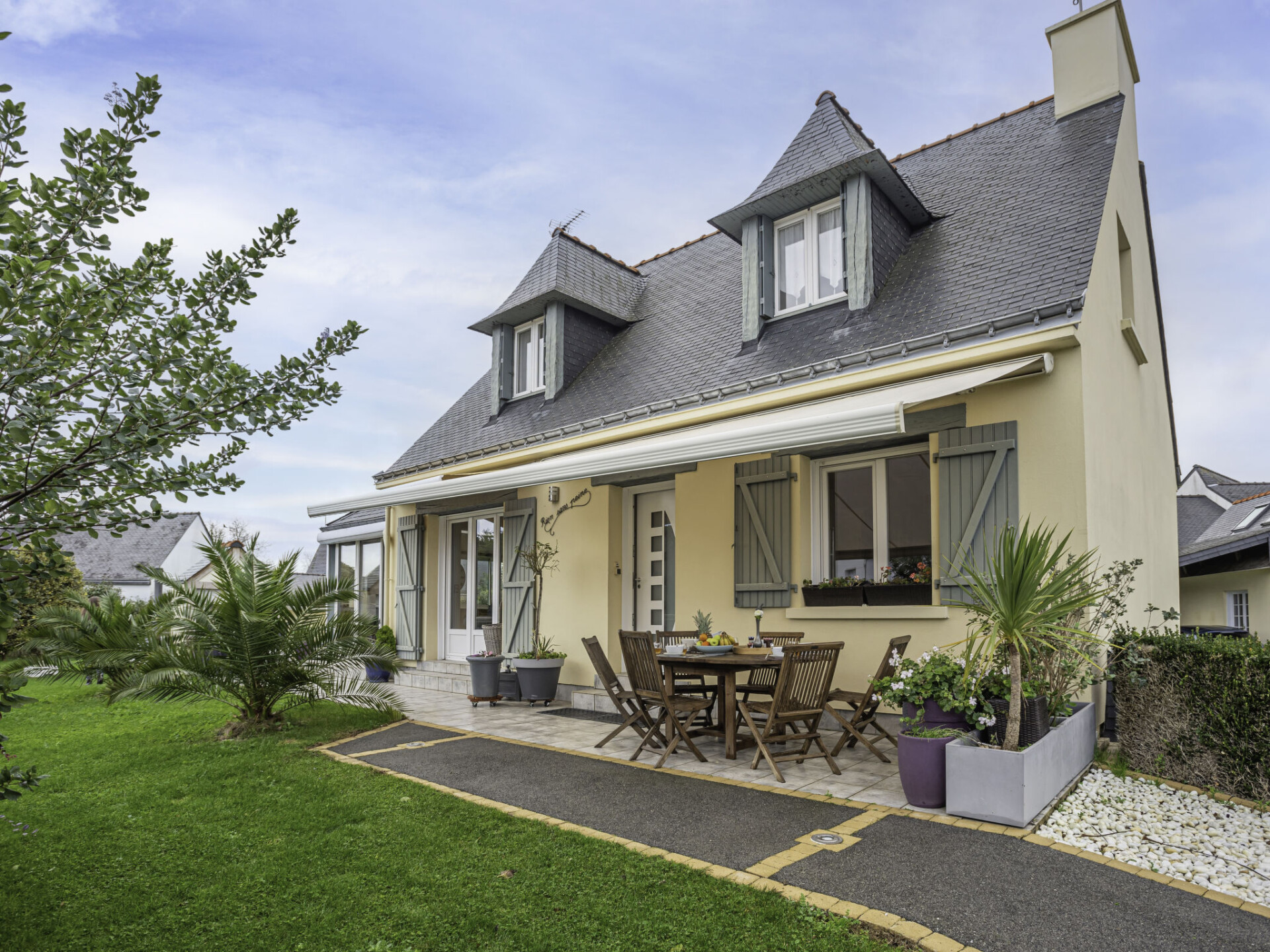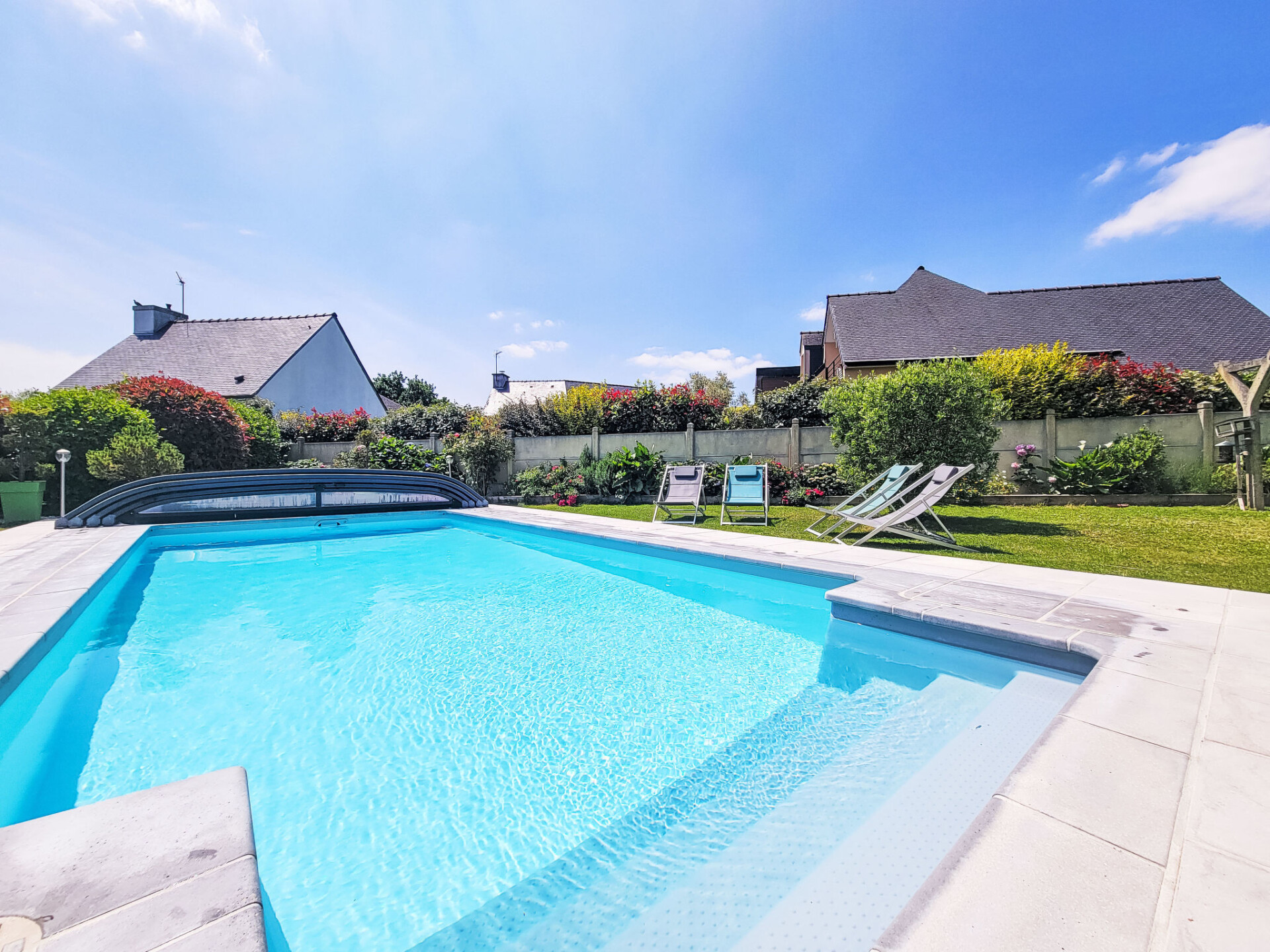 Saint Philibert 8 km van Carnac: Groot eengezinswoning "Phil'blue". In het centrum van Saint Philibert, 400 m van zee, 1 km van het strand. Voor alleengebruik: verzorgde tuin 1.000 m2 (omheind), overdekt zwembad hoekig, verwarmd, beveiligd (8 x 4 m, 140 - 160 cm diepte, seizoensgebonden beschikbaarheid: 01.Apr. - 19.Sep.). Buitendouche. In het huis: bergruimte voor fietsen. Levensmiddelenwinkel 400 m, supermarkt 2 km, restaurant 400 m, bakkerij 400 m, zandstrand "Men er Belleg ou Kernevest" 1.6 km, thermaalbad "Thalasothérapie Thalazur" 8 km. Golfterrein (18 holes) 12 km, zeilschool 1.6 km, manege 4 km. Attracties in de buurt: La Trinité Sur Mer 4 km, Carnac et ses alignements 8 km, Presqu'île de Quiberon 15 km, Vannes 35 km, Plage de Locmariaquer par voie cyclable 7 km, Belle ile en Mer, Houat, Hoedic. Wandelgebied Le Golfe du Morbihan.