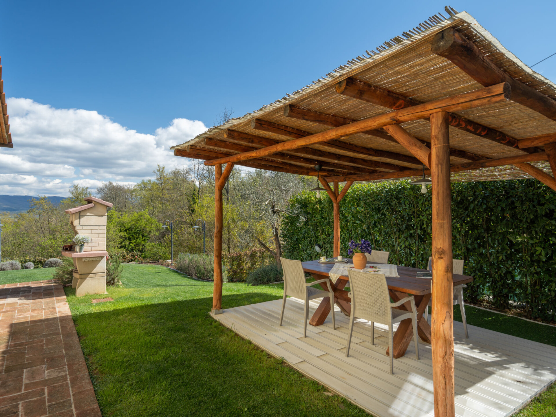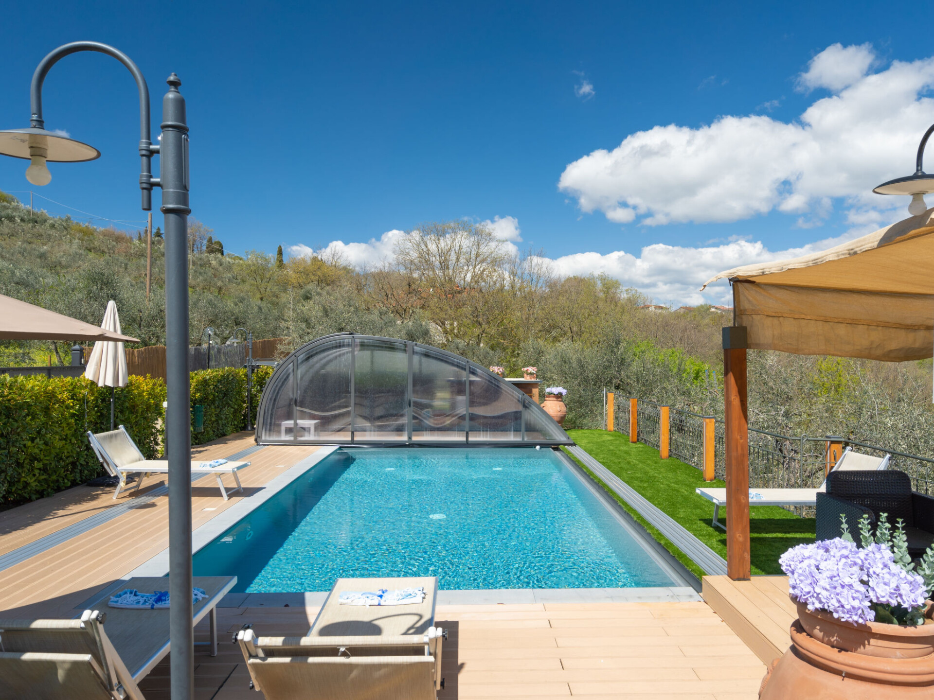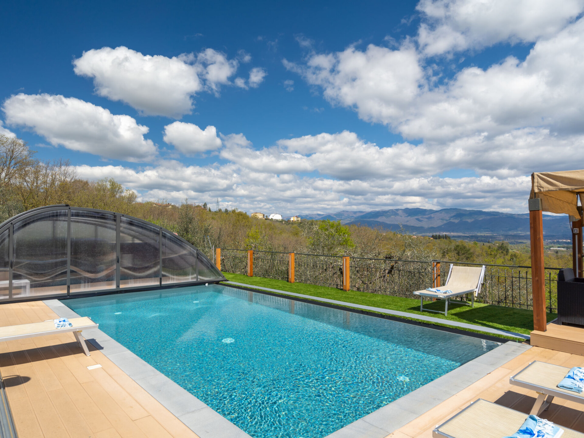 Comfortabele eengezinswoning "Pianelli". 1 km van het centrum van Pergine Valdarno, 15 km van het centrum van Arezzo, 40 km van het centrum van Siena, tegen een helling, te midden van groen. Voor alleengebruik: terrein 1.500 m2 (omheind), tuin op verschillende niveaus gazon en planten, openluchtzwembad verwarmd (8 x 4 m, seizoensgebonden beschikbaarheid: 10.Apr. - 25.Okt., extra). Buitendouche, prieel, terras, tuinmeubelen, barbecue, onderhoud zwembad door de eigenaar/tuinman. In het huis: sauna (extra). Hot tub (extra). Alarmsysteem. 500 m lange toegangsweg (onverharde weg). Parkeerplaats (voor 2 auto's) op het terrein. Oplaadstation. Supermarkt 1 km, bushalte 1 km. Attracties in de buurt: Arezzo 20 km, Firenze 65 km, Monte San Savino 29 km, Cortona 48 km, Castiglion Fiorentino 37 km. Bewaakt vakantiecomplex.