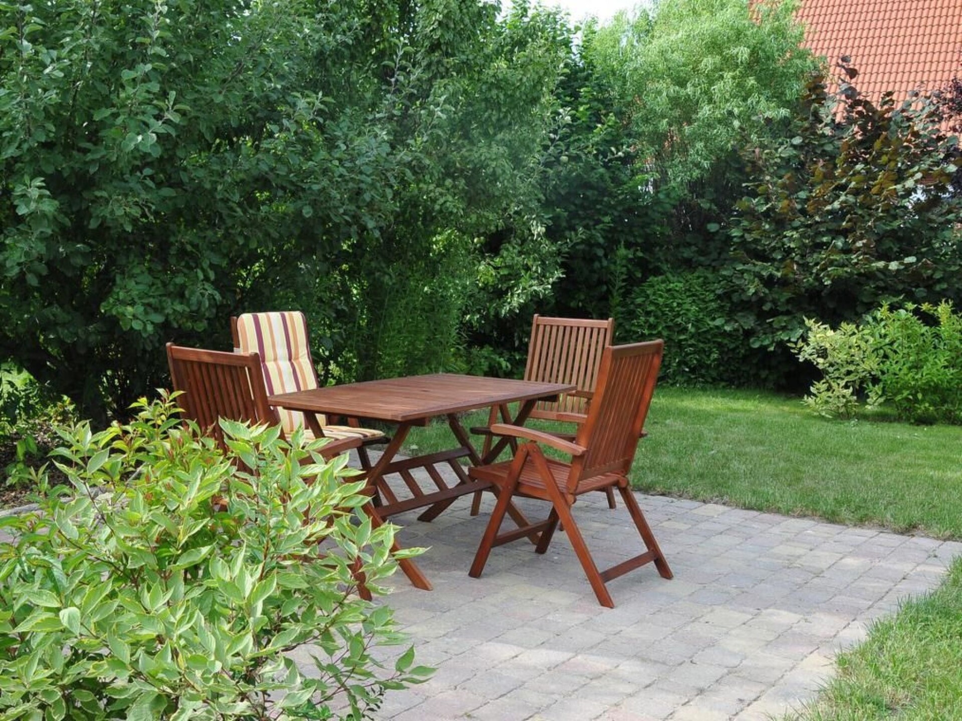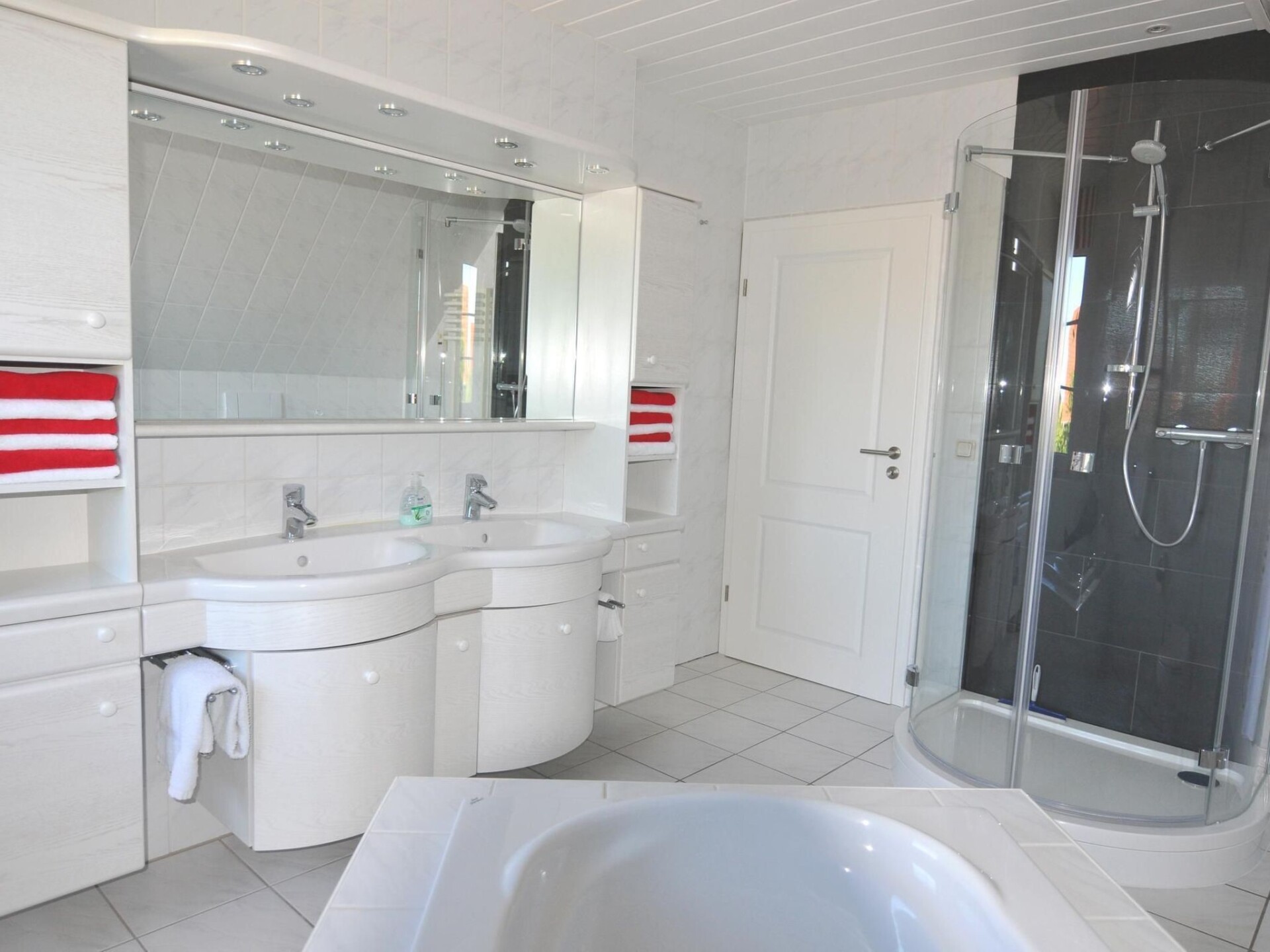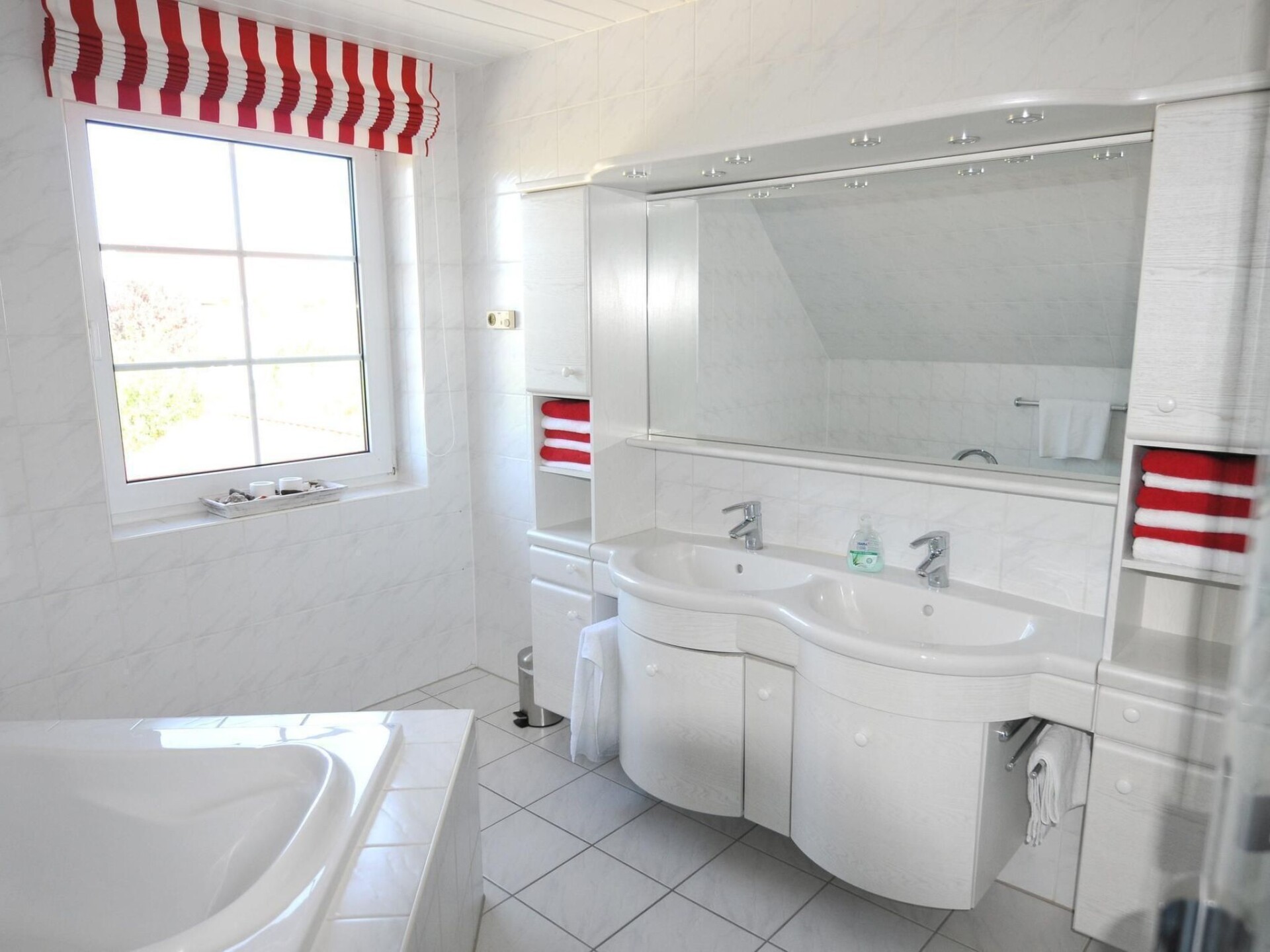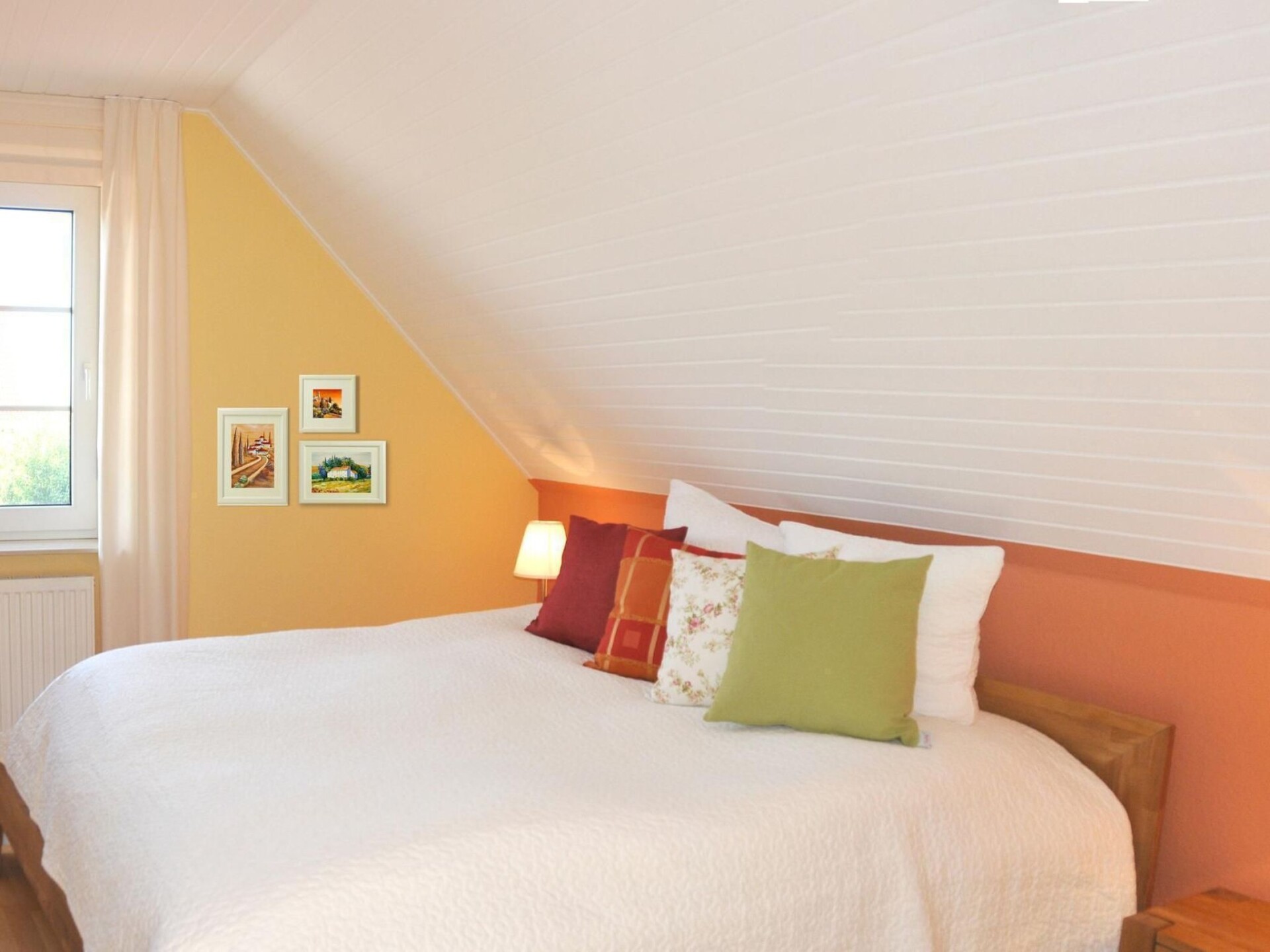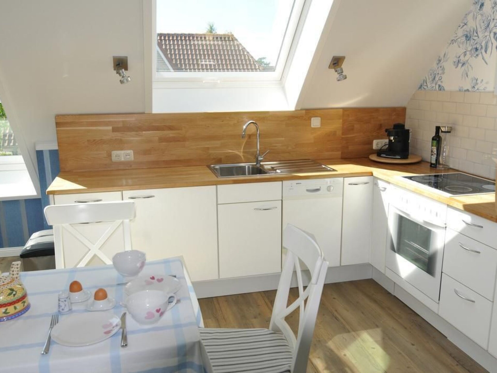 The bright and friendly flat on the upper floor of the house has all the comforts you could wish for in your temporary home. The self-contained flat with two bedrooms, large living/dining area with open-plan kitchen, a large, bright bathroom with underfloor heating, towel warmer, modern shower and large bathtub is also suitable for a shared flat with up to four people.The bright, spacious holiday flat in typical Nordic style is suitable for up to four people and its colours and patterns are reminiscent of the picturesque atmosphere of well-situated sailors' houses in the harbour towns along the Baltic coast. The living room is the centre of the flat. It is spacious and bright thanks to two large, air-conditioned skylights and offers a view of the garden. Here you can eat and relax together after an eventful day on holiday. The open-plan living room with kitchen and large, air-conditioned skylights with a view of the garden is the ideal place for your holiday breakfast if the weather doesn't allow you to use the garden. In the evening, the bright sofa invites you to relax in front of the large HD flat-screen TV. The fully equipped kitchen with hob, oven, extractor fan and dishwasher offers every convenience for cooking together on holiday. The two spacious bedrooms are equipped with roomy wardrobes and comfortable beds and can accommodate two people each. Warm colours like in Tuscany welcome you to the north-facing first bedroom with double bed. Leave your everyday worries behind and enjoy your holiday. The second bedroom is spacious and bright and welcomes its guests in the morning with a fresh Nordic holiday flair. The large luxury bathroom with underfloor heating, towel warmer, spacious, modern shower and extra-large bathtub is a wellness oasis in itself.