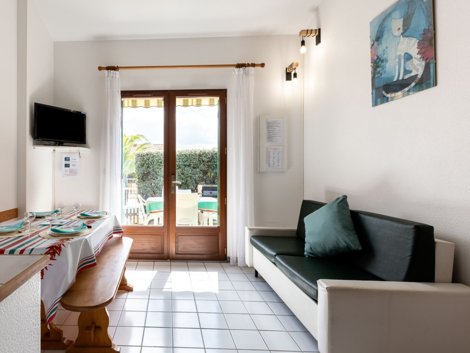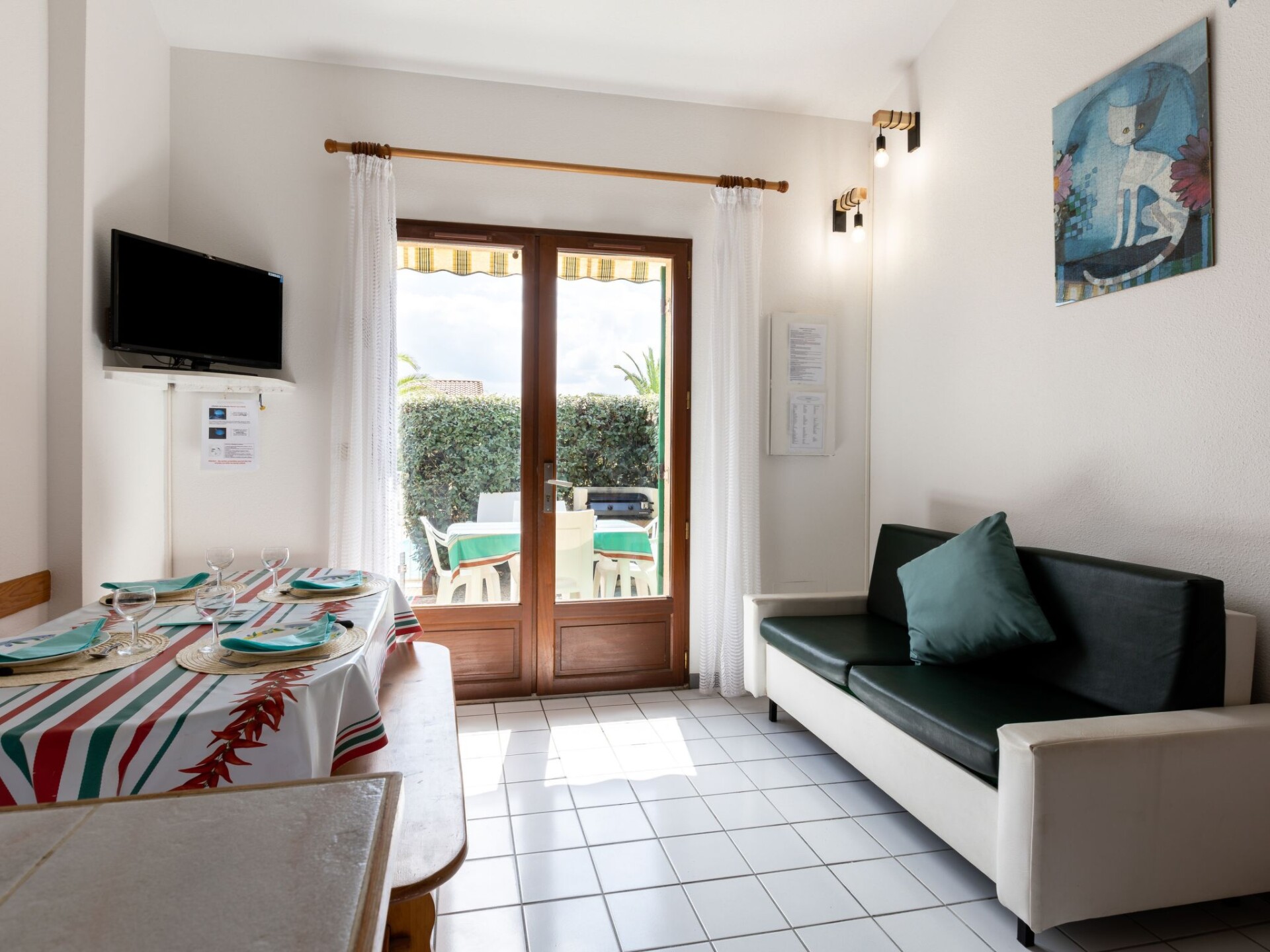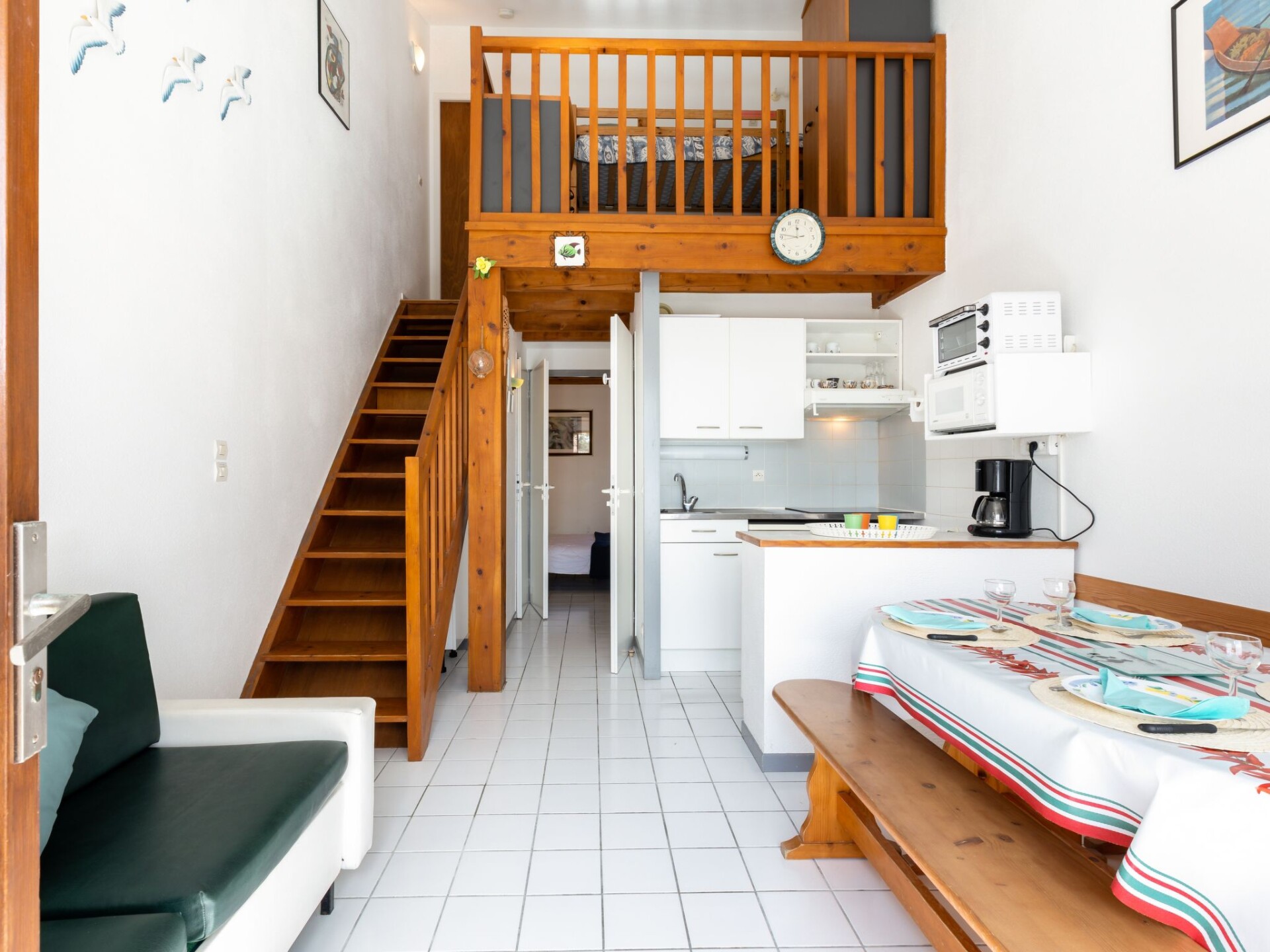 Huis in een rij 2-kamers 32 m2 op 2 verdiepingen. Woonkamer met TV. Uitgang naar het terras. 1 kamer met 1 2-pers bed (140 cm, lengte 190 cm). Kookhoek (2-pits kookplaat, mini-oven, afwasmachine, magnetron). Badkamer, aparte WC. Elektrische verwarming. Bovenverdieping: galerij met 1 x 2 stapelbedden. Ter beschikking: Internet (Internet (WiFi), extra). Rookmelders. In plaats van een afgesloten slaapkamer bevinden sommige slaapgedeeltes zich in een open ruimte (galerij, nis, etc.). 40065000129IR