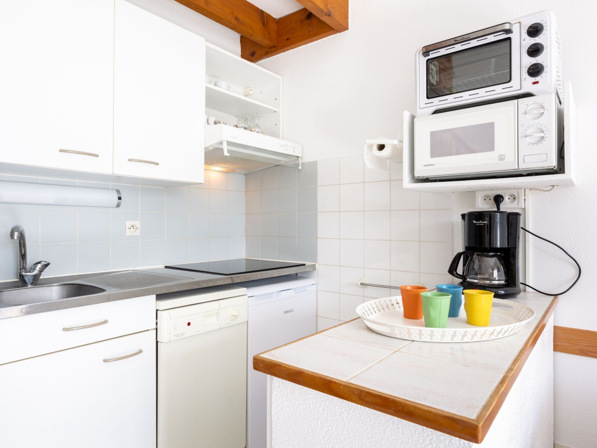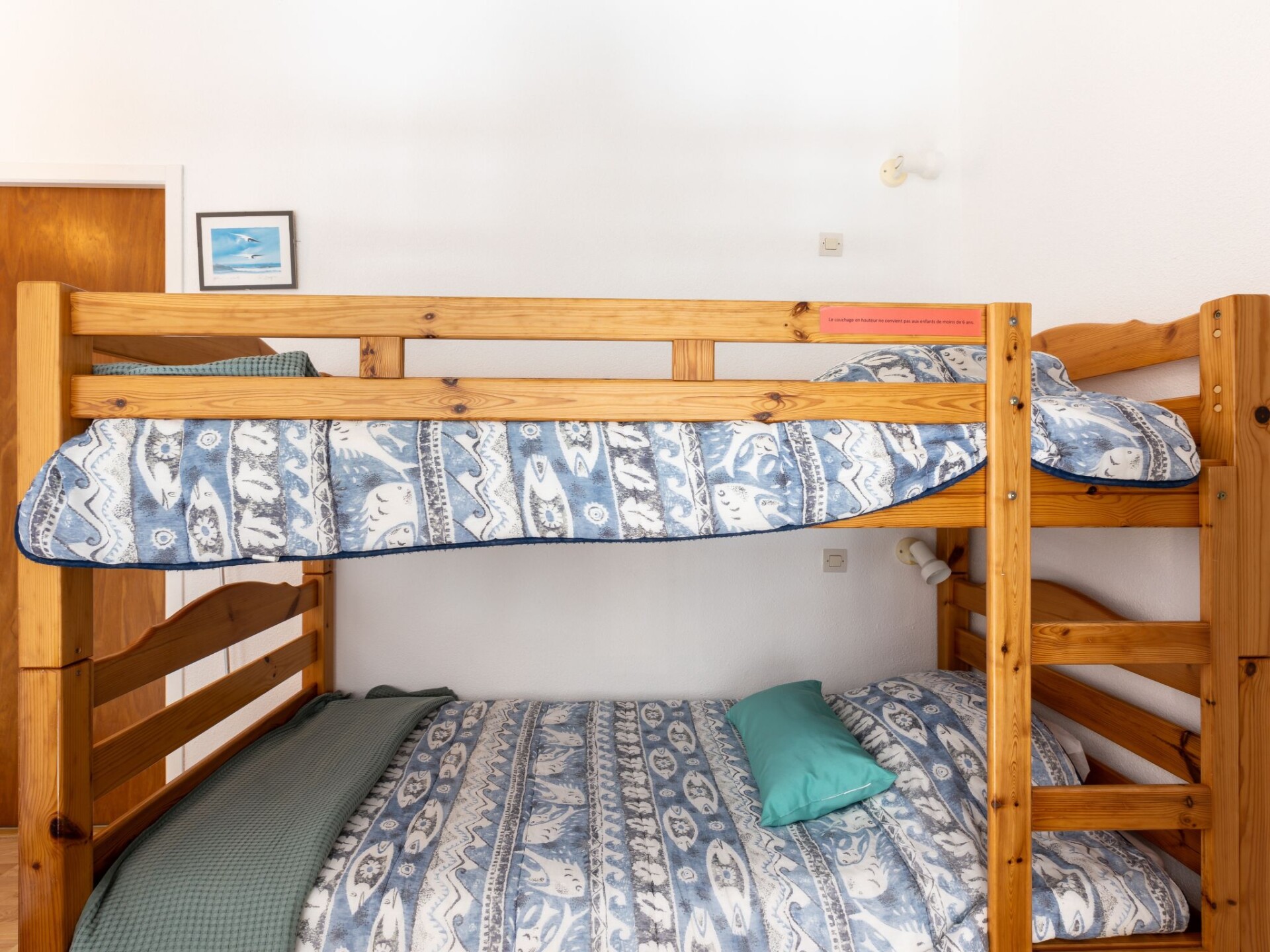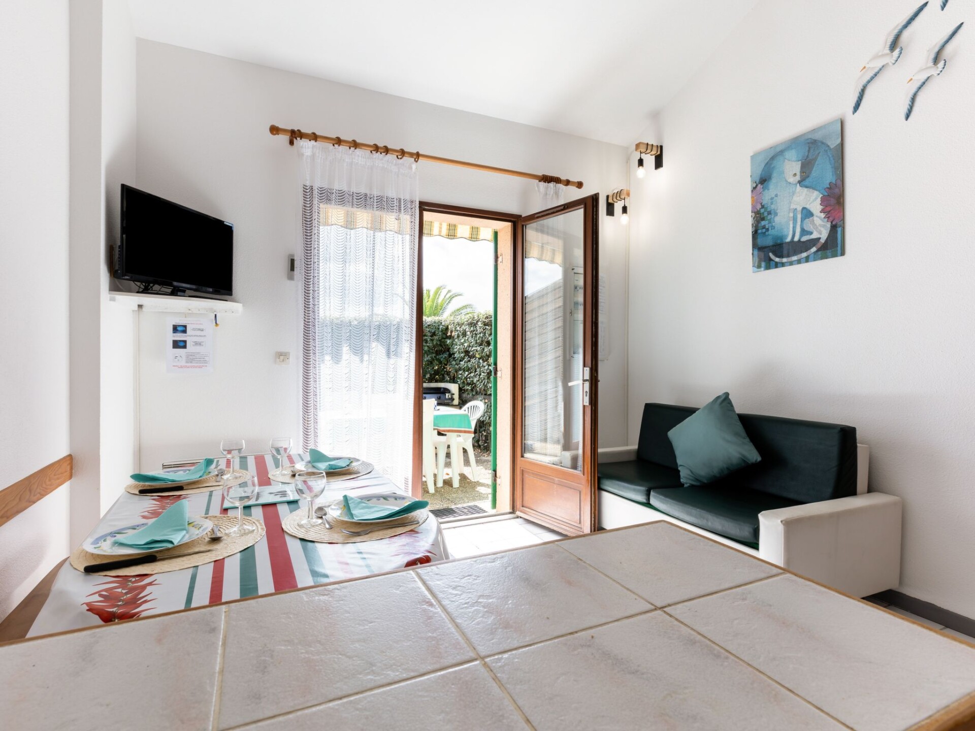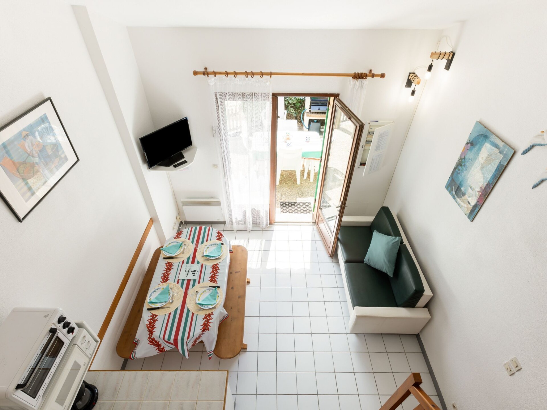 Huis in een rij 2-kamers 32 m2 op 2 verdiepingen. Woonkamer met TV. Uitgang naar het terras. 1 kamer met 1 2-pers bed (140 cm, lengte 190 cm). Kookhoek (2-pits kookplaat, mini-oven, afwasmachine, magnetron). Badkamer, aparte WC. Elektrische verwarming. Bovenverdieping: galerij met 1 x 2 stapelbedden. Ter beschikking: Internet (Internet (WiFi), extra). Rookmelders. In plaats van een afgesloten slaapkamer bevinden sommige slaapgedeeltes zich in een open ruimte (galerij, nis, etc.). 40065000129IR