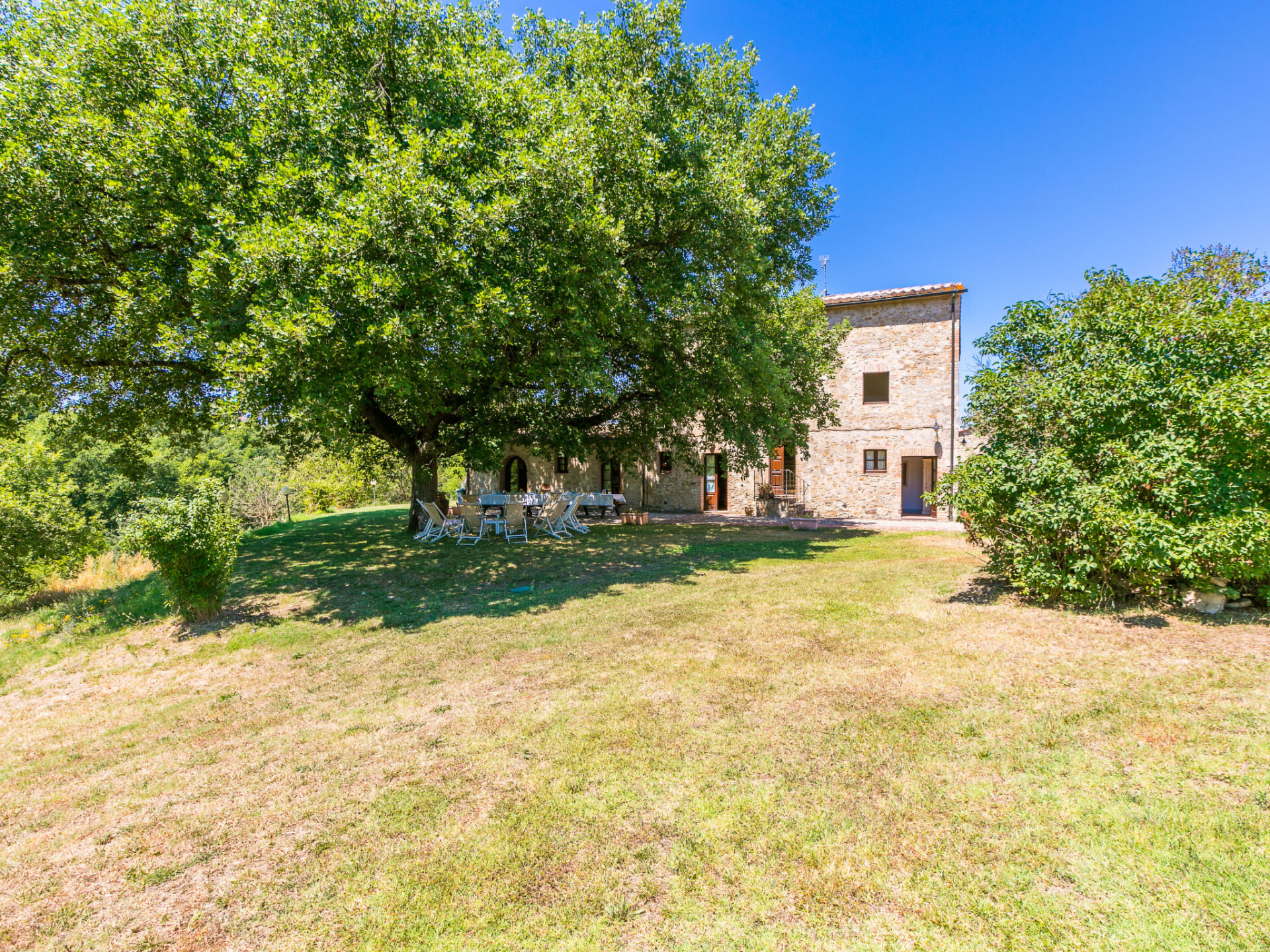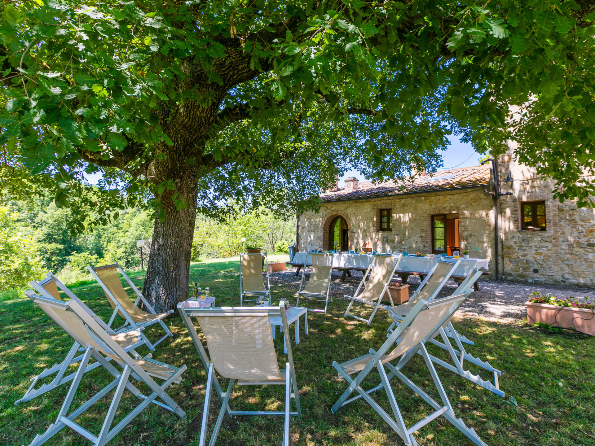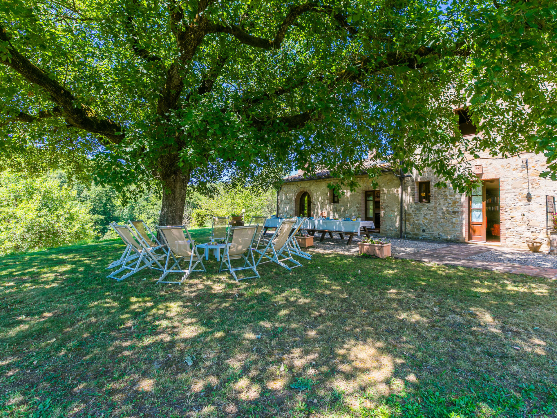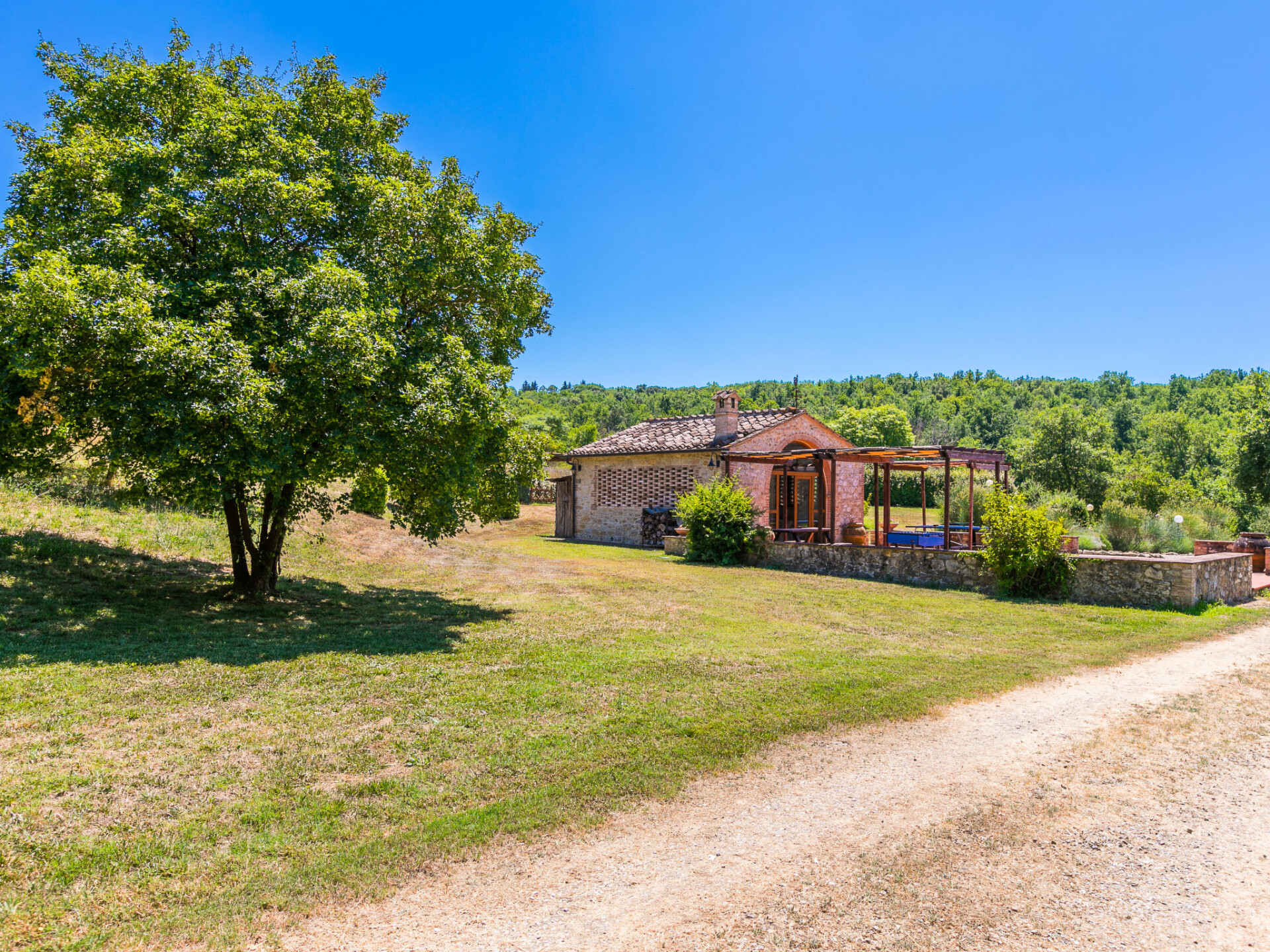 Colle di Val d'Elsa: Groot, comfortabele cottage "Podere San Giuseppe", omgeven door bomen. Huurobject bestaande uit hoofd-/ bijgebouw, 7 km van het centrum van Colle di Val d'Elsa, geïsoleerde, zonnige ligging, 100 m van de bosrand, te midden van groen. Voor alleengebruik: wild terrein, tuin, openluchtzwembad omheind (6 x 12 m, seizoensgebonden beschikbaarheid: 15.Mei. - 30.Sep.). Buitendouche, poolhouse, tafeltennis, patio, terras, tuinmeubelen, barbecue, onderhoud zwembad door de eigenaar/tuinman. In het huis: centrale verwarming, air-conditioning. 1 km lange rommelige toegangsweg. Parkeerplaats bij het huis op het terrein. Bushalte "Colle di Val d'Elsa" 7 km. Auto noodzakelijk. Baby uitrusting (incl.). Groepen jongeren uitsluitend op aanvraag. Geschikt voor evenementen.