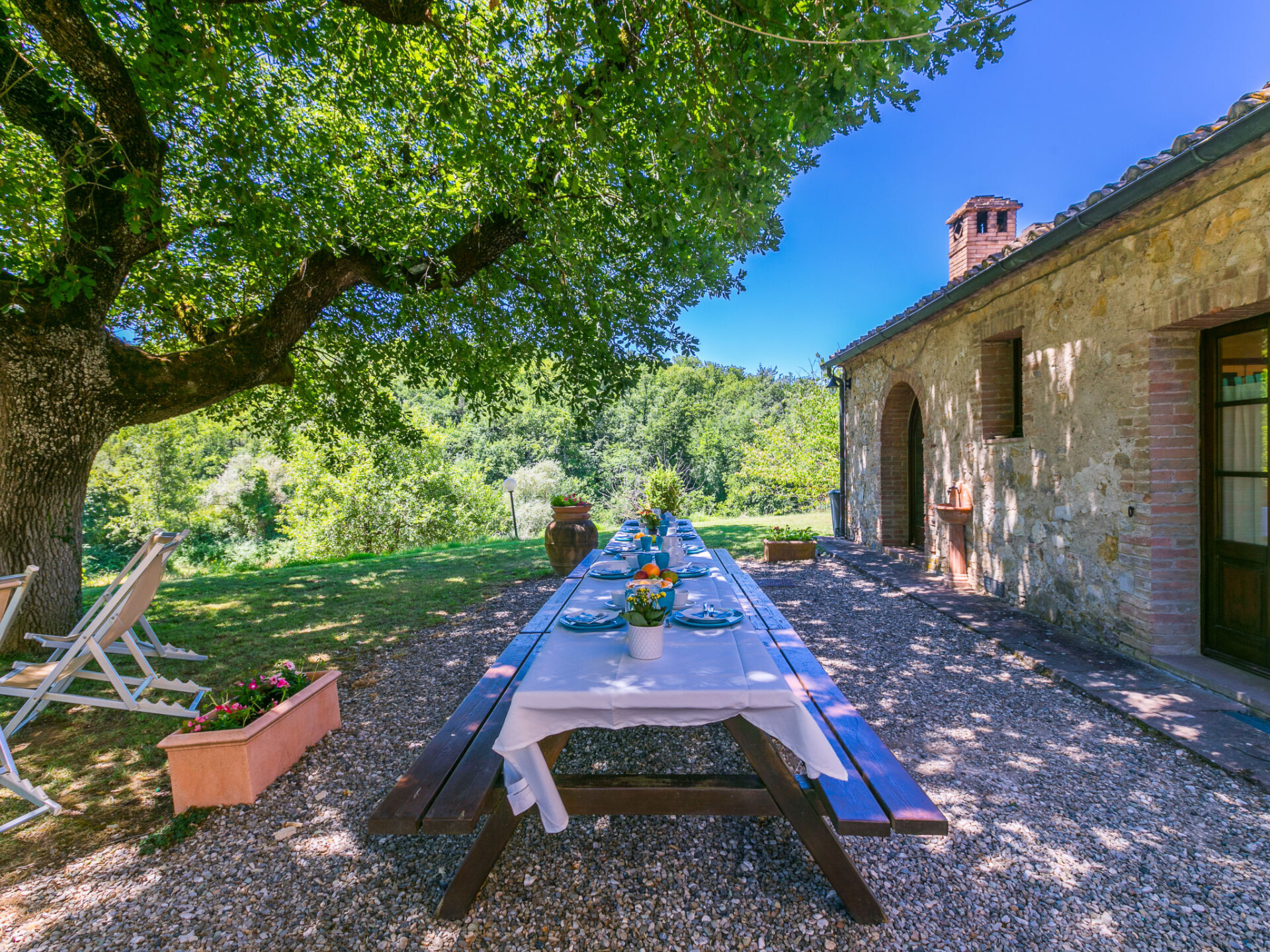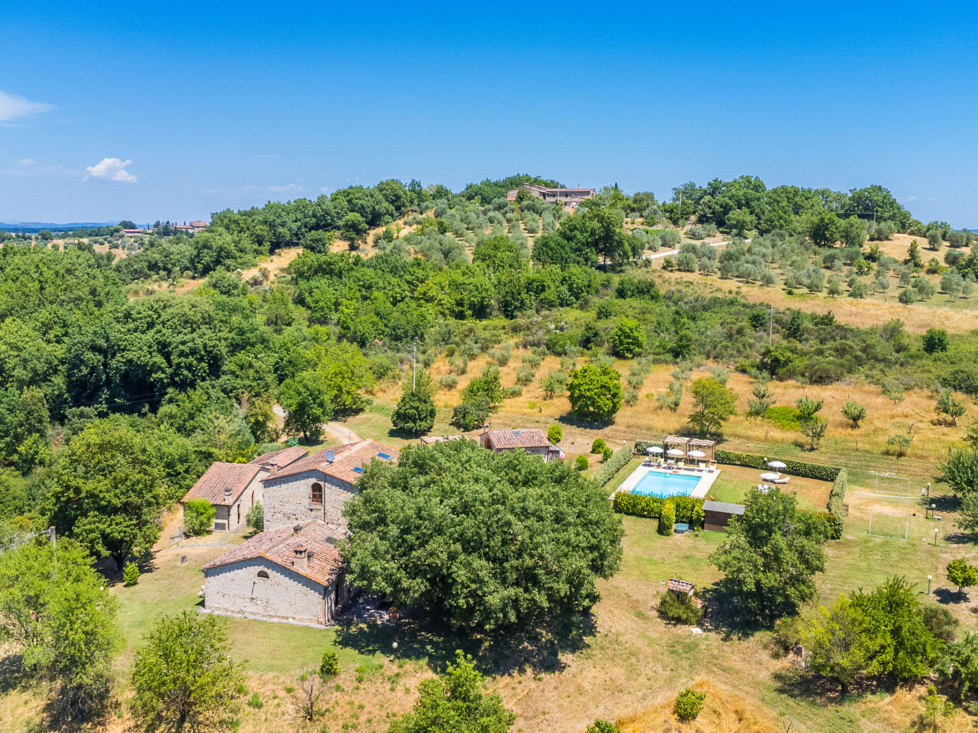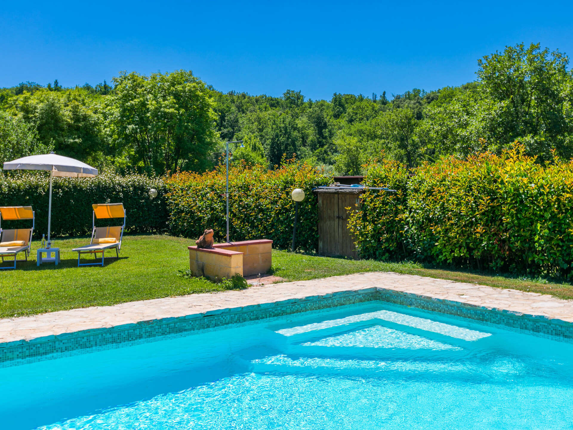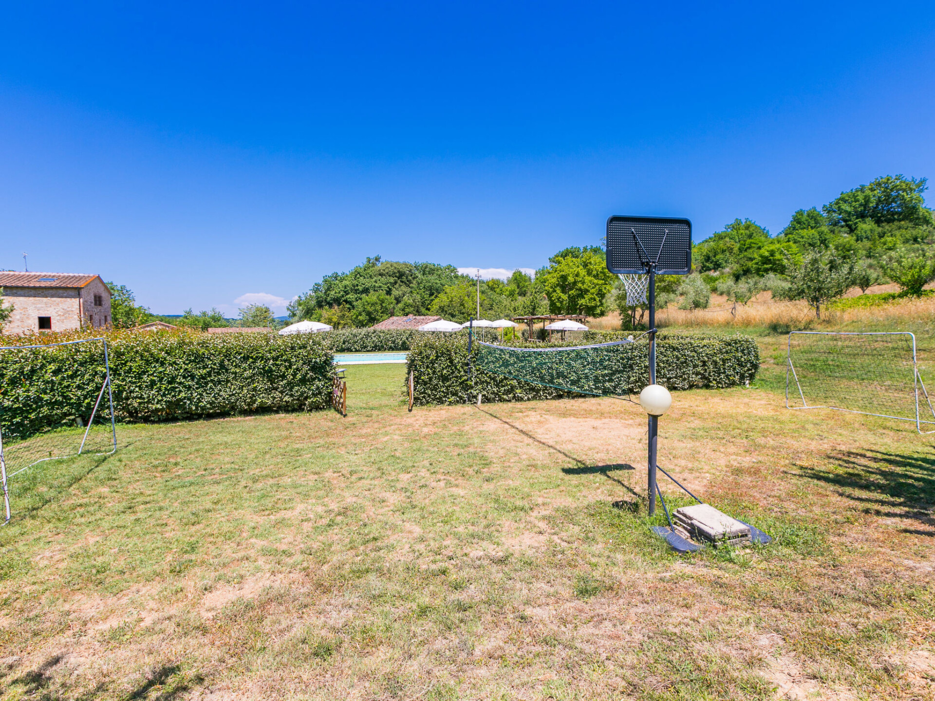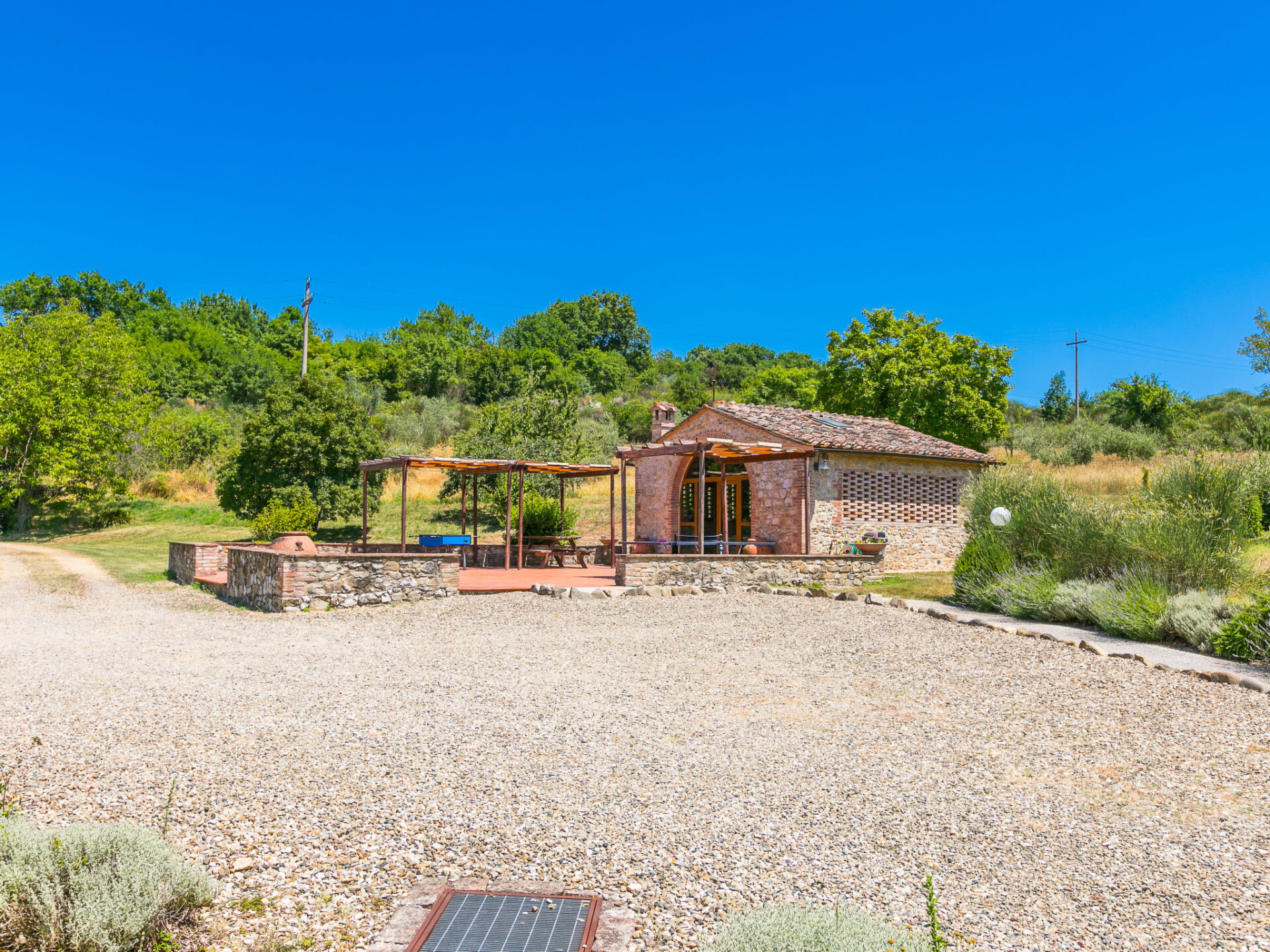 Colle di Val d'Elsa: Groot, comfortabele cottage "Podere San Giuseppe", omgeven door bomen. Huurobject bestaande uit hoofd-/ bijgebouw, 7 km van het centrum van Colle di Val d'Elsa, geïsoleerde, zonnige ligging, 100 m van de bosrand, te midden van groen. Voor alleengebruik: wild terrein, tuin, openluchtzwembad omheind (6 x 12 m, seizoensgebonden beschikbaarheid: 15.Mei. - 30.Sep.). Buitendouche, poolhouse, tafeltennis, patio, terras, tuinmeubelen, barbecue, onderhoud zwembad door de eigenaar/tuinman. In het huis: centrale verwarming, air-conditioning. 1 km lange rommelige toegangsweg. Parkeerplaats bij het huis op het terrein. Bushalte "Colle di Val d'Elsa" 7 km. Auto noodzakelijk. Baby uitrusting (incl.). Groepen jongeren uitsluitend op aanvraag. Geschikt voor evenementen.