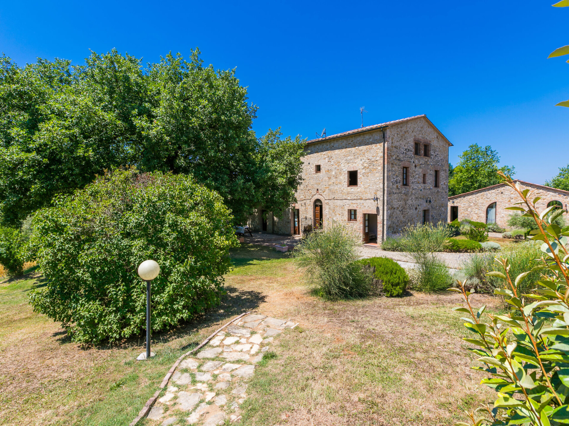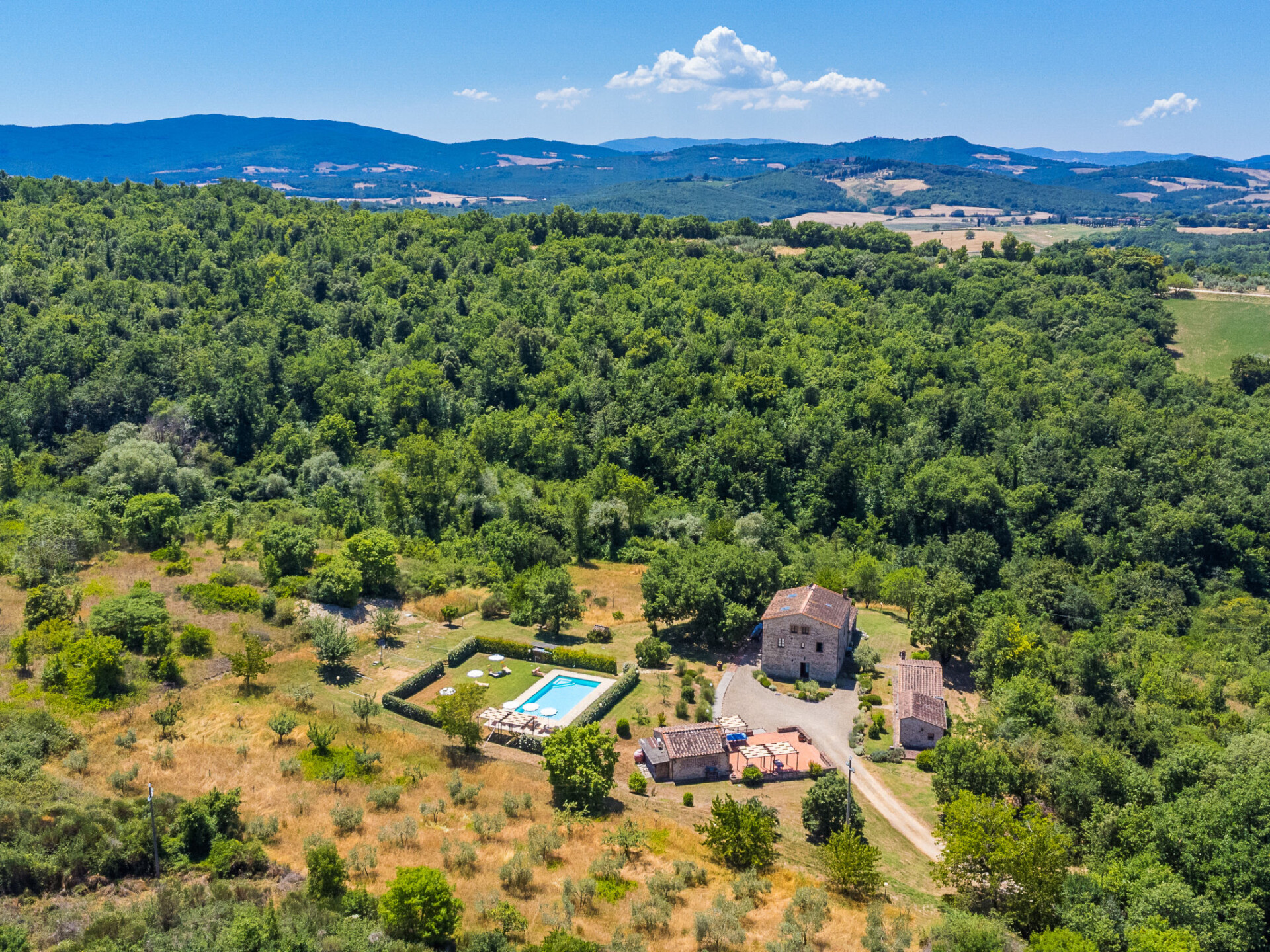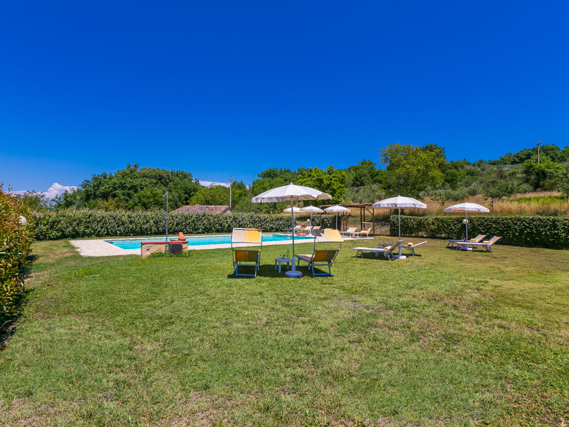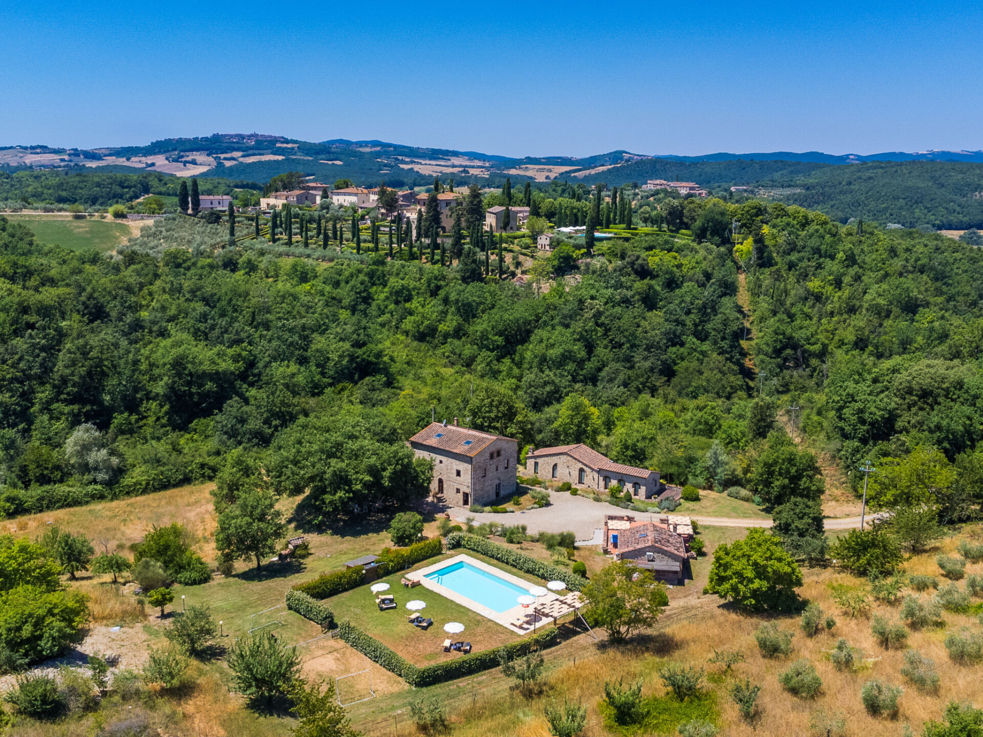 Colle di Val d'Elsa: Groot, comfortabele cottage "Podere San Giuseppe", omgeven door bomen. Huurobject bestaande uit hoofd-/ bijgebouw, 7 km van het centrum van Colle di Val d'Elsa, geïsoleerde, zonnige ligging, 100 m van de bosrand, te midden van groen. Voor alleengebruik: wild terrein, tuin, openluchtzwembad omheind (6 x 12 m, seizoensgebonden beschikbaarheid: 15.Mei. - 30.Sep.). Buitendouche, poolhouse, tafeltennis, patio, terras, tuinmeubelen, barbecue, onderhoud zwembad door de eigenaar/tuinman. In het huis: centrale verwarming, air-conditioning. 1 km lange rommelige toegangsweg. Parkeerplaats bij het huis op het terrein. Bushalte "Colle di Val d'Elsa" 7 km. Auto noodzakelijk. Baby uitrusting (incl.). Groepen jongeren uitsluitend op aanvraag. Geschikt voor evenementen.