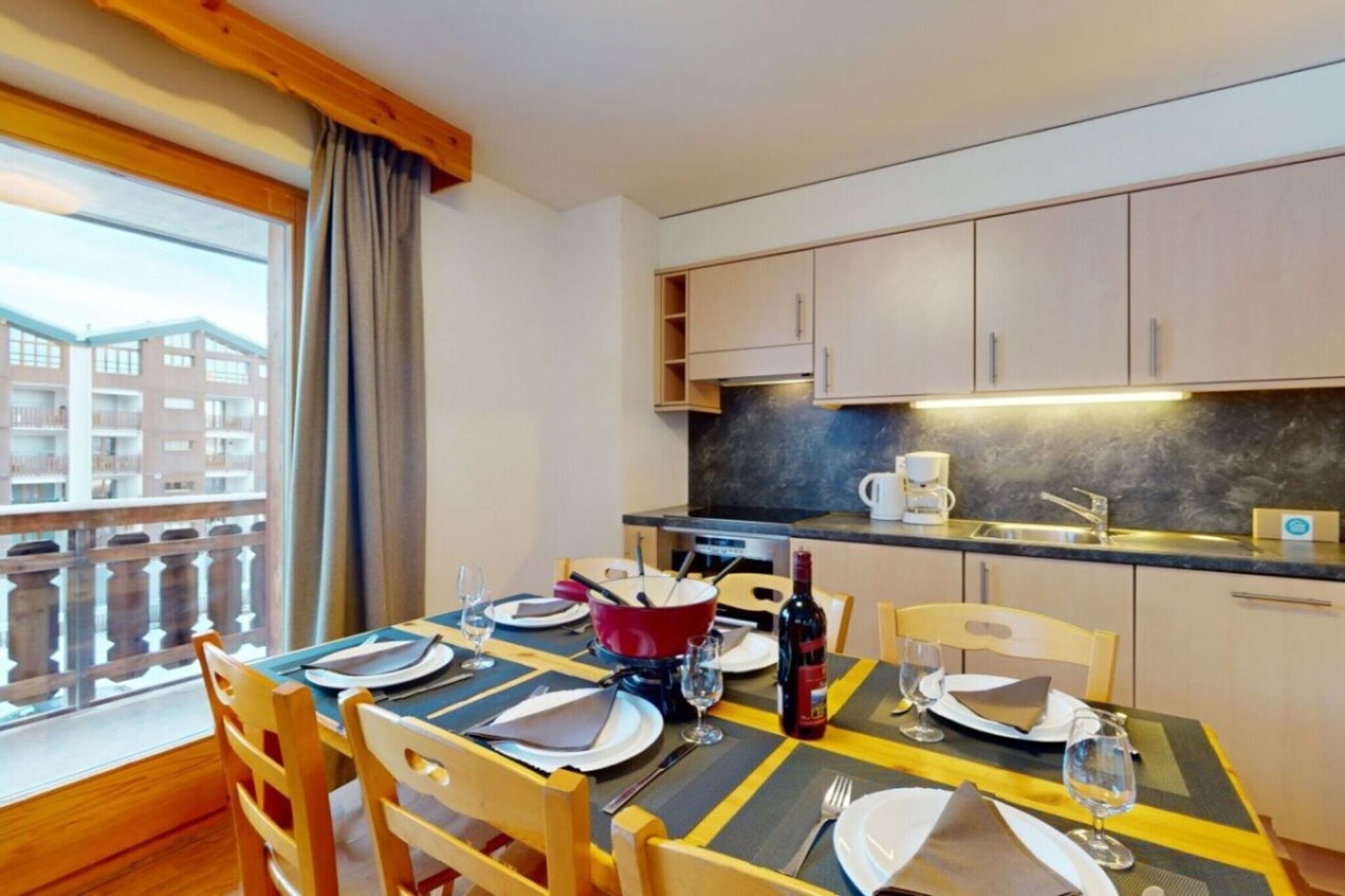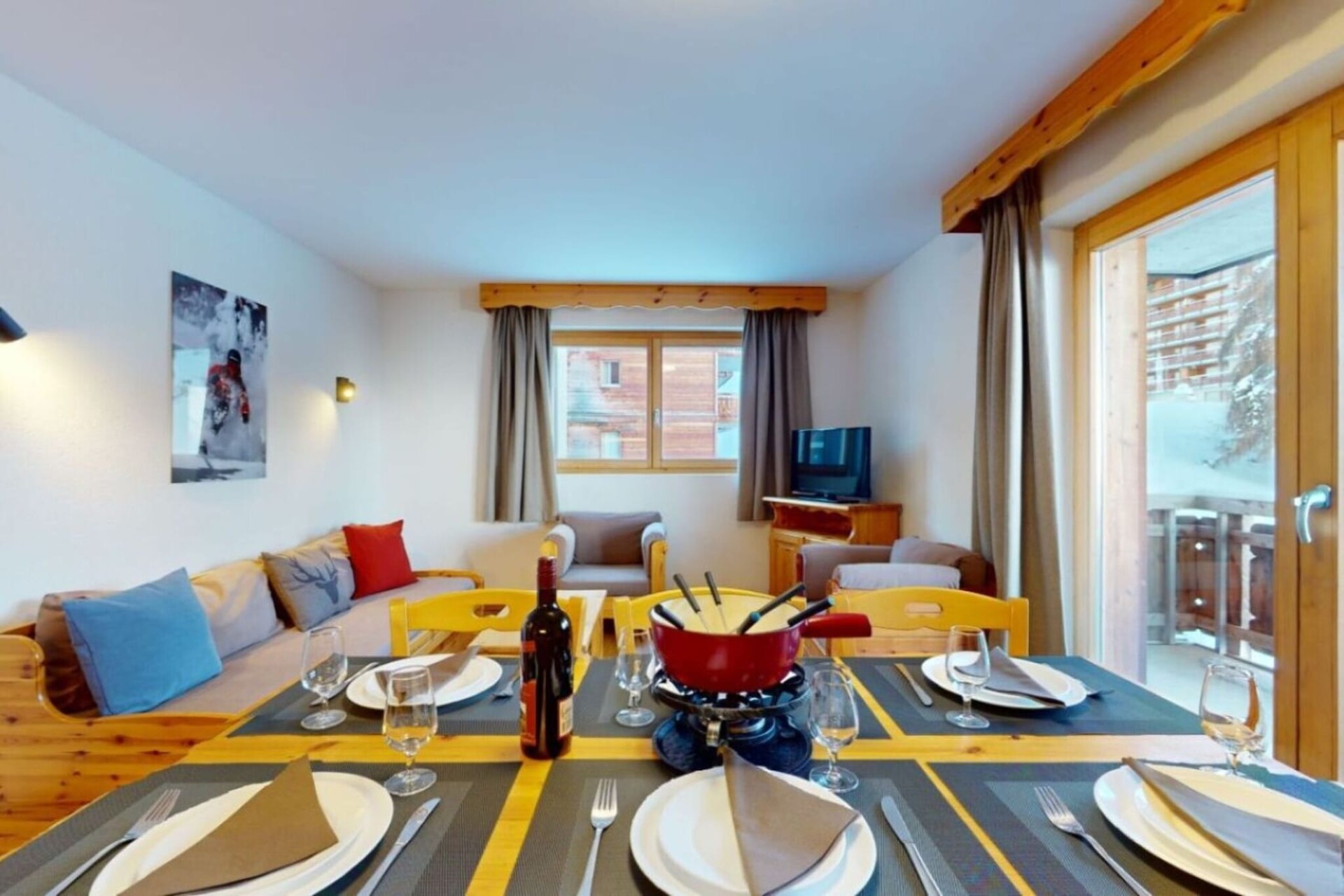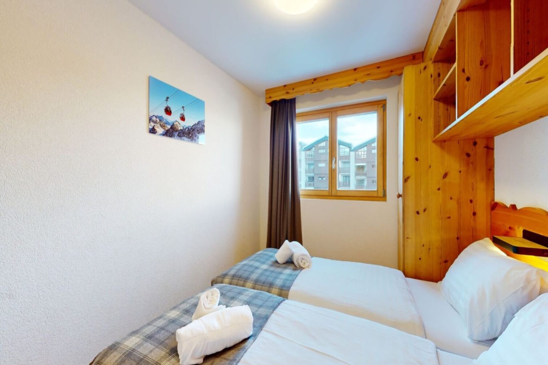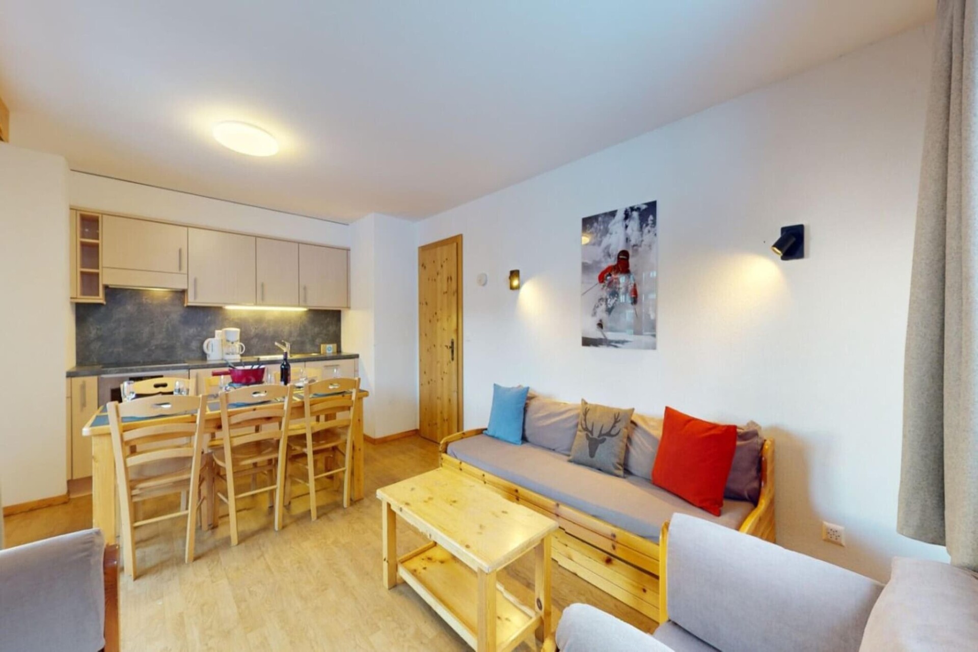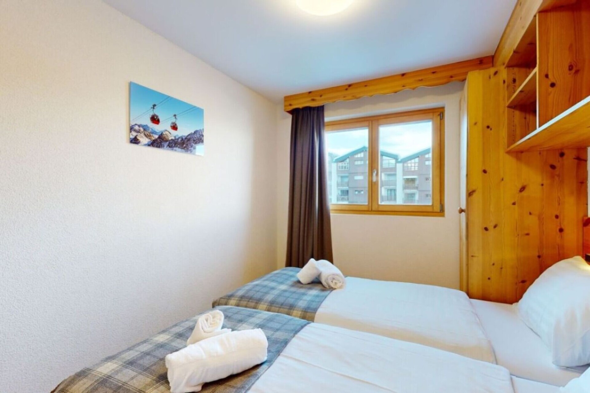 Geniet van de ultieme ski-in/ski-out-ervaring vanuit uw woonkamer, die beschikt over een charmant balkon met adembenemend uitzicht op de vallei en de skipistes. Het appartement is uitgerust met een flatscreen-tv met kabelzenders en gratis wifi, zodat u verbonden en vermaakt blijft. De open keuken is voorzien van een magnetron, vaatwasser en koffiezetapparaat, perfect voor het bereiden van maaltijden na een dag op de piste. De slaapgelegenheid bestaat uit een slaapbank in de woonkamer, twee eenpersoonsbedden in elk van de twee slaapkamers en twee goed ingerichte badkamers, één met een bad en apart toilet en de andere met een douche.