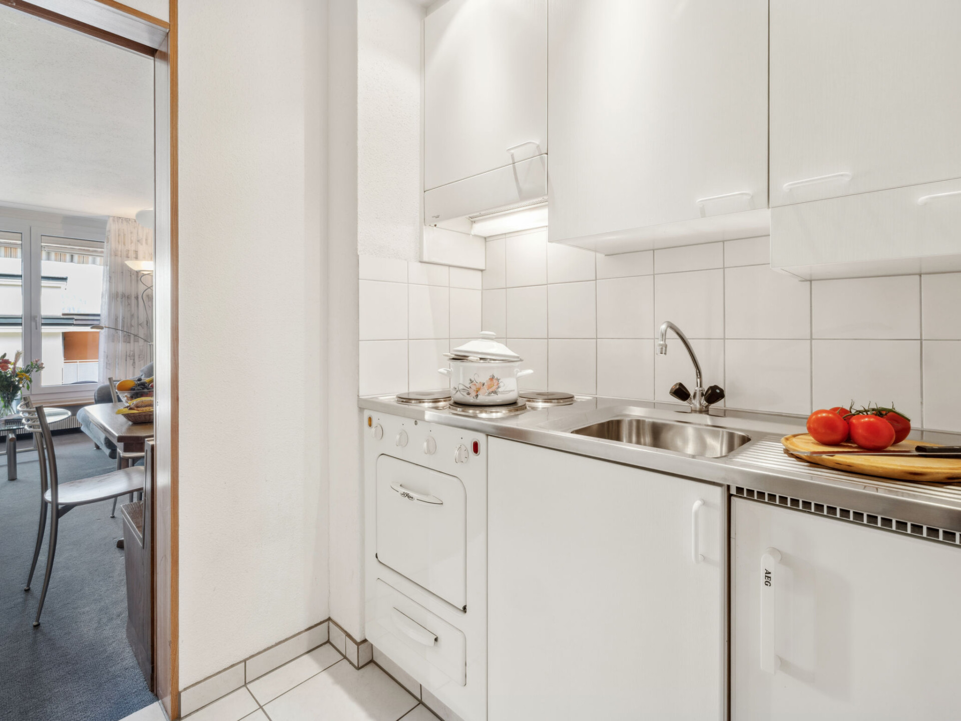 "Promenade Apt 004", appartement 1-kamer 28 m2, op de begane grond. Gezellig ingericht: woon-/eetkamer met 2 kastbedden en Sat-TV (Flatscreen TV), radio. Uitgang naar de zitplaats in de tuin. Kookhoek (3-pits kookplaat, oven). Douche/WC. Zithoek in de tuin, op het oosten gelegen. Mooi uitzicht op de bergen, het landschap en de plaats. Ter beschikking: Internet (WiFi, gratis). Niet rokers woning.