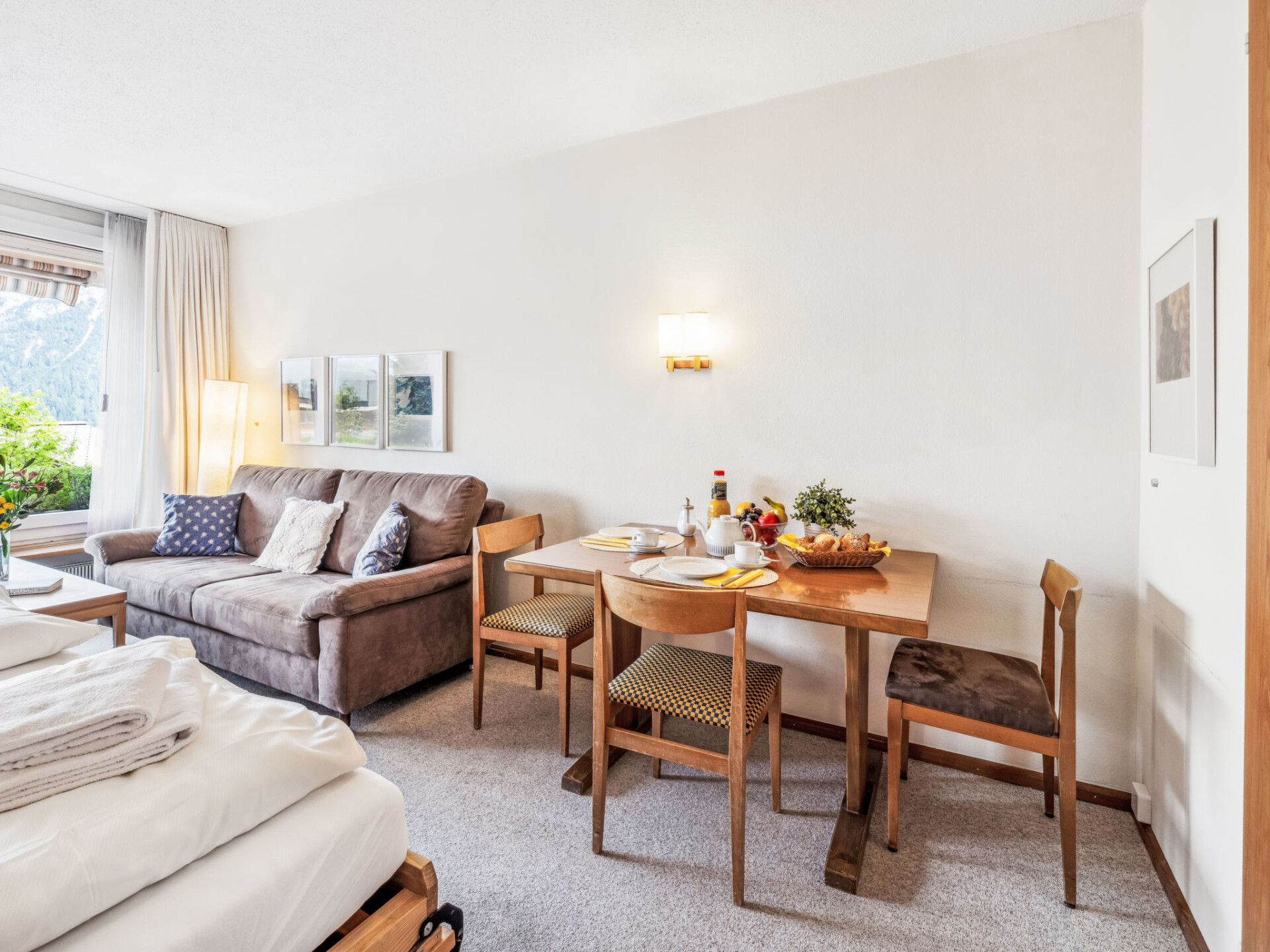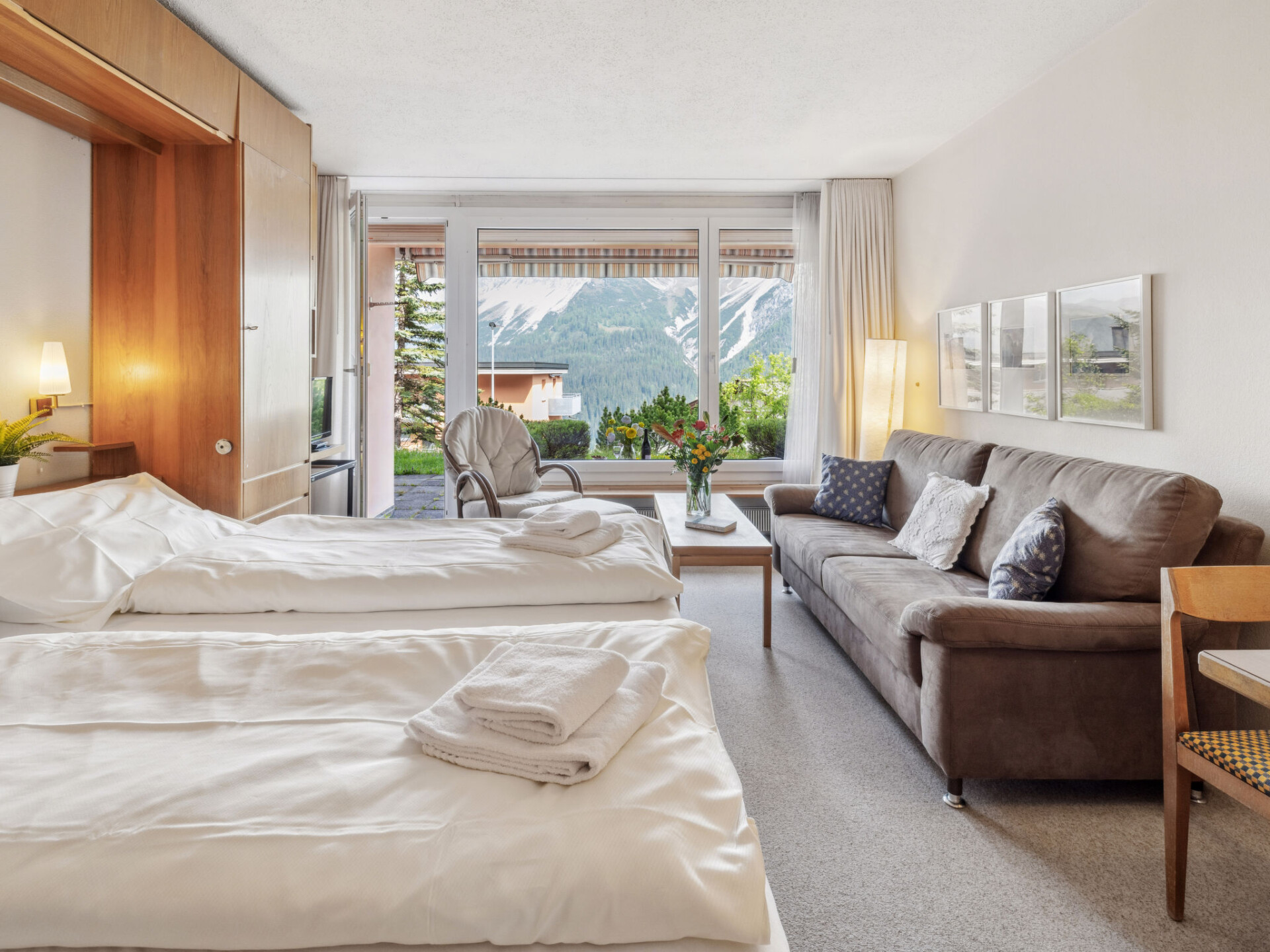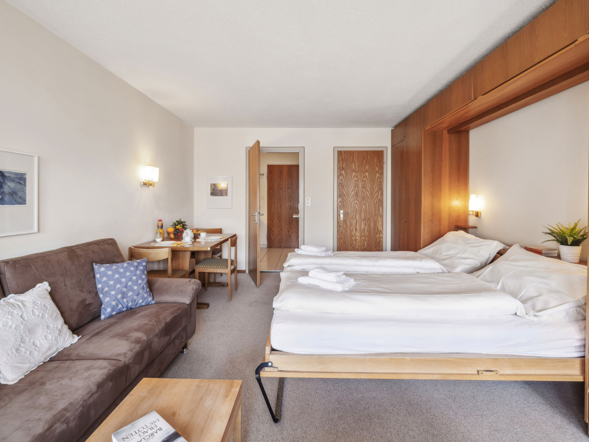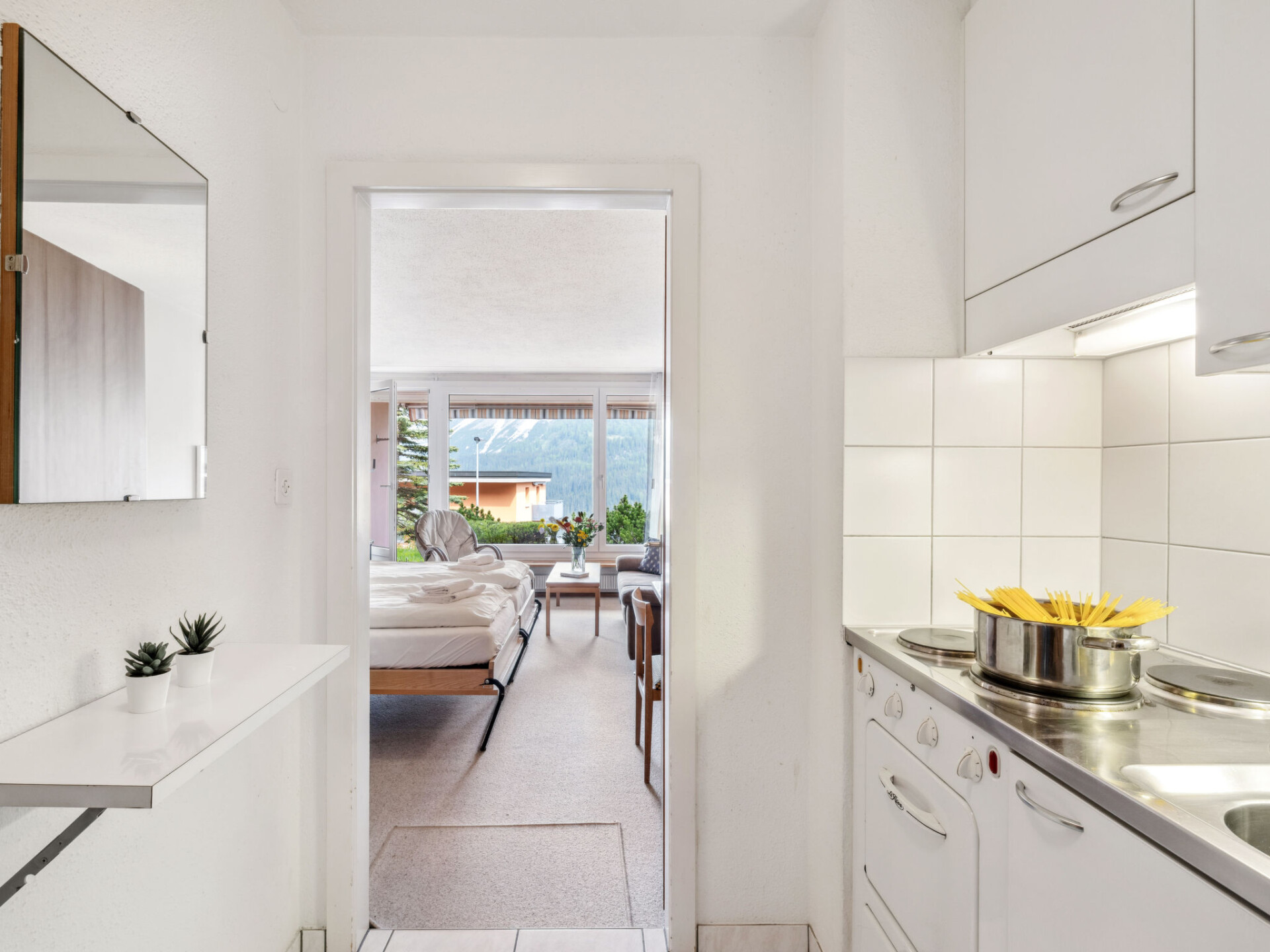 "Promenade Apt 010", appartement 1-kamer 28 m2, op de begane grond, op het oosten gelegen. Gezellig ingericht: woon-/eetkamer met 2 kastbedden en Sat-TV (Flatscreen TV). Uitgang naar de zitplaats in de tuin. Kookhoek (3-pits kookplaat, oven). Douche/WC. Zithoek in de tuin. Terrasmeubelen. Mooi uitzicht op de bergen, het landschap en de plaats. Ter beschikking: Internet (WiFi, gratis). Niet rokers woning.