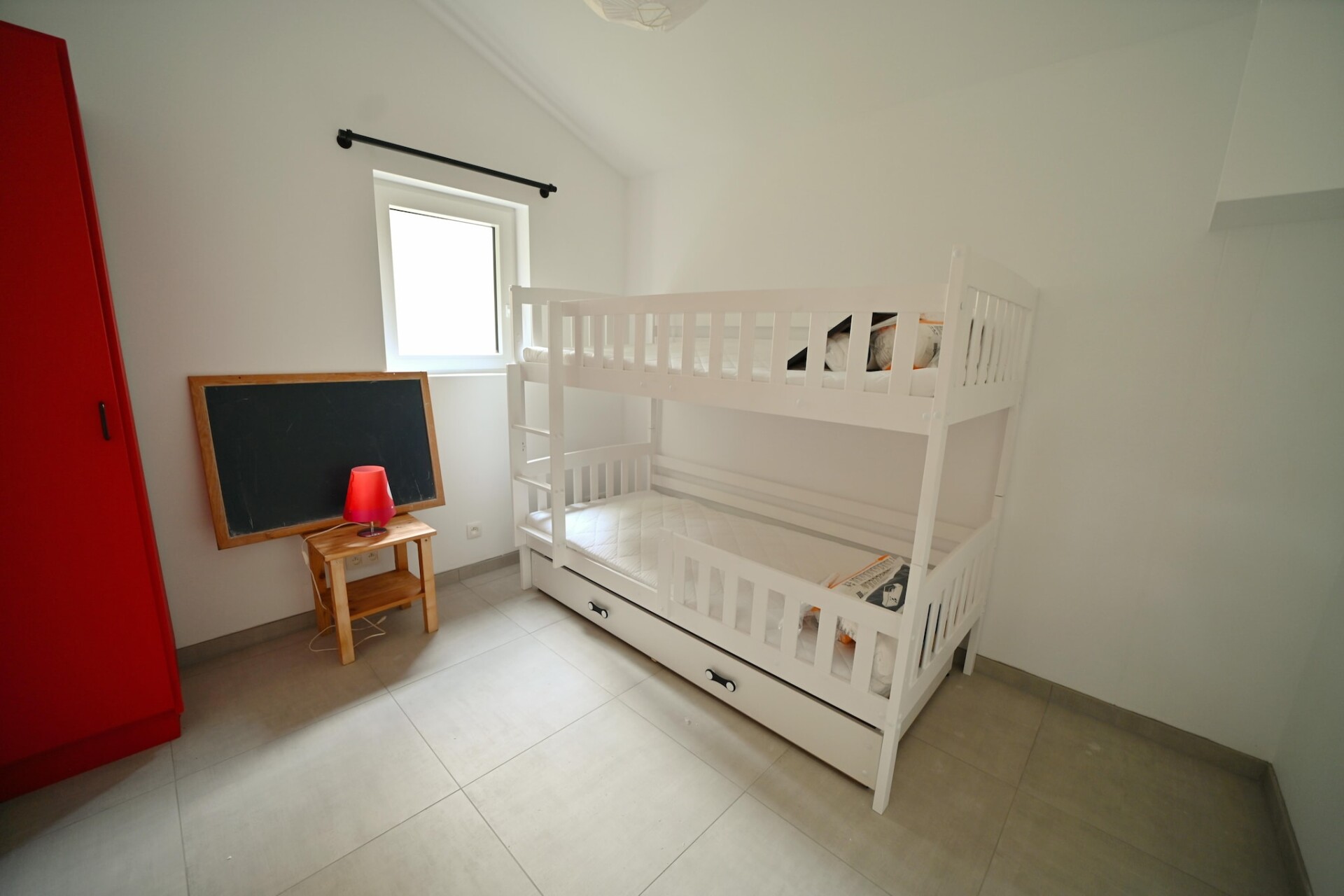 De eerste van de drie slaapkamers ligt op de begane grond en beschikt over een tweepersoonsbed. De andere twee slaapkamers bevinden zich op de eerste verdieping: een ouderslaapkamer met tweepersoonsbed, inloopdouche en WC en een kinderslaapkamer met stapelbed grenzend aan een tweede badkamer met douche en WC.