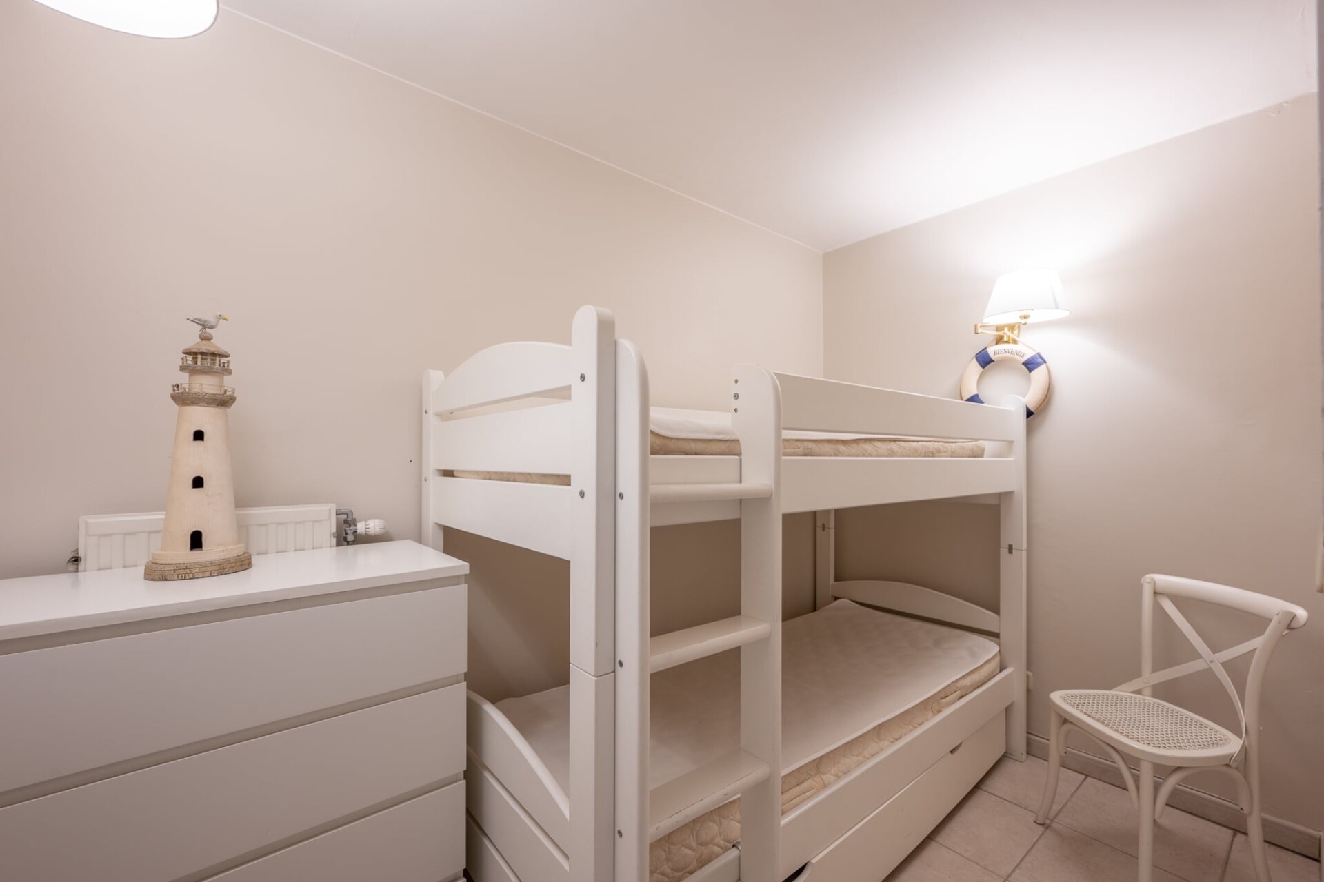 De lichte en uitnodigende woonkamer wordt aangevuld met een halfopen keuken, waardoor een warme en functionele ruimte ontstaat om te ontspannen en te dineren. Stap naar buiten op het terras en geniet van het prachtige uitzicht op het Albertstrand, een serene achtergrond voor een kopje koffie in de ochtend of een zonsondergang in de avond. Het appartement beschikt ook over een handige berging met een wasmachine, een apart toilet en een moderne badkamer. De slaapgelegenheid omvat een leuke stapelbedslaapkamer, ideaal voor kinderen of extra gasten, en een ruime slaapkamer met tweepersoonsbed aan de achterkant, die uitkomt op een zonnig terras - een vredig toevluchtsoord voor wat rust. Voor extra gemak is er een grote parkeerplaats in het gebouw inbegrepen, waardoor het gemakkelijk is om de omgeving te verkennen en te genieten van alles wat Knokke-Heist te bieden heeft.