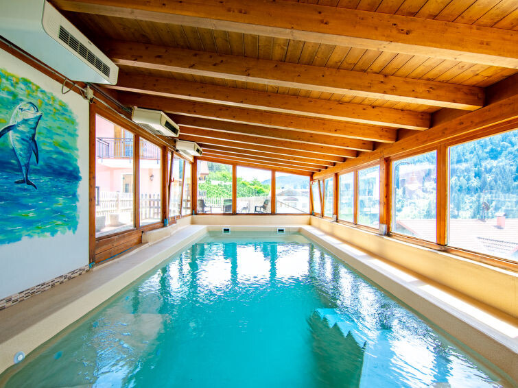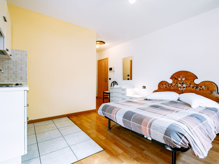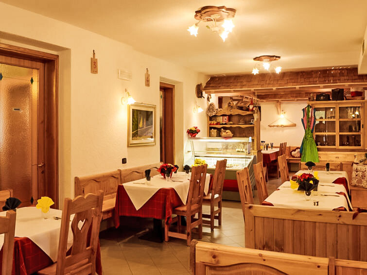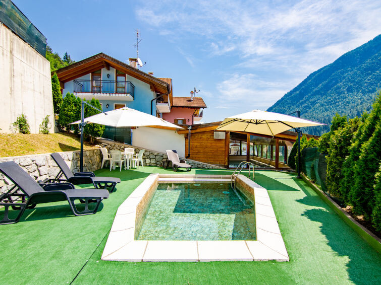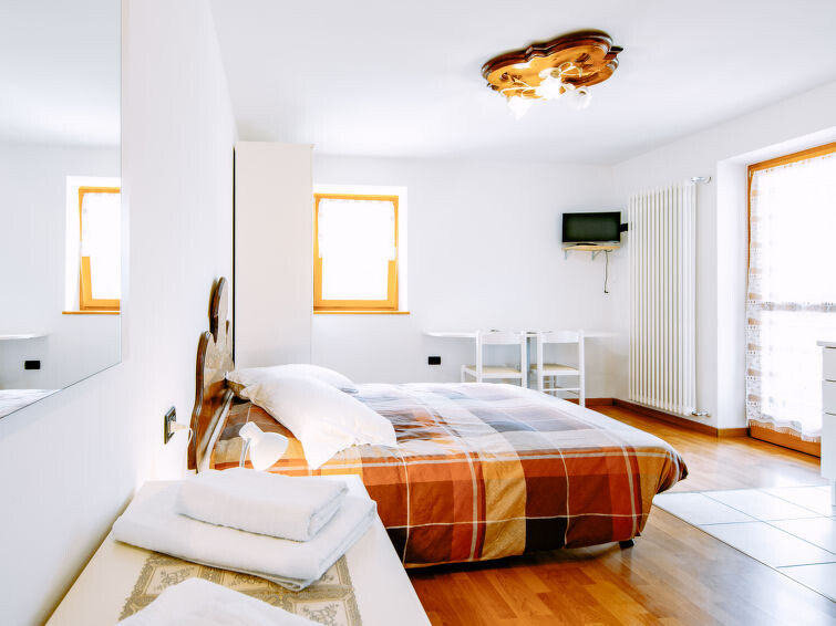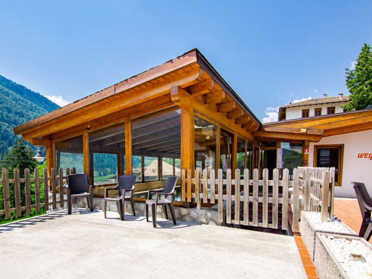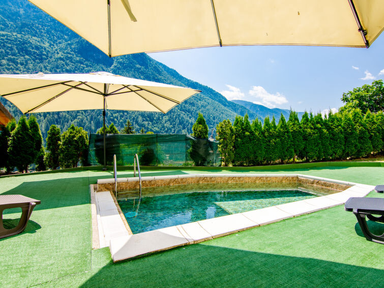 Val di Sole: Kleine, comfortabele residentie "Al Pescatore", van 3 verdiepingen, omgeven door bomen en velden. 15 appartementen in de woning. In het gehucht Tozzaga, 4 km van het centrum van Caldes, 7 km van het centrum van Malè, rustige ligging tegen een helling, 15 km van het skigebied, aan een weg. Voor medegebruik: tuin, openluchtzwembad, overdekt zwembad verwarmd (4 x 10 m, 130 cm diepte, seizoensgebonden beschikbaarheid: 01.Jun. - 15.Sep. openingstijden zwembad: 10:00-20:00). Douche/WC bij het zwembad, terras, tuinmeubelen. In het complex: restaurant, bar, Internet (WiFi), sauna, fitnessruimte, stoombad, solarium, hot tub, berging voor ski's, centrale verwarming. Parkeerplaats (beperkt aantal) bij het huis, gemeenschappelijke garage (extra) bij het huis. Winkel, restaurant 50 m, bushalte 100 m, treinstation "Tozzaga" 500 m, park "Parco Nazionale dello Stelvio" 28 km. Skipisten 15 km. Attracties in de buurt: Folgarida 19 km, Marilleva 25 km, Trento 50 km, Merano 58 km. Bekende meren kunnen gemakkelijk worden bereikt: Lago di Garda (Riva Del Garda) 87 km. Spoorweg 100 m van het huis. De afgebeelde foto is slechts een voorbeeld.