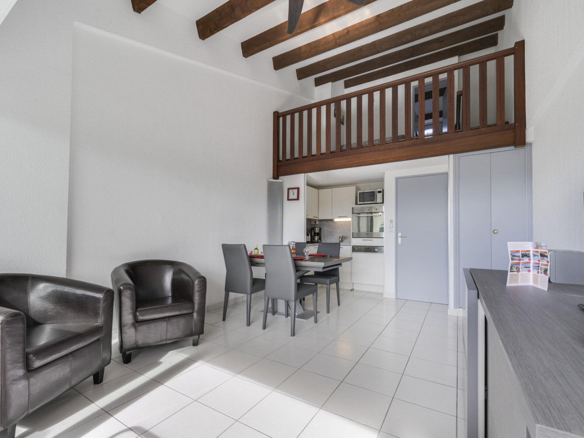 Appartement 3-kamers 52 m2 op 2 verdiepingen op de 2e verdieping. Woon-/eetkamer met TV (Flatscreen TV). 1 kamer met 1 2-pers bed (140 cm, lengte 190 cm). Kookhoek (afwasmachine, 4 inductiekookplaten, magnetron). Douche, aparte WC. Bovenverdieping: 1 kamer met 2 bedden (90 cm, lengte 190 cm). Terras 7 m2, op het zuiden gelegen. Terrasmeubelen. Ter beschikking: wasmachine. Internet (Internet (WiFi), extra). Parkeerplaats nr. 292. Rookmelders.