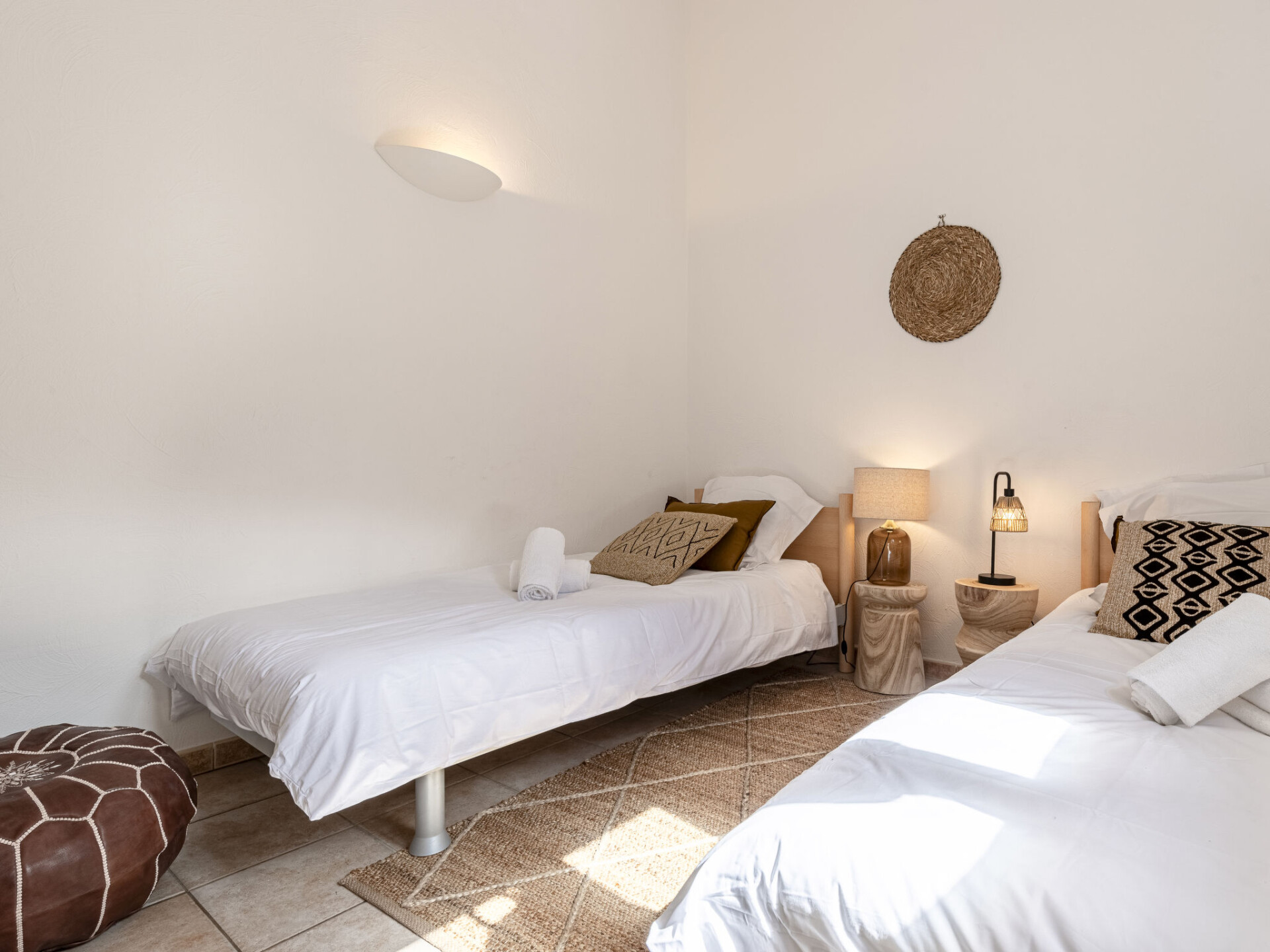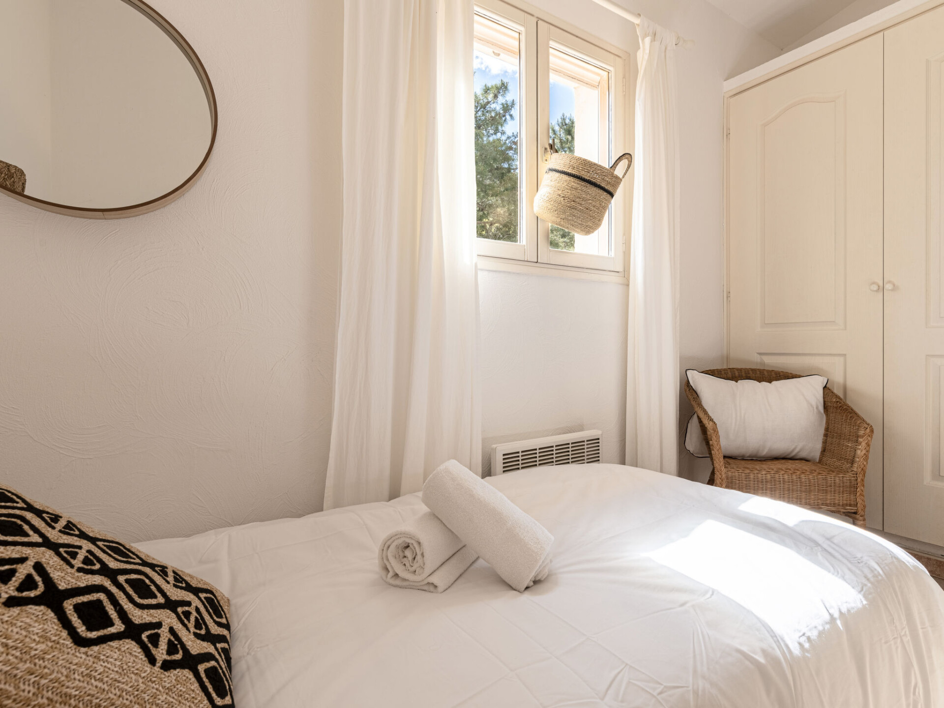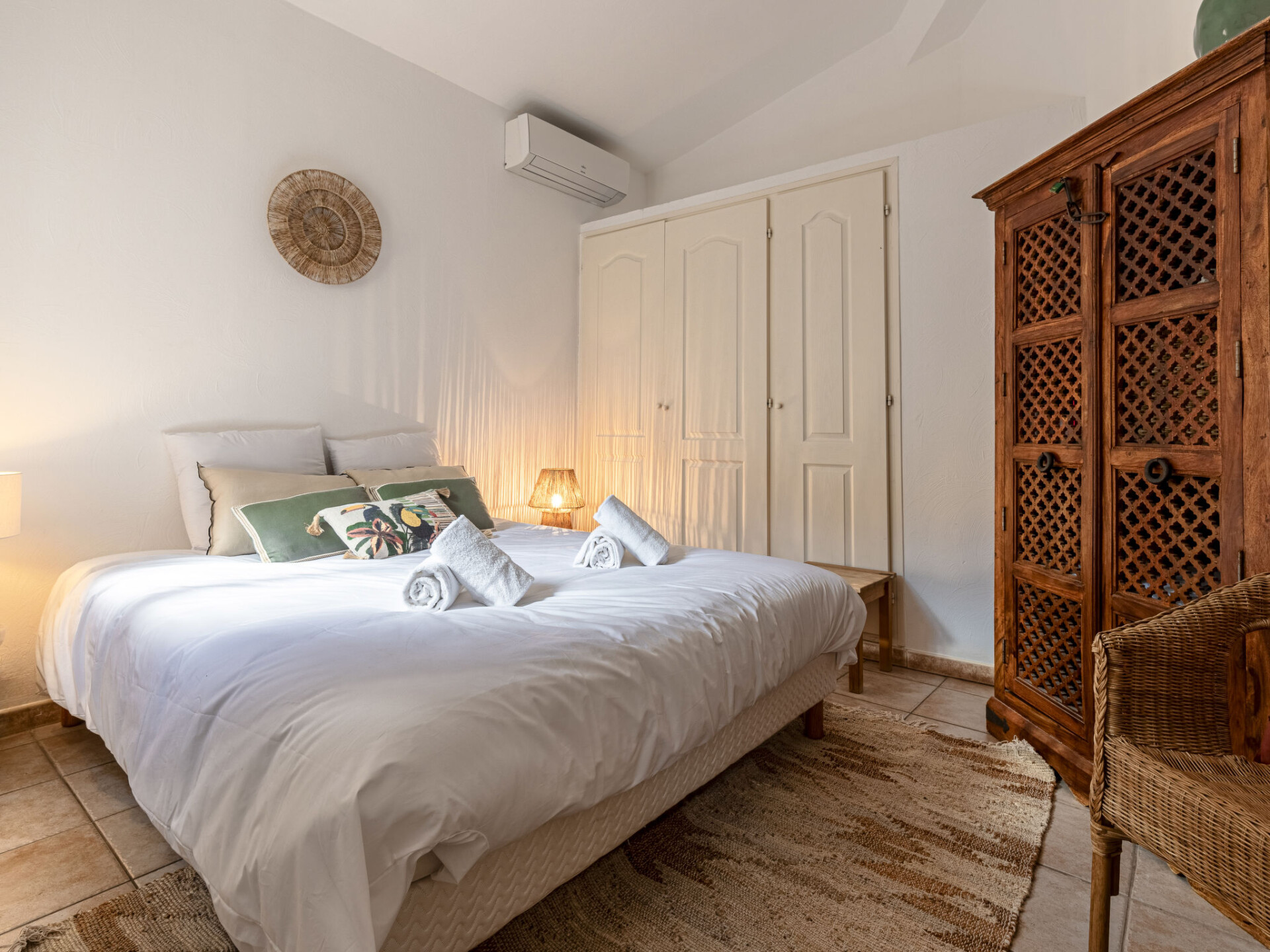 Residentie "le village marin". Buiten de plaats, 6.6 km van het centrum van Porto-Vecchio, rustige ligging op een heuvel, 100 m van zee, 3.3 km van het strand, aan een doodlopende weg. Voor medegebruik: 2 zwembaden hoekig omheind (seizoensgebonden beschikbaarheid: 15.Mei. - 15.Sep.). Tennisbaan (1 x hard court), onderhoud zwembad door de eigenaar/tuinman, parkeerplaats. Winkelcentrum 8 km, restaurant 100 m, bushalte 5 km, zandstrand "Plage de Pavelone" 3 km. Jachthaven 6 km. Attracties in de buurt: Centre ville de Porto-Vecchio 6 km, Plage de Palombaggia 8 km, Plage de Santa giulia 10 km, Bonifacio 28 km. Bekende meren kunnen gemakkelijk worden bereikt: Lac de l'Ospédale 26 km. Wandelgebied Aiguilles de Bavella 54 km. Auto noodzakelijk.