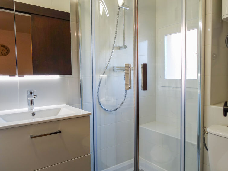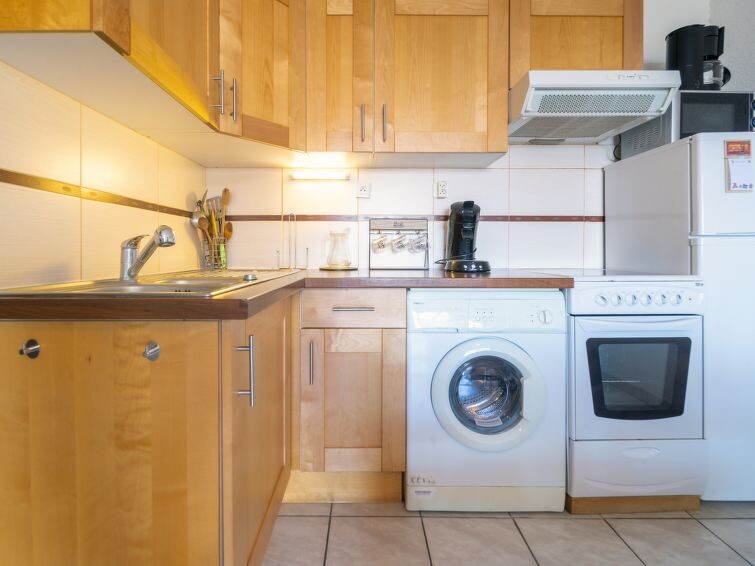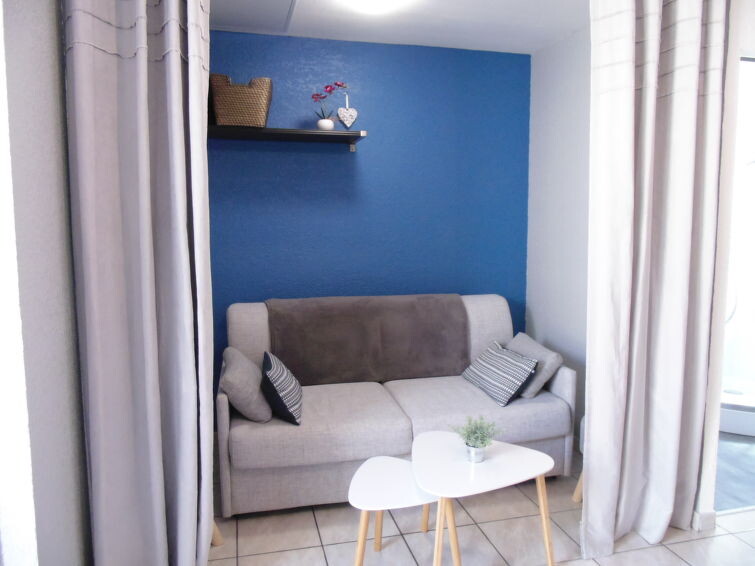 Appartement 2-kamers 27 m2 op de 2e verdieping. Woon-/eetkamer met 1 divanbed (140 cm, lengte 190 cm), TV (Flatscreen TV), elektrische verwarming en air-conditioning. Uitgang naar het terras. 1 kamer met 1 2-pers bed (1 x 140 cm, lengte 190 cm). Kookhoek (4 keramische glas kookplaten, broodrooster, waterkoker, magnetron, elektrische koffiemachine). Douche/WC. Elektrische verwarming. Terras 5 m2. Terrasmeubelen. Mooi uitzicht op zee. Ter beschikking: wasmachine, strijkijzer. Internet (WiFi, extra). Parkeerplaats. Niet rokers woning. Rookmelders.