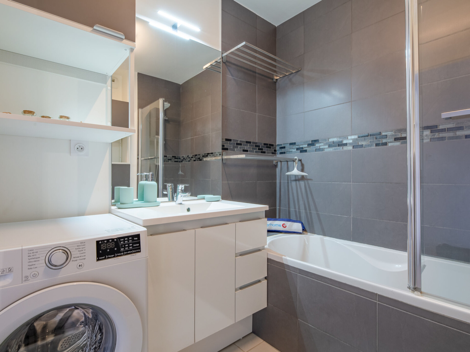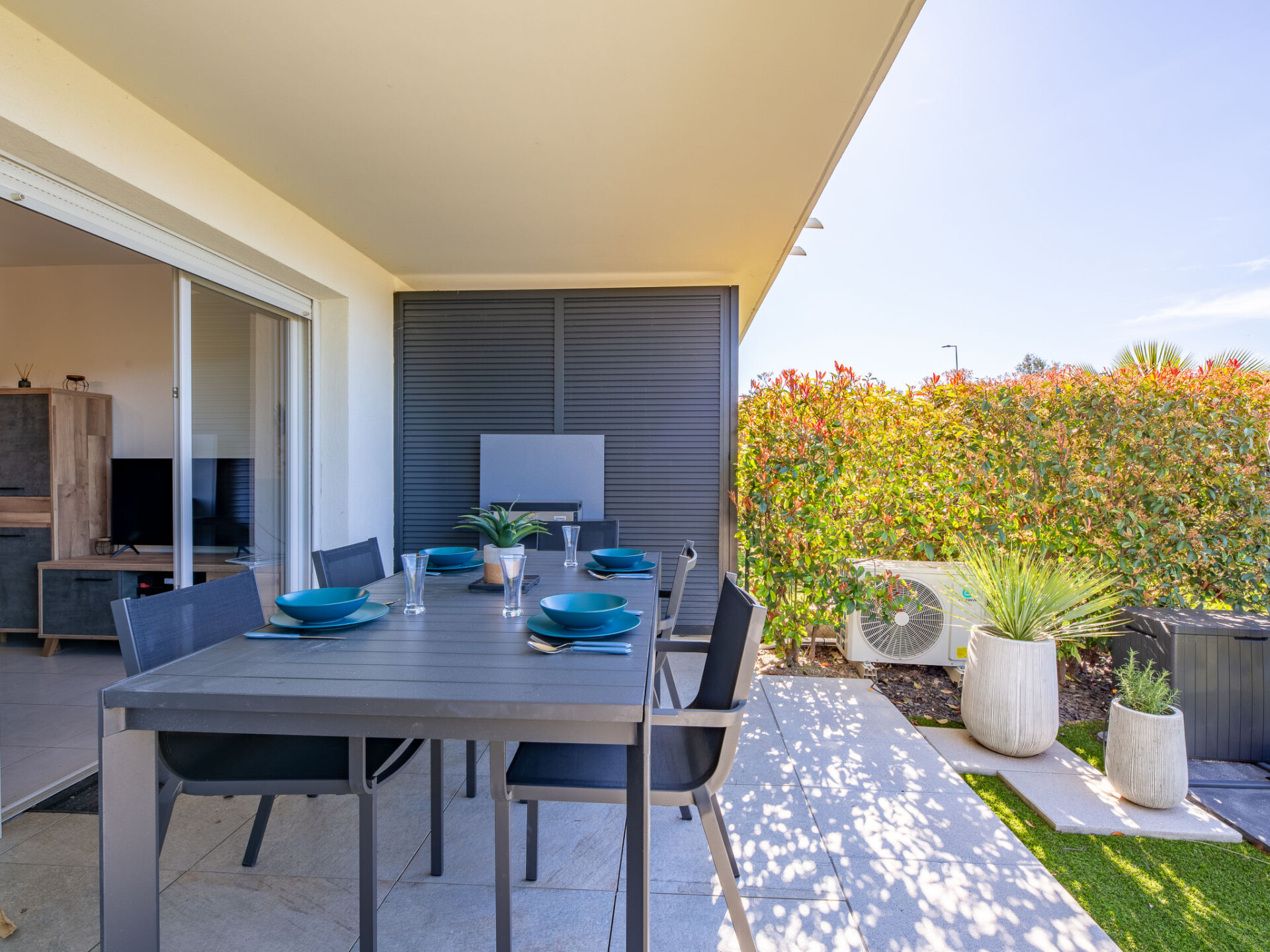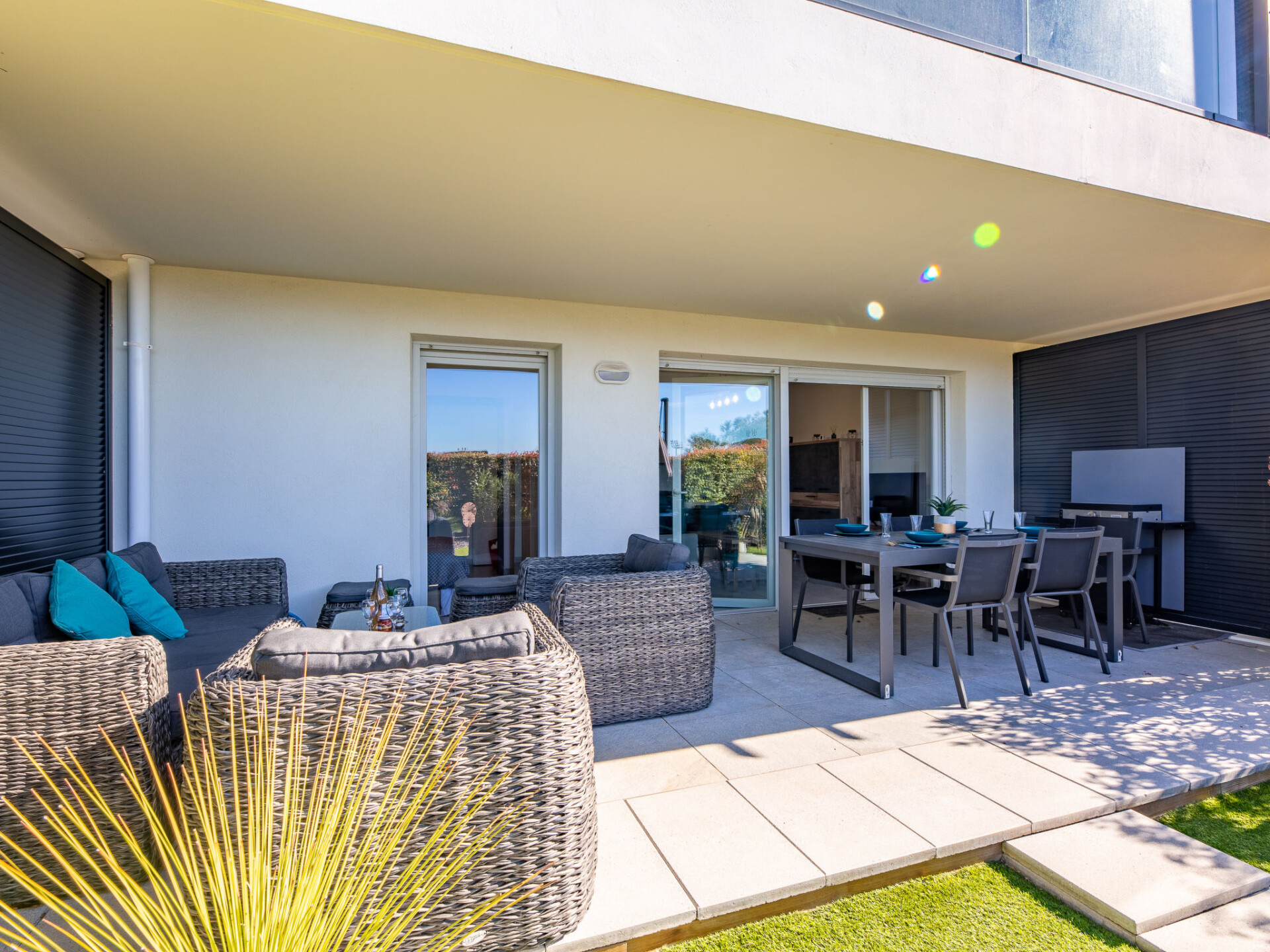 Appartement 2-kamers 42 m2, op de begane grond. Modern ingericht: woon-/eetkamer met 1 divanbed (140 cm, lengte 190 cm), TV (Flatscreen TV), air-conditioning. Uitgang naar het terras. 1 kamer met 1 2-pers bed (140 cm, lengte 190 cm), air-conditioning. Uitgang naar het terras. Open keuken (oven, afwasmachine, 4 inductiekookplaten, broodrooster, waterkoker, magnetron, diepvriezer, elektrische koffiemachine). Badkamer, aparte WC. Elektrische verwarming. Groot terras 16 m2, op het zuiden gelegen en op het westen gelegen, kleine tuin 50 m2. Terrasmeubelen. Ter beschikking: wasmachine, strijkijzer, haardroger. Internet (Internet (WiFi)). Garage nr. 18-19. Niet rokers woning. TV alleen FR. Rookmelders. Aanbod door een particulier volgens art. 155, IV van CGI.