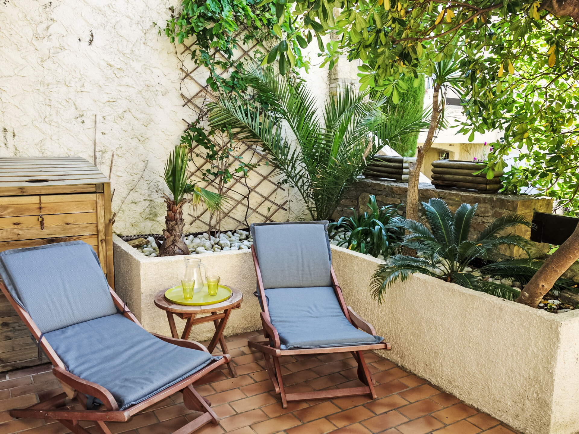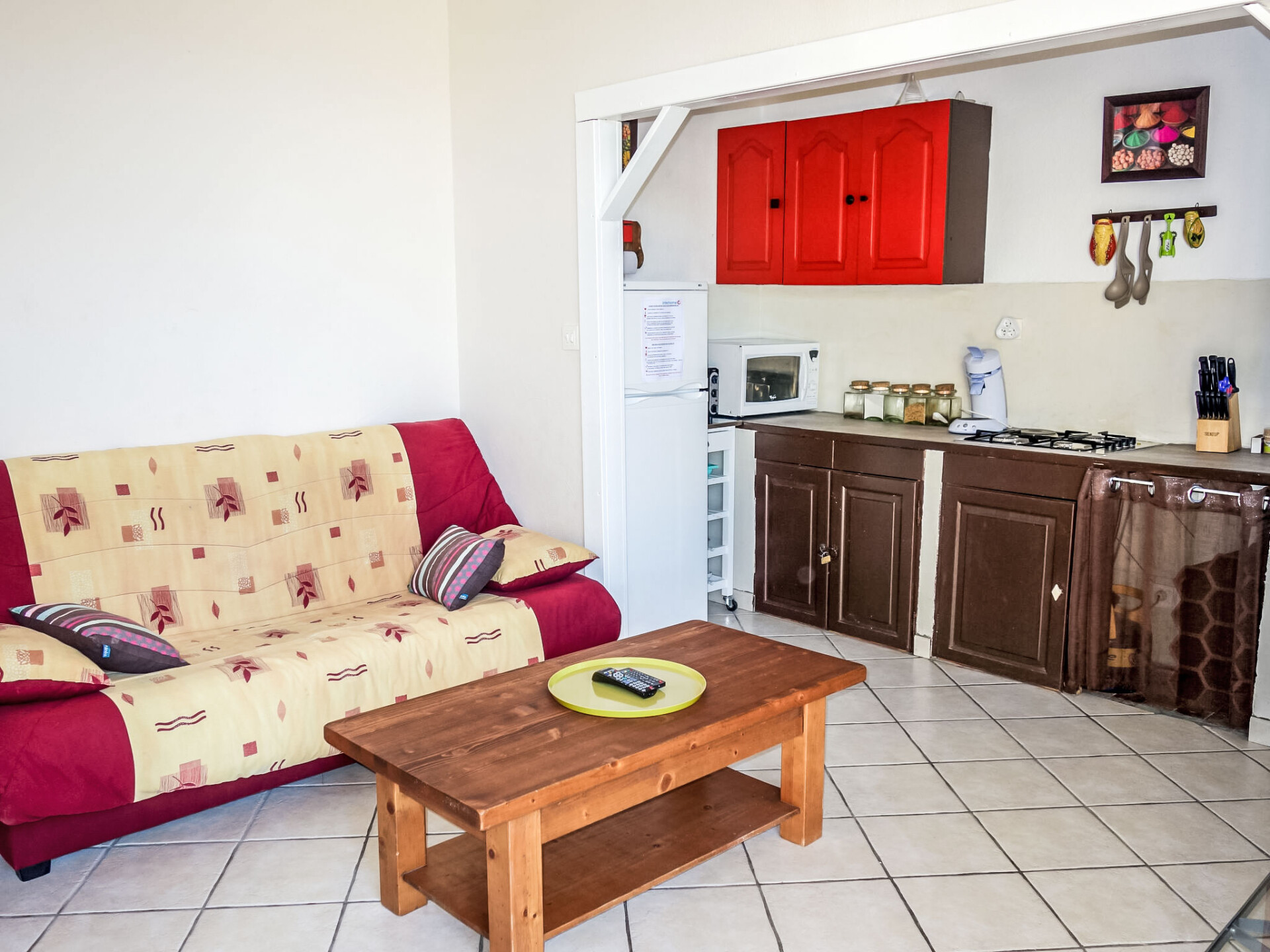 Studio 1-kamer 45 m2 op de 1e verdieping. Comfortabel en mooi ingericht: woon-/eetkamer met TV (Flatscreen TV). Uitgang naar het terras. 1 groot kamer met gordijn met 1 x 2 stapelbedden (80 cm, lengte 190 cm), 1 2-pers bed (2 x 78 cm, lengte 200 cm). Open keuken (4-pits kookplaat, mini-oven, magnetron, diepvriezer, elektrische koffiemachine, pads voor de koffiemachine (Senséo) extra). Bad/WC. Elektrische verwarming. Groot terras 30 m2 gedeeltelijk overdekt, op het noordwesten gelegen. Terrasmeubelen, elektrische barbecue. Ter beschikking: Internet (Internet (WiFi), extra). TV alleen FR. Rookmelders. 83112 000169 W7