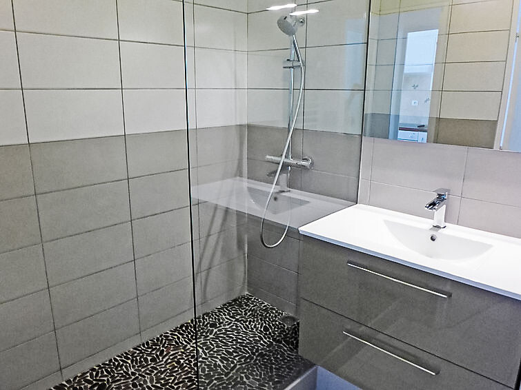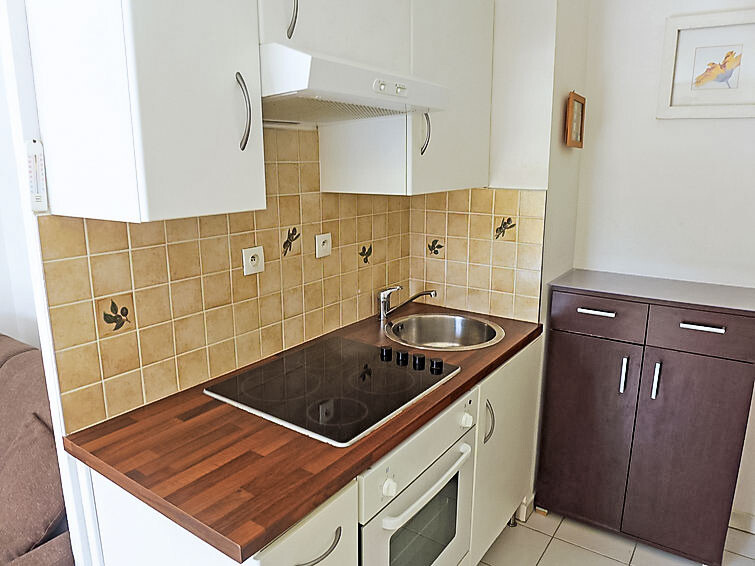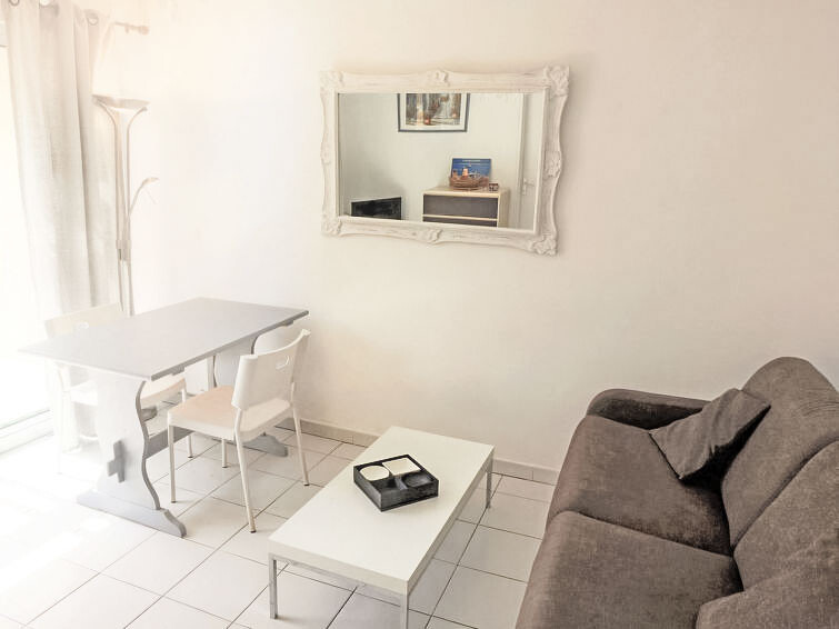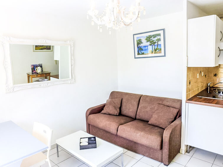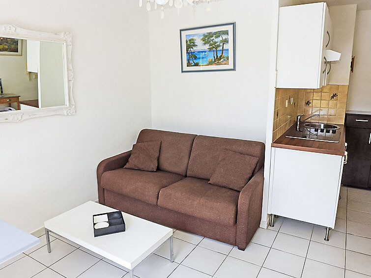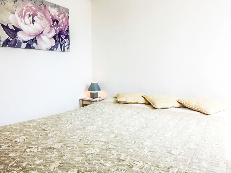 Appartement 2-kamers 35 m2 op de 3e verdieping. Comfortabel ingericht: woon-/eetkamer met 1 2-pers divanbed (130 cm, lengte 190 cm), TV en air-conditioning. Uitgang naar het terras. 1 kamer met 1 2-pers bed (140 cm, lengte 190 cm). Kookhoek (oven, 4 keramische glas kookplaten, broodrooster, waterkoker, magnetron, elektrische koffiemachine, pads voor de koffiemachine (nespresso) extra). Douche, aparte WC. Elektrische verwarming. Terras 7 m2, overdekt, op het westen gelegen. Terrasmeubelen. Uitzicht op het zwembad. Ter beschikking: wasmachine, strijkijzer, haardroger. Internet (Internet (WiFi), gratis). Parkeerplaats nr. 124 (1 Auto). Maximaal 1 klein huisdier/hond toegestaan. TV alleen FR. Rookmelders.