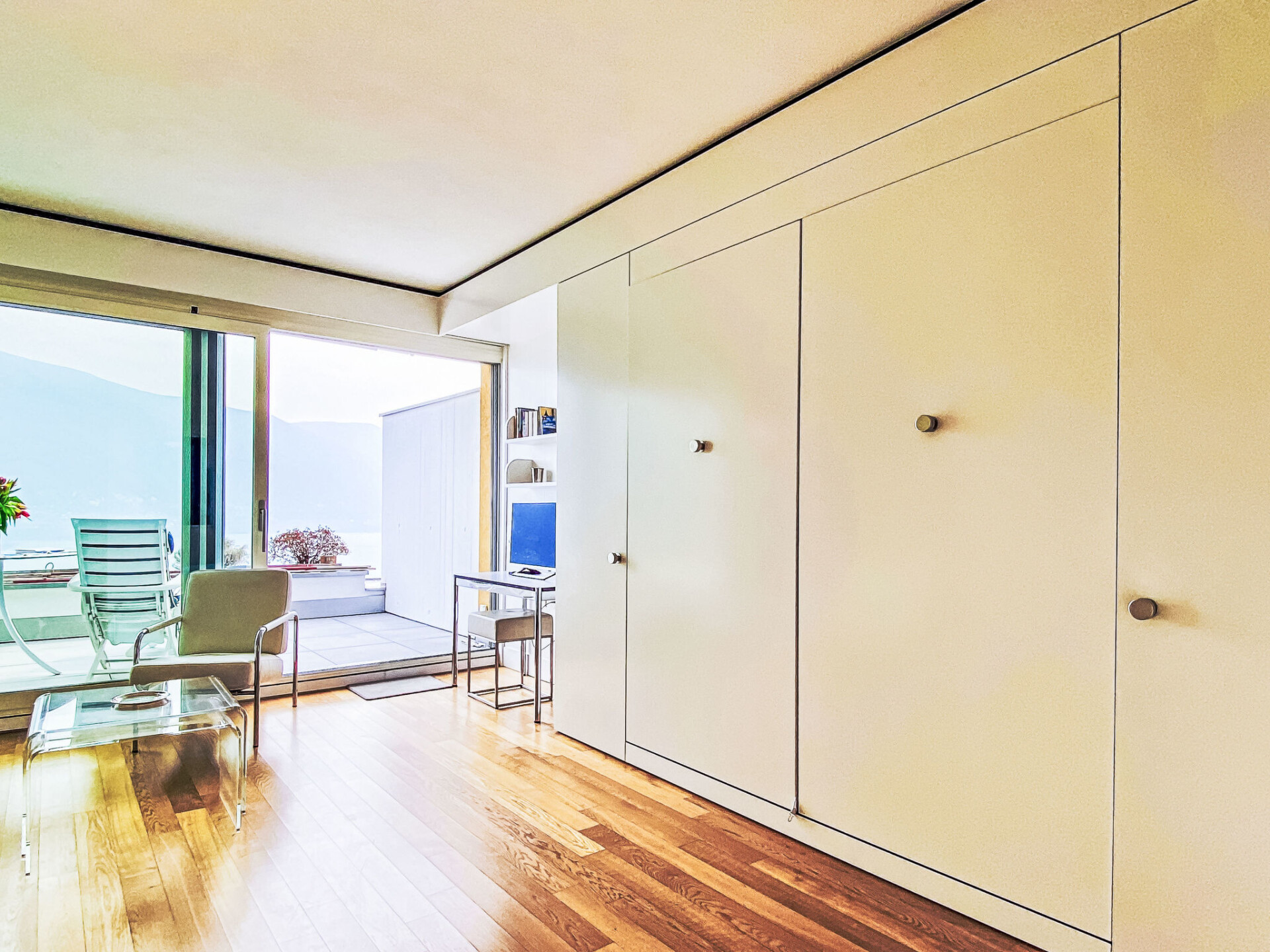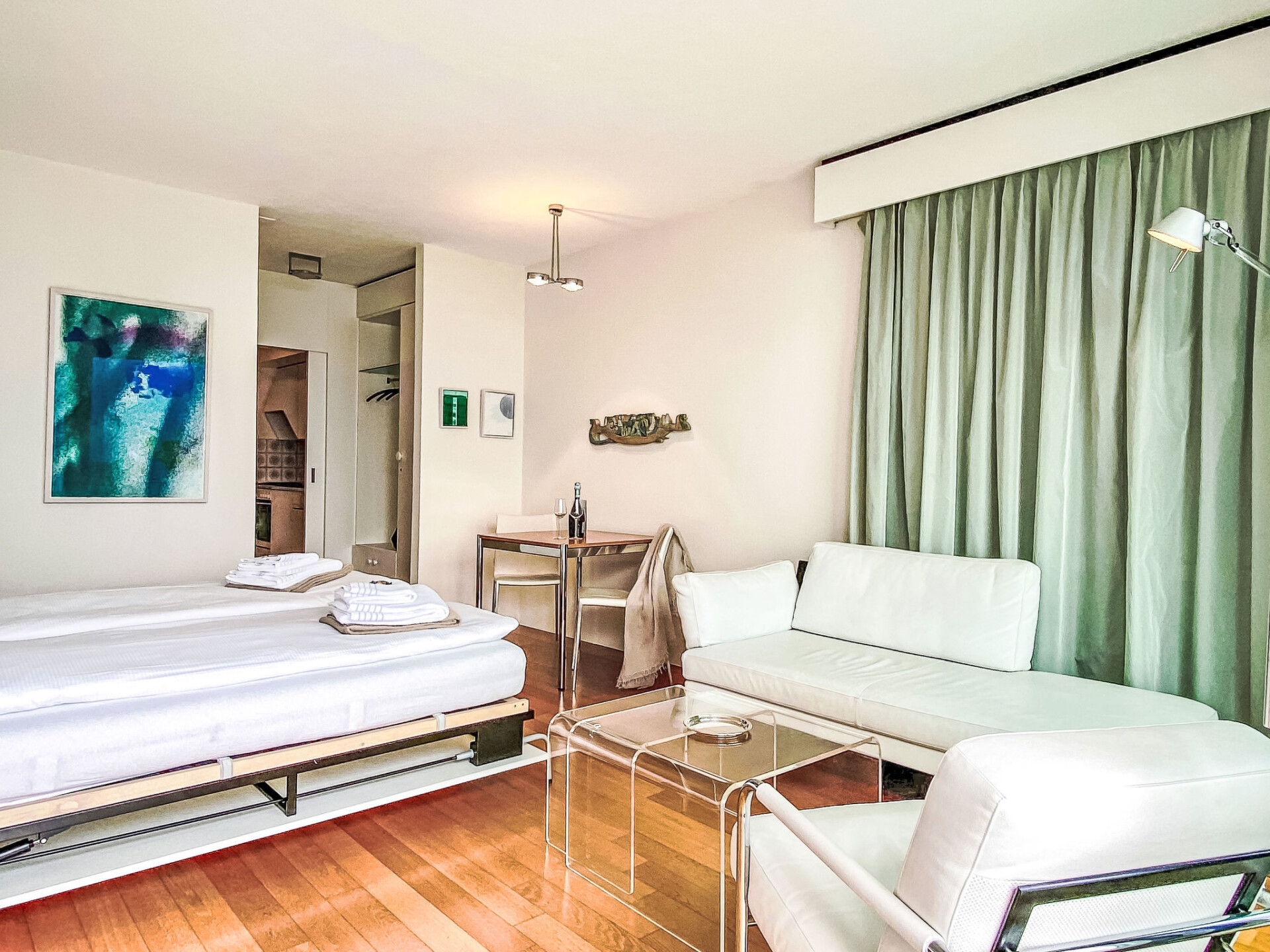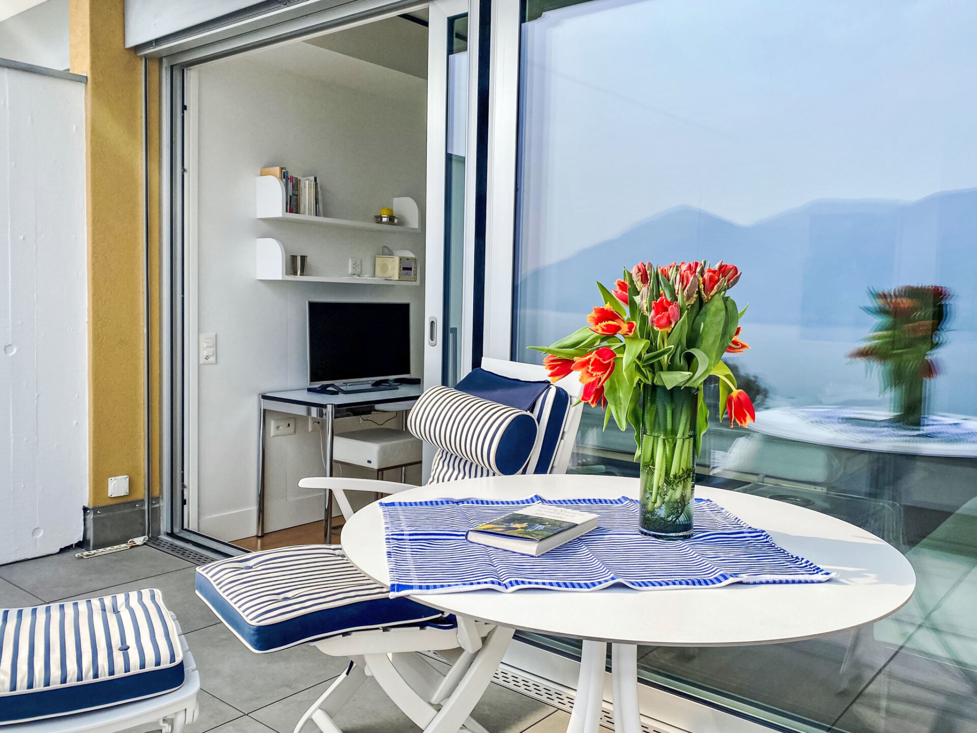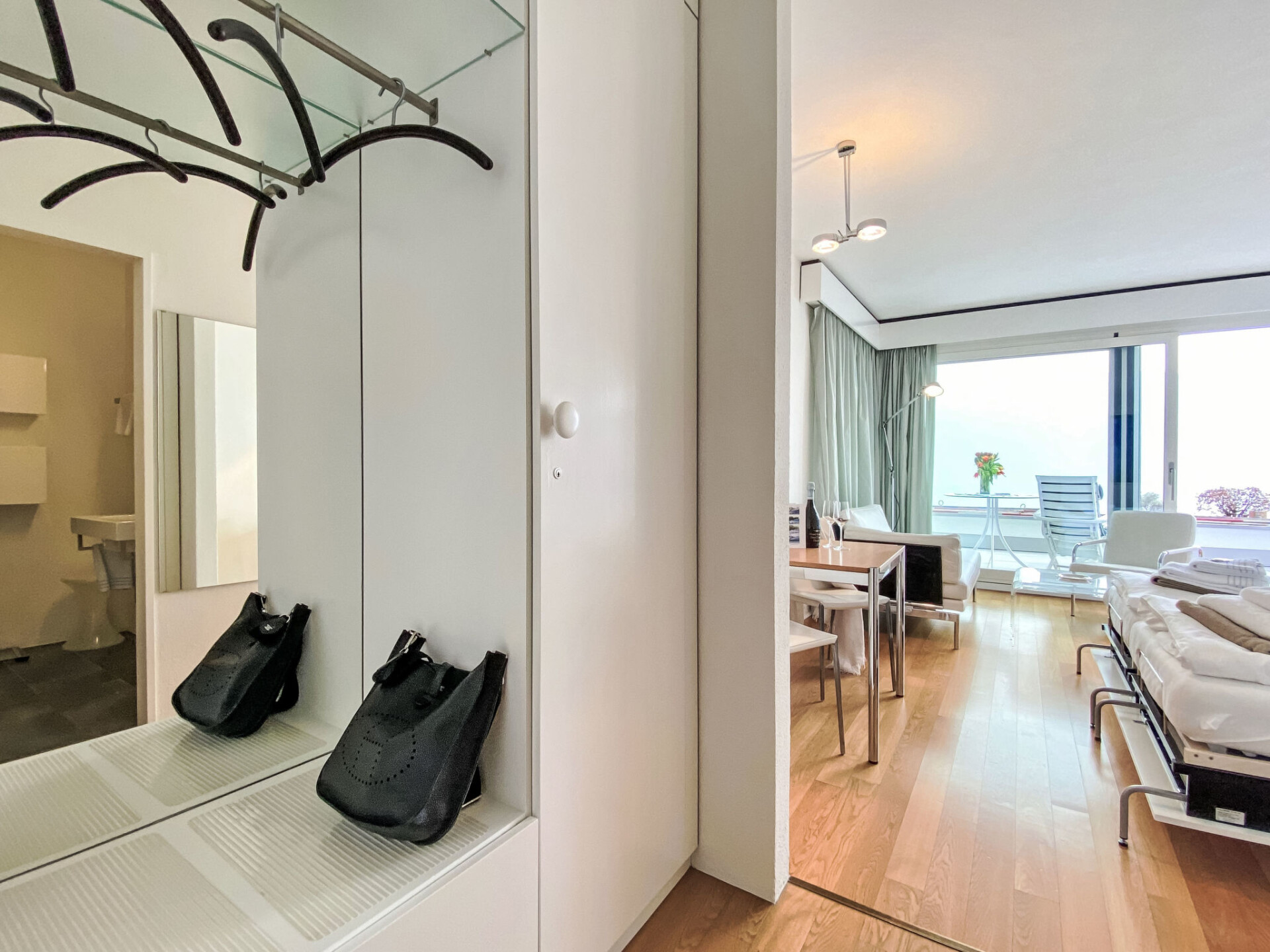 "Lakeview App. 603", appartement 1-kamer 36 m2 op de 6e verdieping, op het zuidoosten gelegen. Licht, comfortabel en smaakvol ingericht: open woon-/eetkamer met panoramavenster met 1 2-pers kastbed (2 x 90 cm, lengte 200 cm), eettafel, Sat-TV, Flatscreen TV, radio en CD-speler. Uitgang naar het terras. Kookhoek in de hal (oven, 4 keramische glas kookplaten, elektrische koffiemachine, pads voor de koffiemachine (Nespresso) extra). Douche/WC. Verwarming. Terras gedeeltelijk overdekt, op het zuiden gelegen en op het oosten gelegen. Terrasmeubelen. Mooi panoramazicht op het meer, de bergen en het landschap. Ter beschikking: haardroger. Parkeerplaats nr. 25. Niet rokers woning. Gemoderniseerde badkamer. NL-00011471