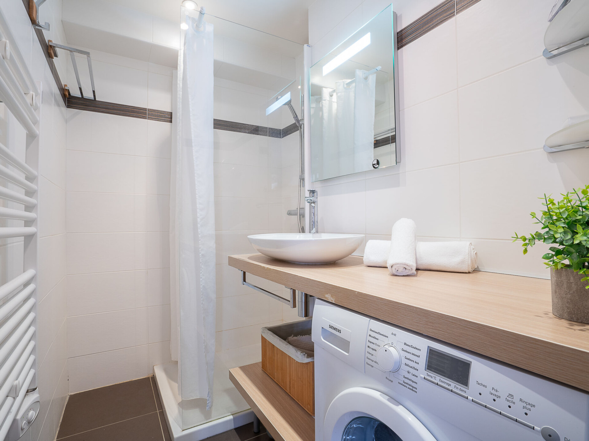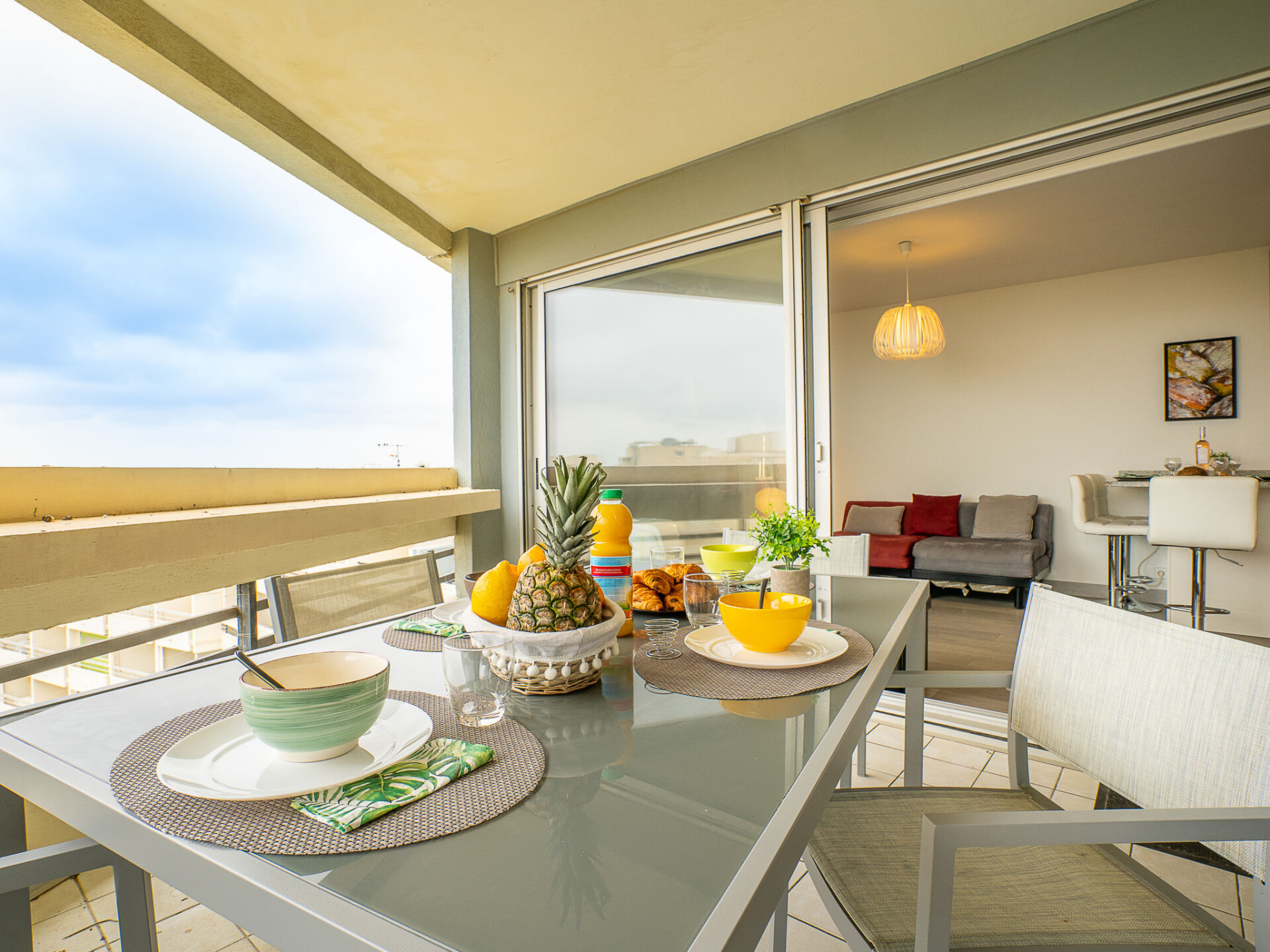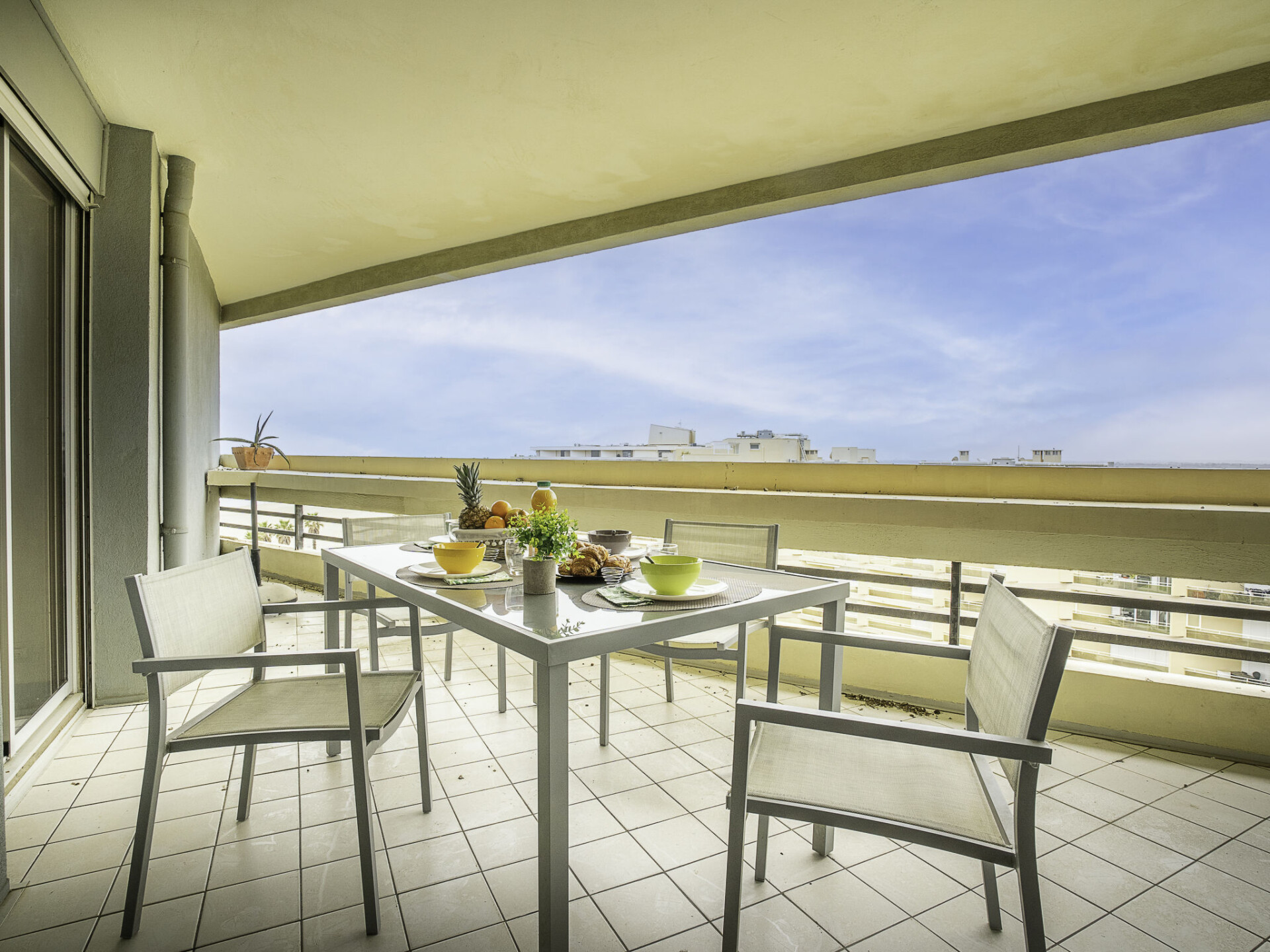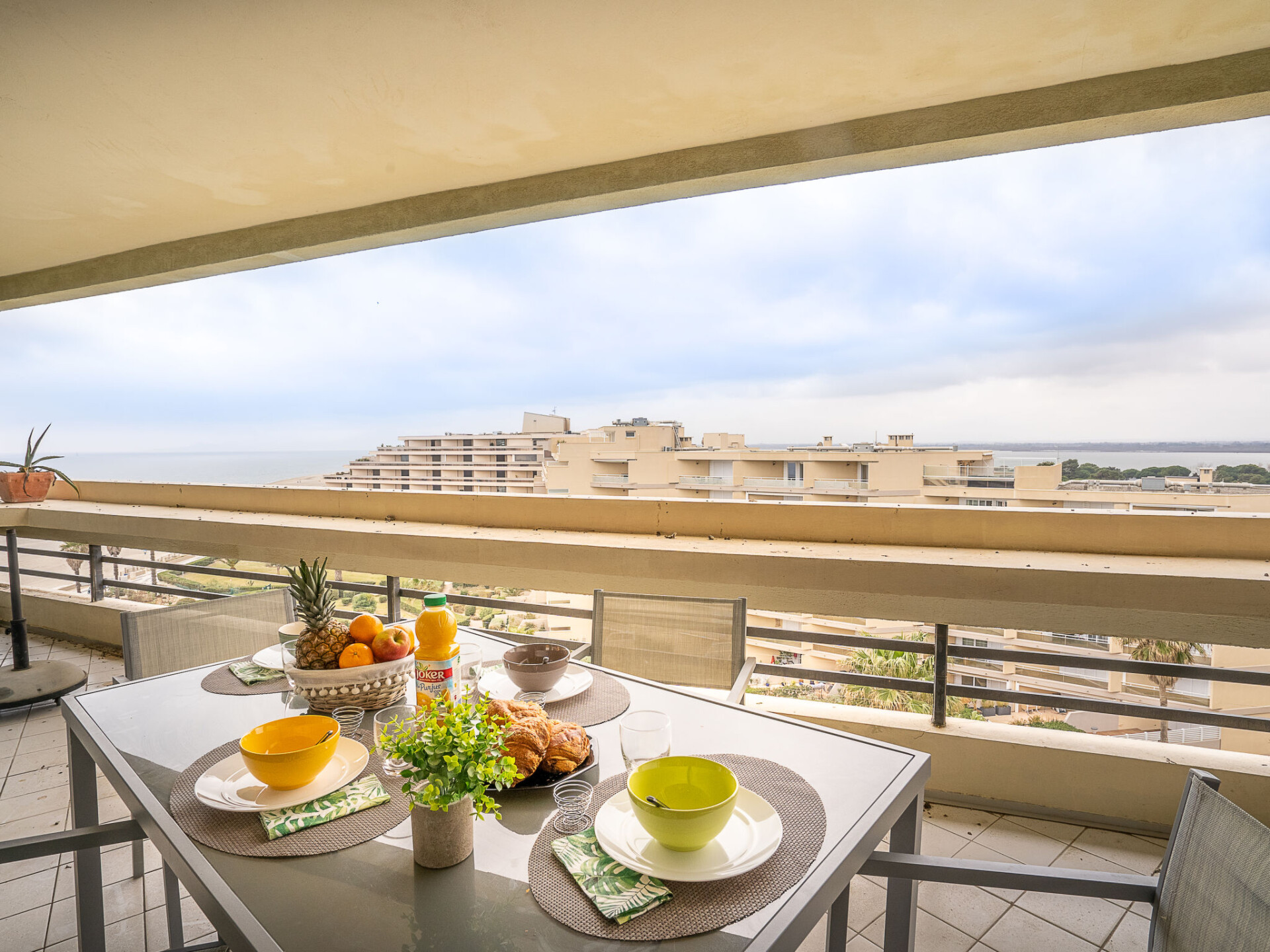 Appartement 2-kamers 38 m2 op de 7e verdieping. Woon-/eetkamer met 2 divanbedden (90 cm, lengte 200 cm), Flatscreen TV en DVD. Uitgang naar het terras. 1 kamer met 1 2-pers bed (2 x 90 cm, lengte 200 cm). Kookhoek (oven, afwasmachine, 2 inductiekookplaten, broodrooster, waterkoker, elektrische koffiemachine, combimagnetron). Douche, aparte WC. Elektrische verwarming. Terras 11 m2. Zeer mooi uitzicht op zee, het meer, de bergen en het landschap. Ter beschikking: wasmachine. Internet (Internet (WiFi), gratis). Parkeerplaats nr. 348. Rookmelders.