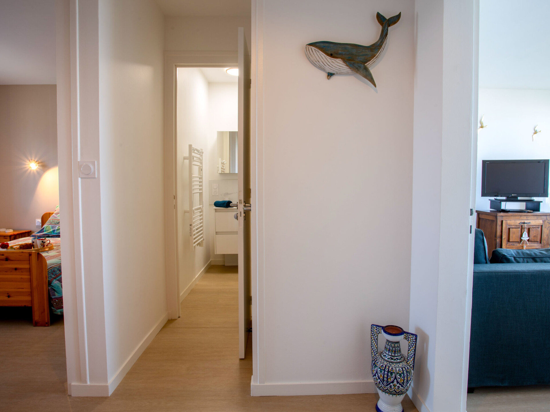 Appartement 3-kamers 59 m2 op de 1e verdieping, op het westen gelegen. Zeer mooi ingericht: woon-/eetkamer met TV (Flatscreen TV). Uitgang naar het balkon, op het westen. 1 kamer met 1 2-pers bed (1 x 140 cm, lengte 190 cm). 1 kamer met 1 bed (90 cm, lengte 190 cm). Kleine keuken (oven, 2 keramische glas kookplaten, broodrooster, waterkoker, diepvriezer, elektrische koffiemachine). Uitgang naar de loggia. Douche, aparte WC. Elektrische verwarming. Balkon 12 m2, op het westen gelegen. Balkonmeubilair. Zeer mooi panoramazicht op de oceaan. Ter beschikking: wasmachine, strijkijzer, haardroger. Internet (WiFi, gratis). Parkeerplaats (omheind, 1 Auto). Niet rokers woning. Maximaal 1 klein huisdier/hond toegestaan. Rookmelders, geen lift. Aanbod door een particulier volgens art. 155, IV van CGI.