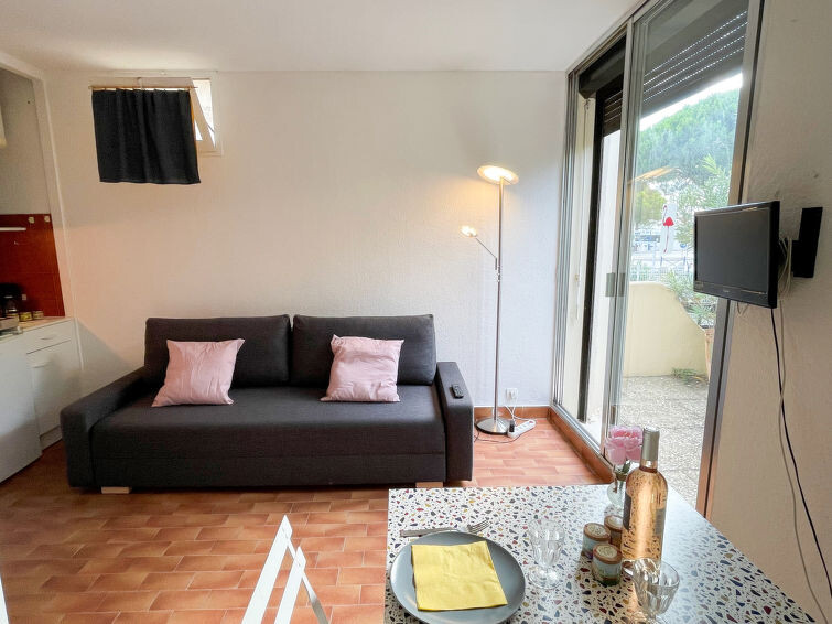 Studio 1-kamer 18 m2, op de begane grond. Woon-/eetkamer met 1 2-pers divanbed (140 cm, lengte 180 cm), TV. Kookhoek (2-pits kookplaat, magnetron). Douche/WC. Elektrische verwarming. Terras 15 m2, op het zuiden gelegen en op het westen gelegen. Terrasmeubelen. Parkeerplaats. Rookmelders.