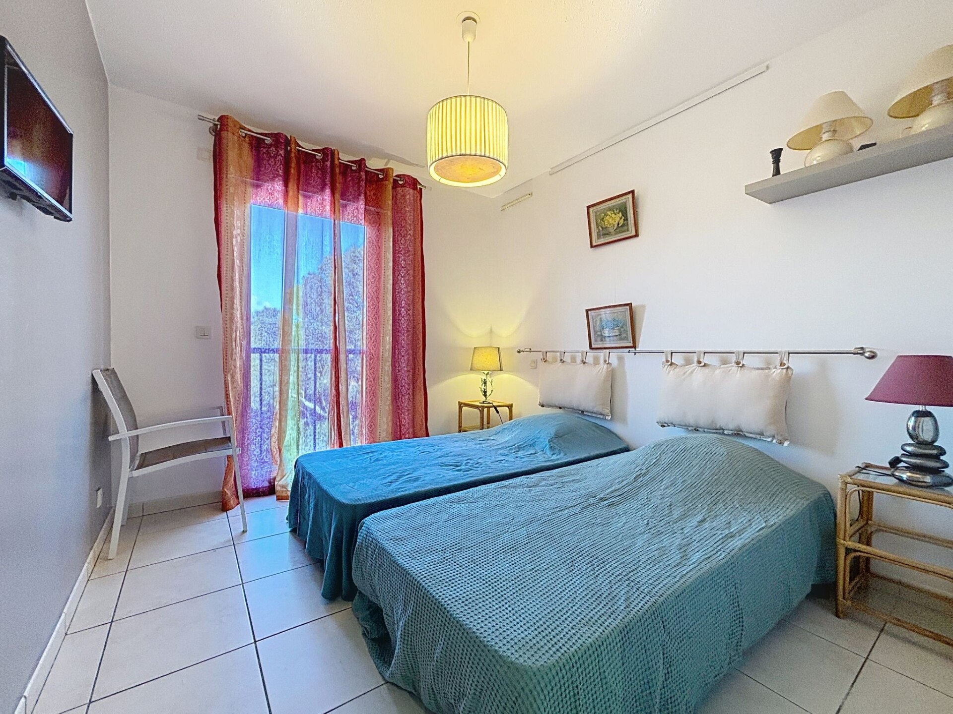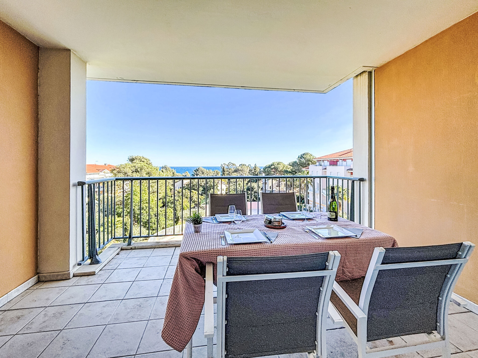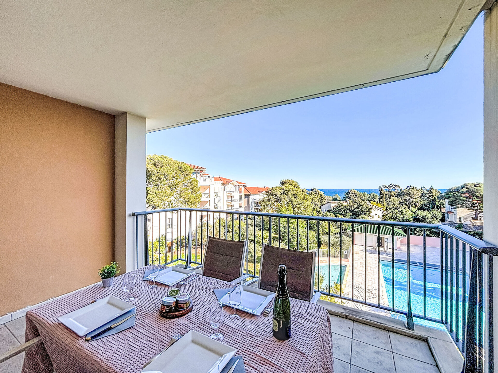 Appartement 3-kamers 79 m2 op de 3e verdieping. Comfortabel en modern ingericht: woon-/eetkamer met panoramavenster met TV (Flatscreen TV), DVD en elektrische rolluiken. Uitgang naar het terras. 1 kamer met 1 2-pers bed (1 x 140 cm, lengte 190 cm), douche. 1 kamer met 2 bedden (90 cm, lengte 190 cm). Groot keuken (afwasmachine, 4 keramische glas kookplaten, broodrooster, waterkoker, diepvriezer, elektrische koffiemachine, pads voor de koffiemachine (Nespresso), combimagnetron). Uitgang naar het balkon. Douche, aparte WC. Air-conditioning. Balkon 8 m2, op het noorden gelegen terras 12 m2, op het zuidoosten gelegen. Terrasmeubelen. Mooi uitzicht op zee, het zwembad en de tuin. Ter beschikking: wasmachine, strijkijzer, haardroger. Internet (WiFi, extra). Garage nr. 34, hoogte 190 cm, breedte 230 cm. Geschikt voor families. Maximaal 1 huisdier/hond toegestaan. TV alleen FR. Rookmelders. Aanbod door een particulier volgens art. 155, IV van CGI. GOARHM